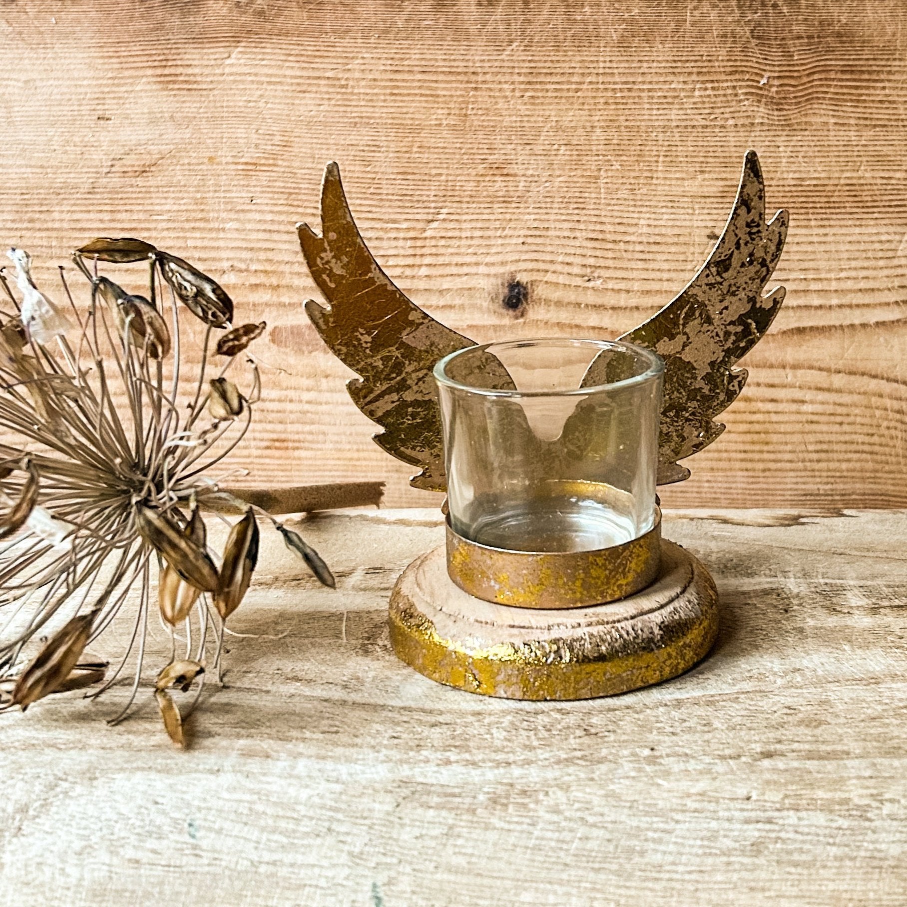 The gold wood and metal combination, along with the glass candle holder, ensures durability while enhancing the overall aesthetic. The warm glow of a candle reflects gently through the angel wing cut-outs, casting an enchanting light. This timeless design is perfect for creating a cosy, inviting atmosphere, making it an ideal accessory for your living room, bedroom, or even a special gift for a loved one.