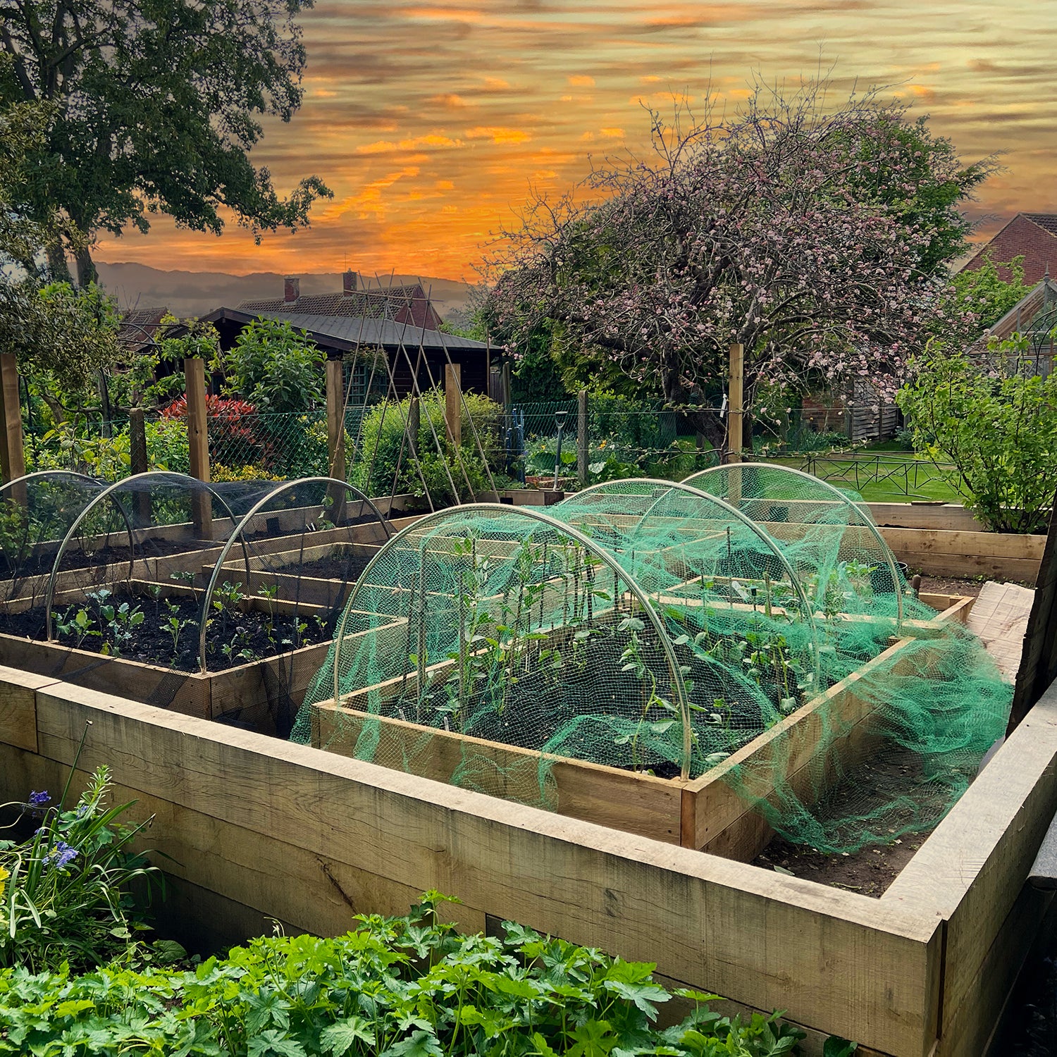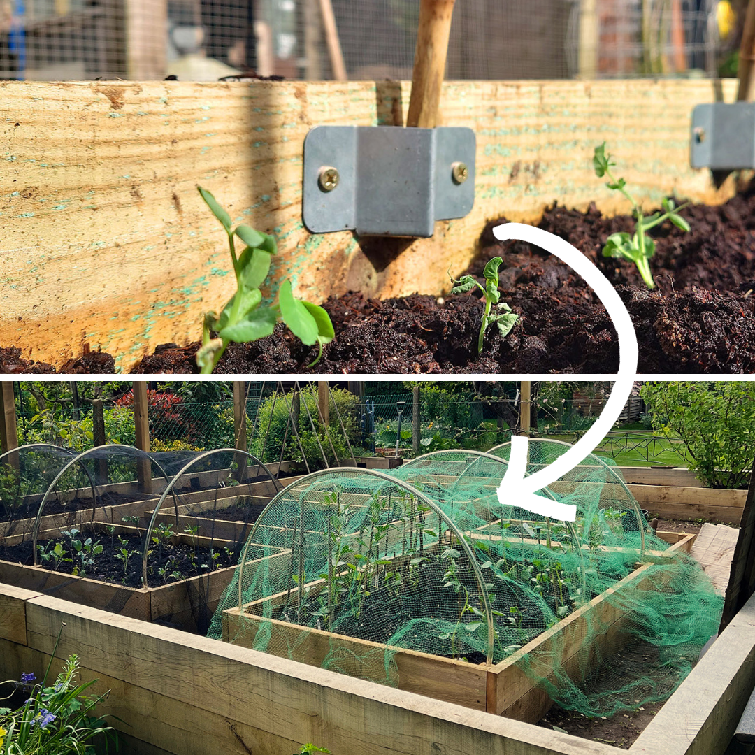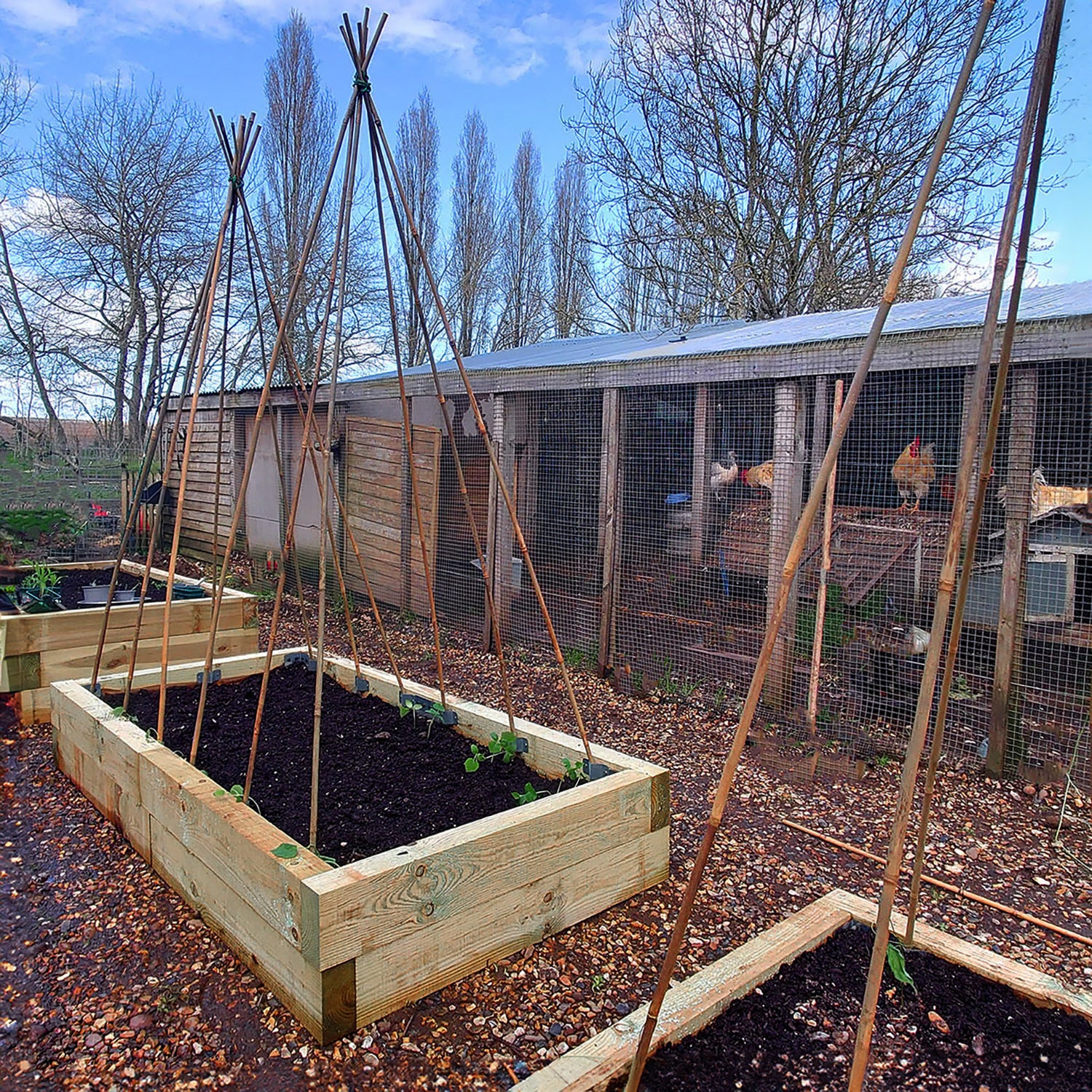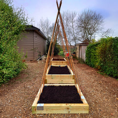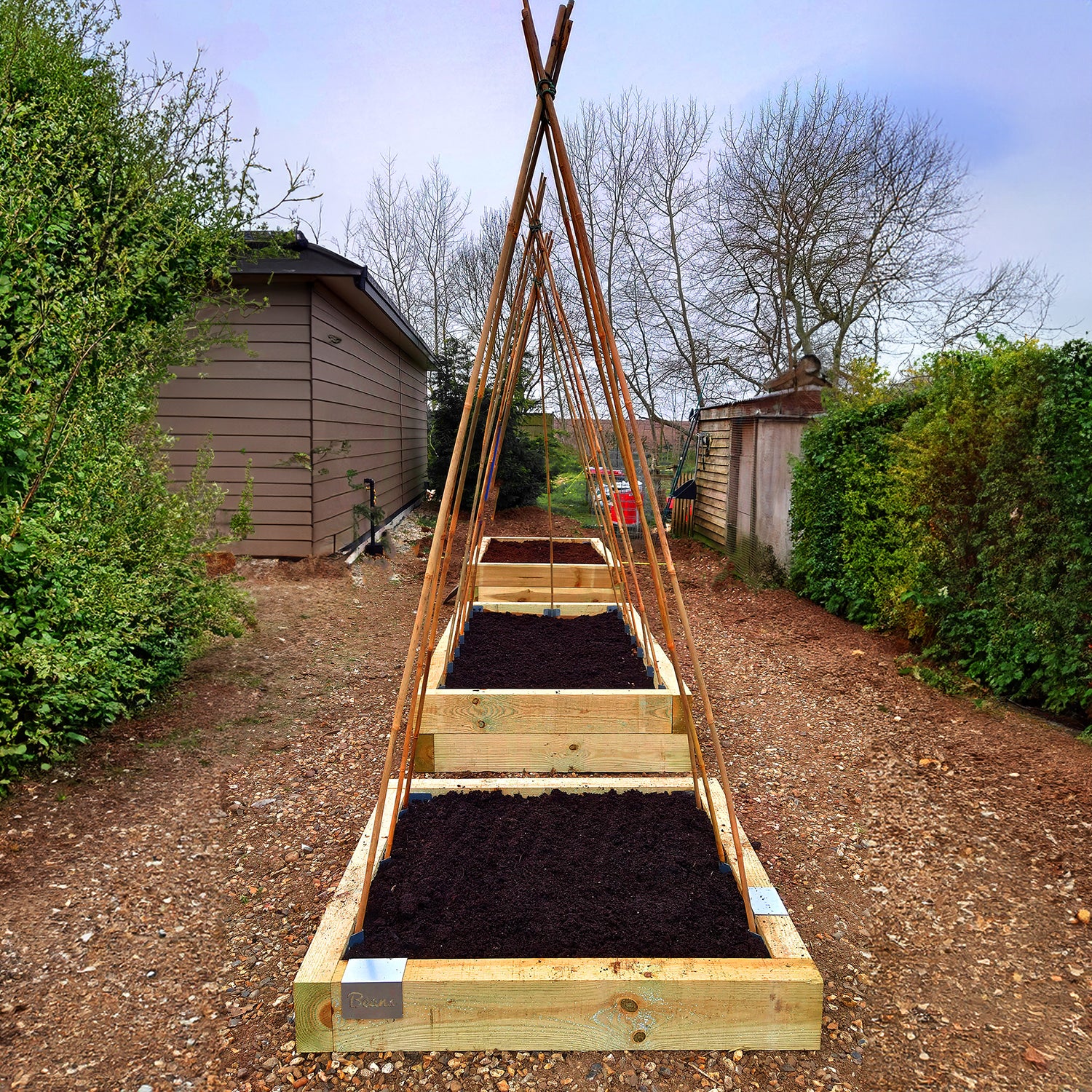 In the images, we have used 7ft bamboo canes, screwed the supports to the inner wood of the planter, and simply slotted the bamboo canes into each bracket. From there, we have bent the wood at the top and tied them together to allow our beans to grow easily.