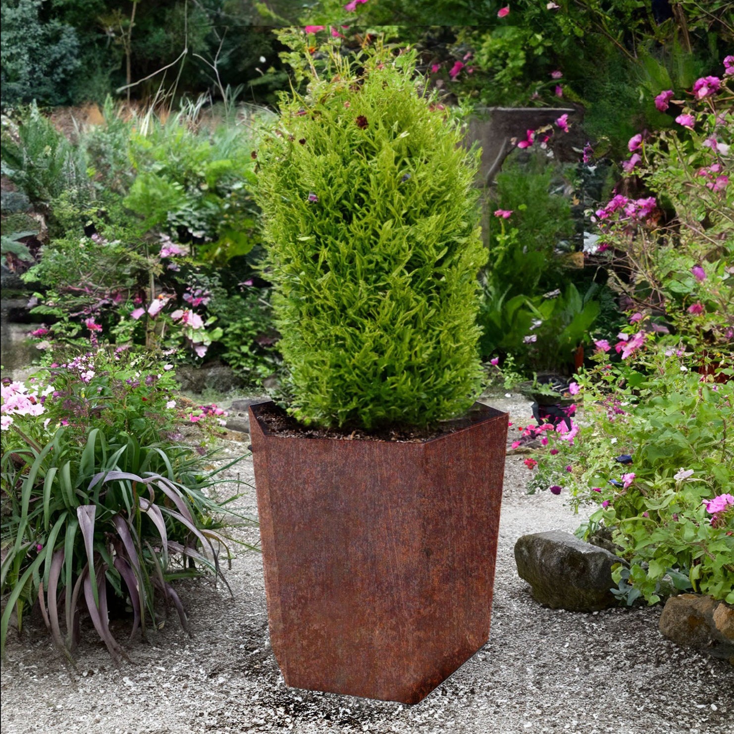 When your Bellamy planter arrives, it will be delivered in a bare steel finish. Over time, as nature takes its course, the steel will gracefully develop a beautiful rusty patina, adding character and depth to your planter. This ageing process not only enhances the rustic charm but also creates a unique visual narrative, reflecting the passage of time and the ever-changing seasons.