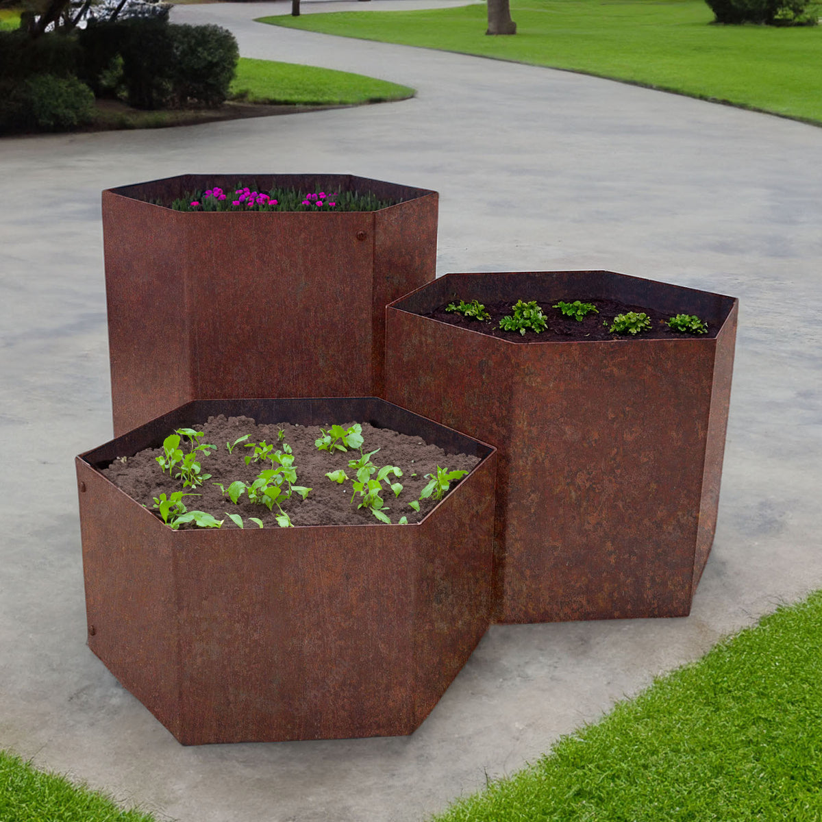 Invite the charm of a rustic aesthetic into your outdoor oasis with the Bellamy Hexagon-Shaped Rustic Steel Planter. Its timeless design, combined with the evolving patina, will create a captivating focal point that effortlessly complements your plants and stones. Be prepared to witness the allure of this planter as it becomes a statement piece in your garden, attracting not only admiration but also the buzzing presence of bees drawn to its honeycomb-inspired arrangement.