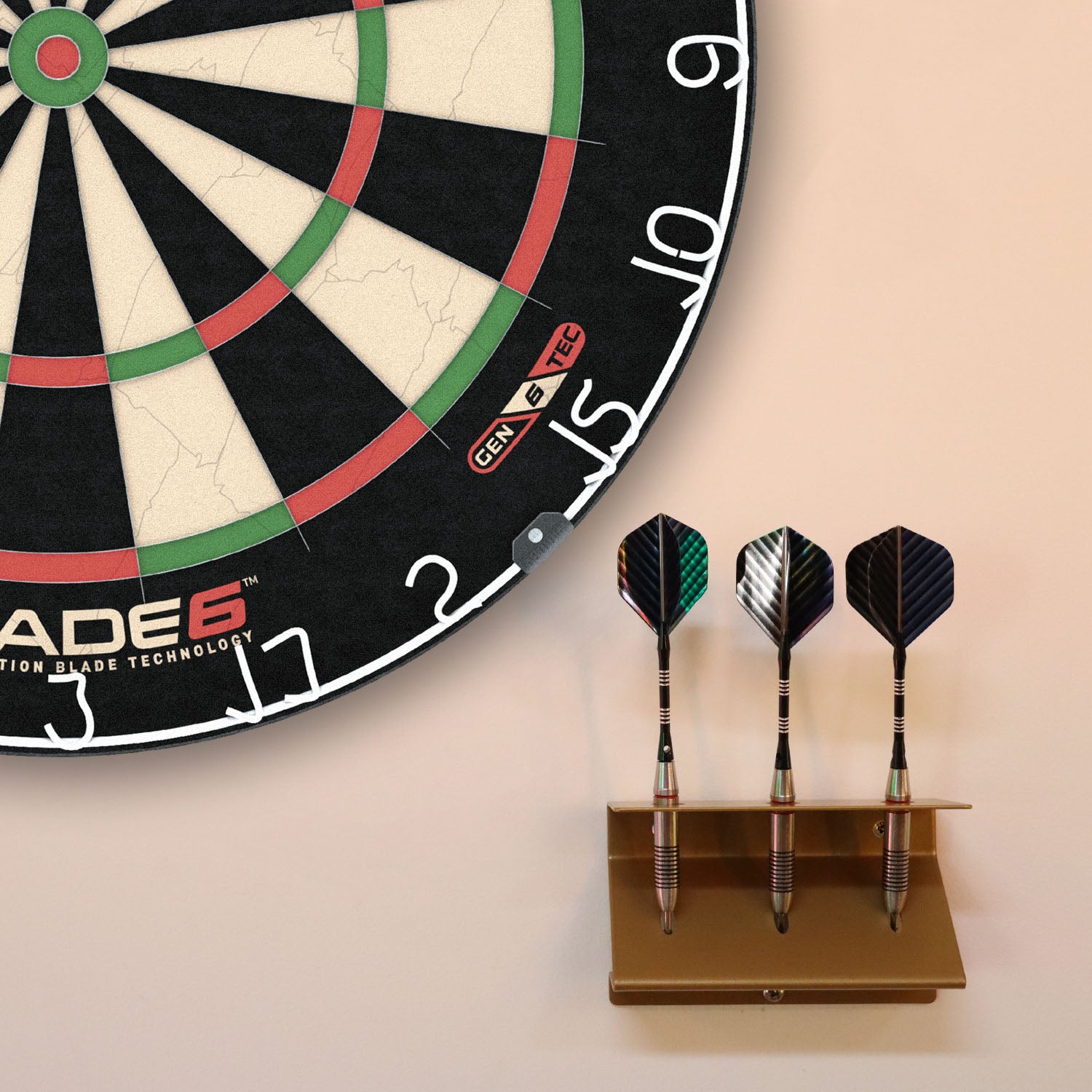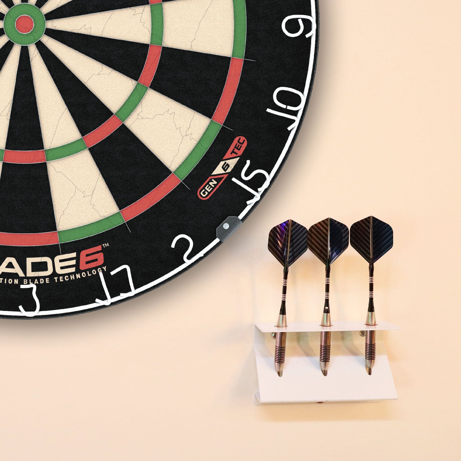 Designed to hold three darts at once, the bracket includes smartly shaped holes to keep each dart in place without damaging the flights. The top hole measures 12mm across to support the barrel, while the 5mm x 12mm oval slot below allows for angled placement. This makes it easy to grab your darts and return them after each round.