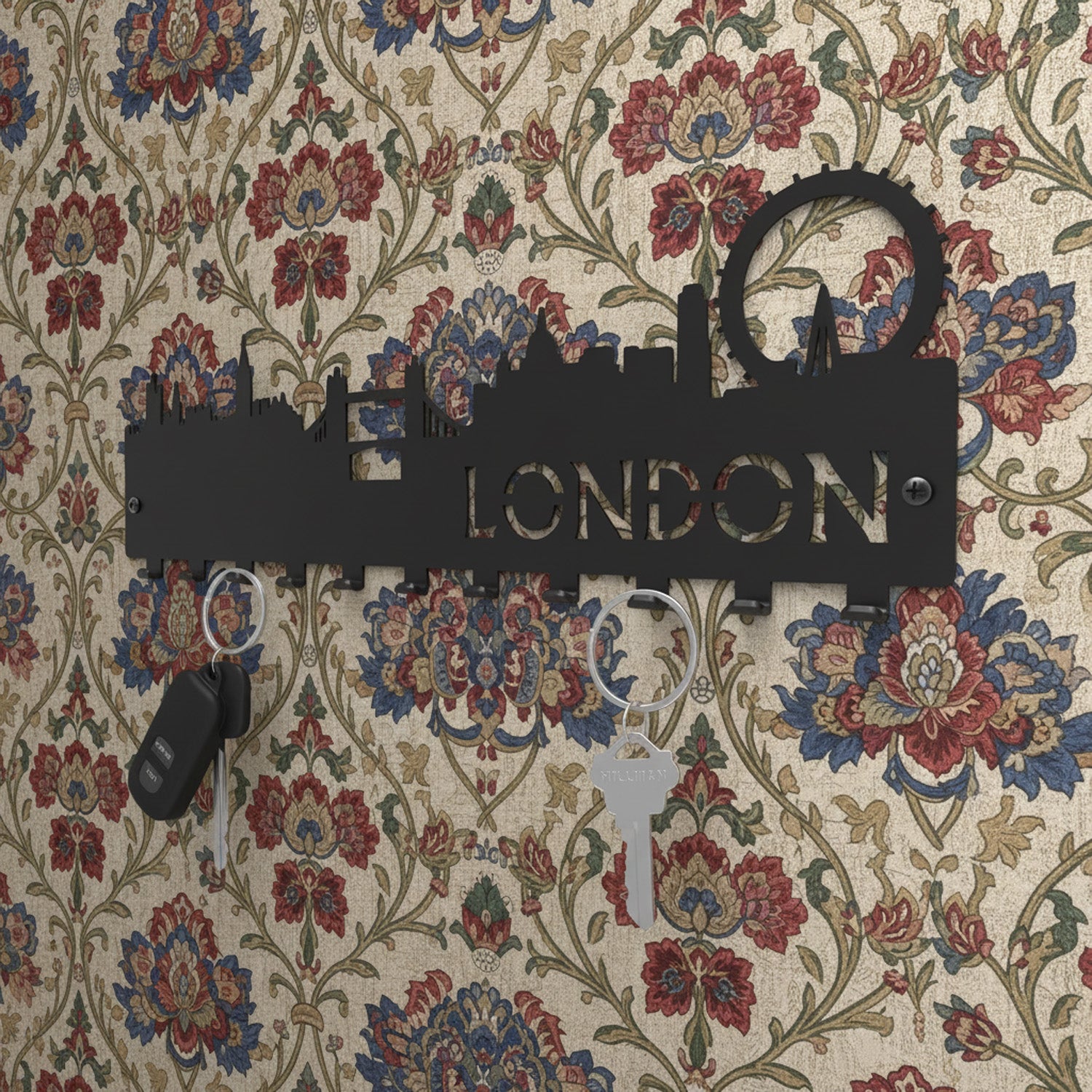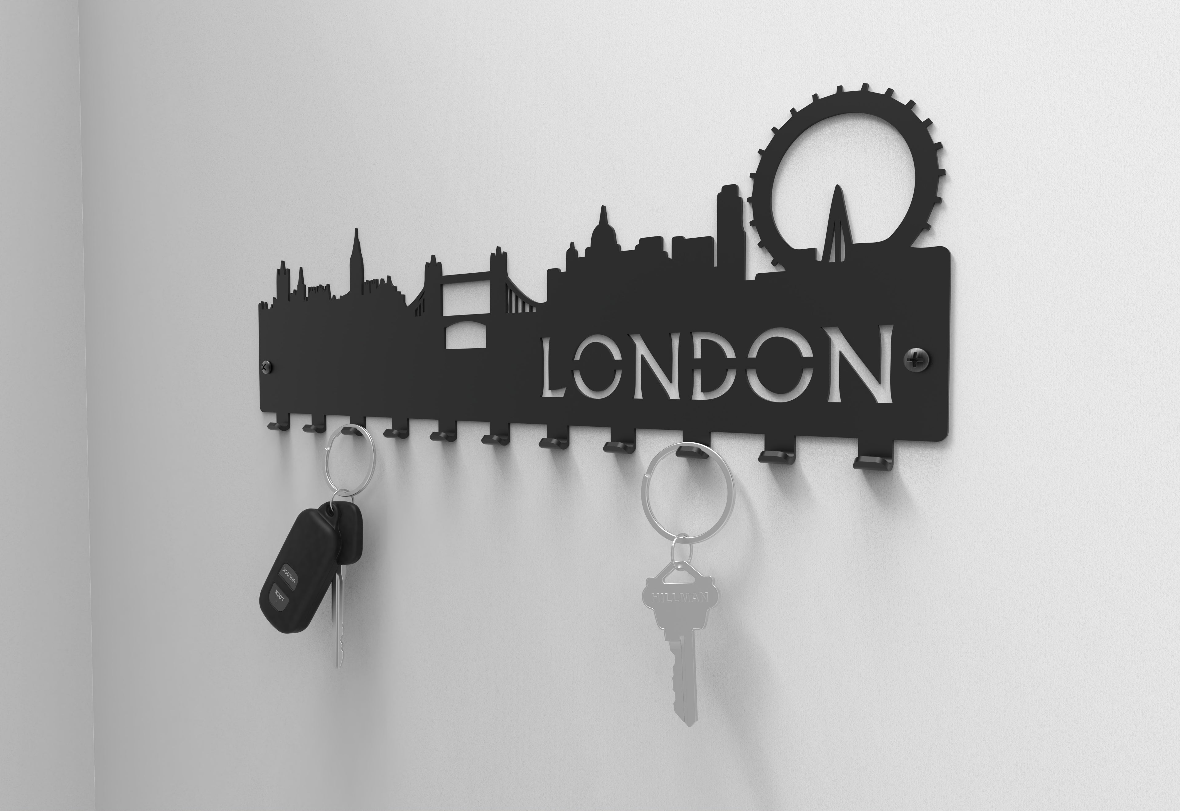 This key holder rack is styled after the iconic skyline of London. Drawn in a silhouette style, famous buildings and landmarks can be seen. The silhouette cityscape includes: The Houses of Parliament, Big Ben, Tower Bridge, St Paul's Cathedral and the London Eye. The name "London " is cut out of the front in a beautiful serif font.