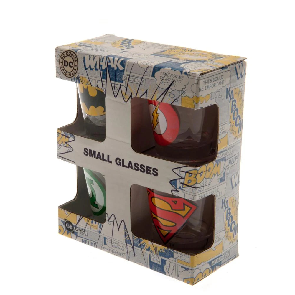 Set of 4 Glasses: This set includes four small glasses, each adorned with its own unique DC Comics logo. Whether you're sipping solo or sharing with friends, these glasses add a touch of superhero flair to any gathering.
