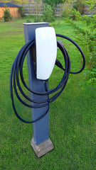 The cables can be installed to drop through theEV Car Charger Mounting Pedestal, with the top panel ensuring that the cables are protected from rain and weather. The cables can drop through and then be installed directly into the ground through trenching, or through one of our unique concrete base mounts. The front plate of the EV Car Charger Mounting Pedestal is left blank without any holes, allowing you to drill holes to match the mounting pattern of your EV Charger.