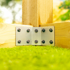 We offer 3 different sizes of bracket, based on the most popular sizes of wood on the UK market. There are versions available for 3", 4" and 6" timber. There will be 10, 7.5mm screw holes on the bracket. 4 of these will be for screwing the bracket into each piece of timber and the other 2 provide support when drilling into the posts on the corners. These are suitable for use with any timber fixing screws, we recommend our SleeperFit Black Timber Railway Screws.