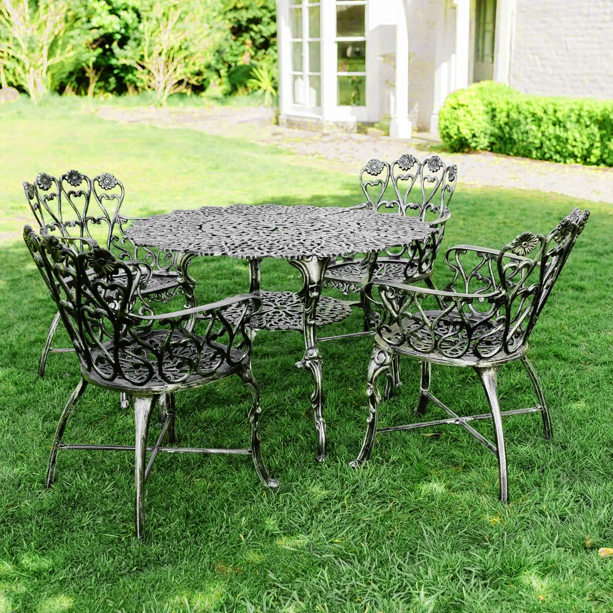 The set is made from aluminium with a tasteful silver finish. The table set exudes elegance and sophistication. The set features a table and 4 chairs. It can provide ample seating for four people. Perfect for enjoying meals or unwinding amidst the splendour of the great outdoors.