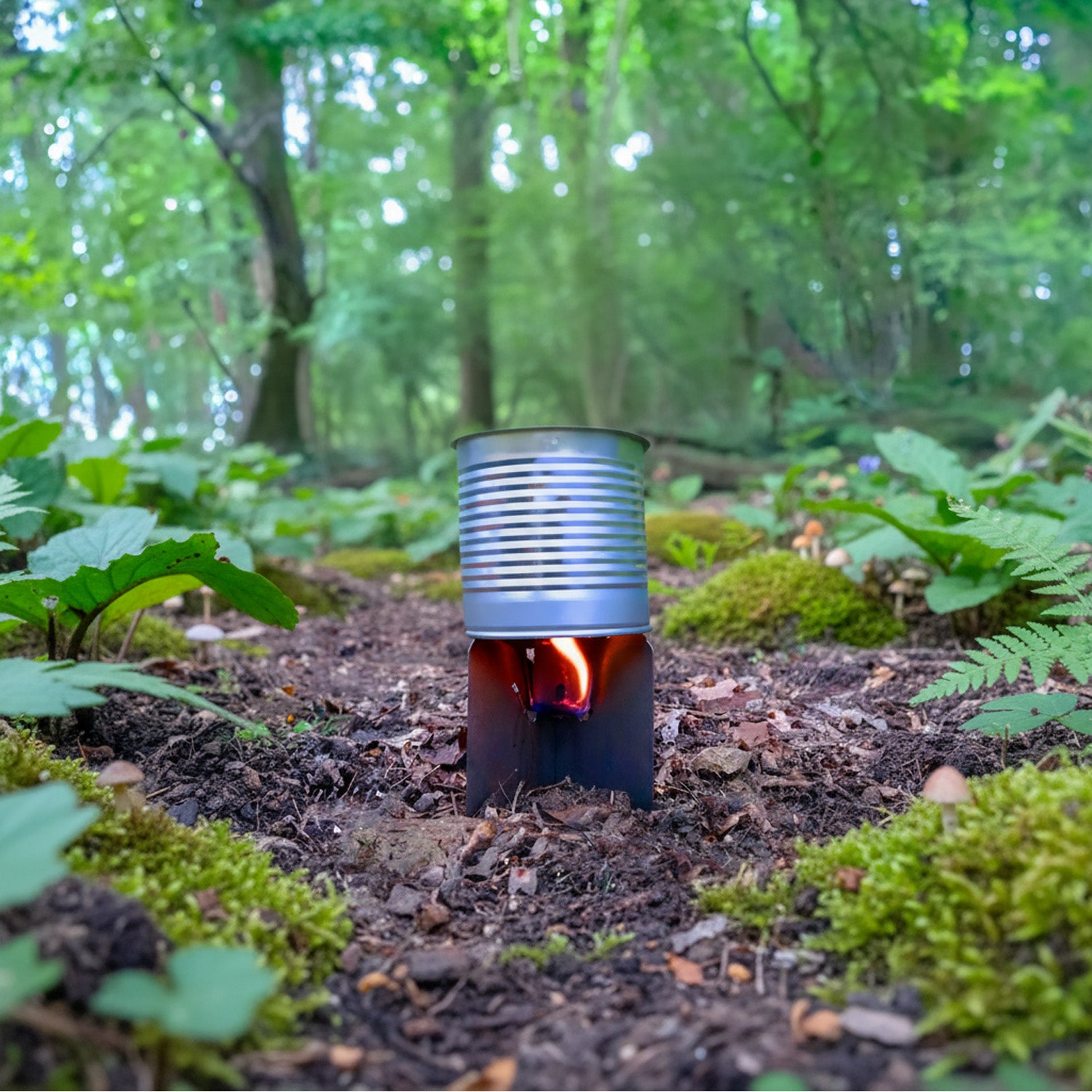 The size of the credit card stove is perfect for a tin when it is assembled. Assemble the stove, start a fire and add a tin of beans or spaghetti and let it cook!