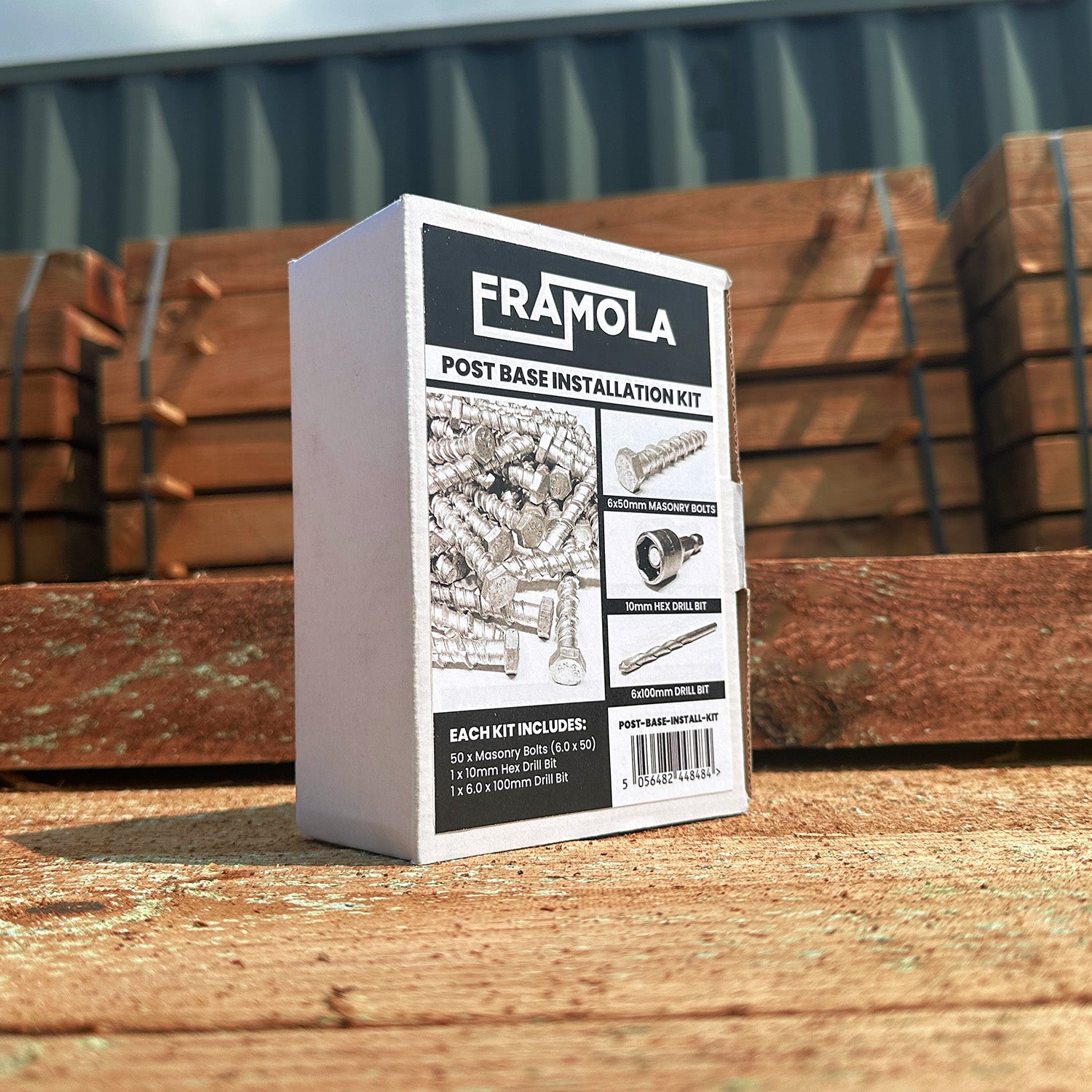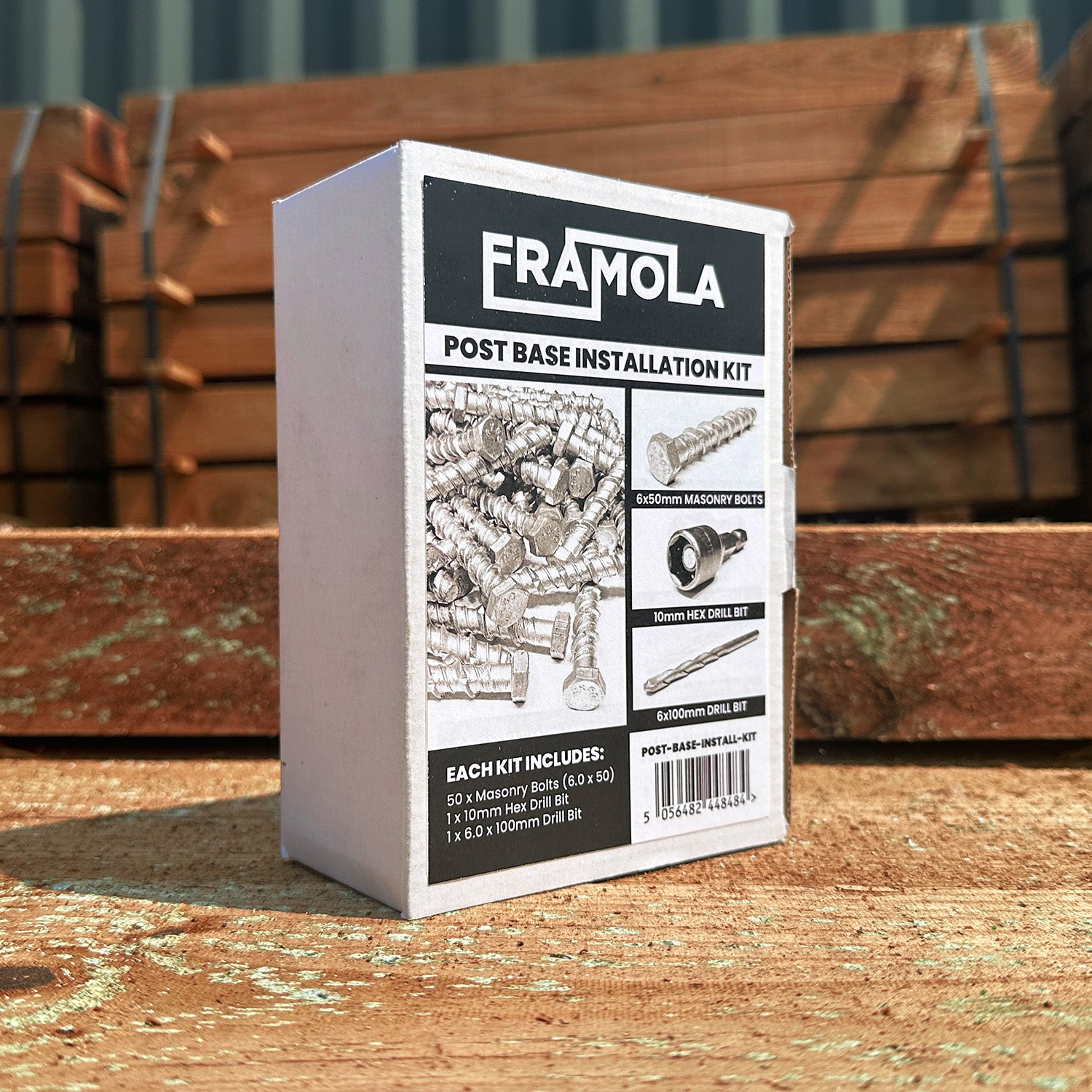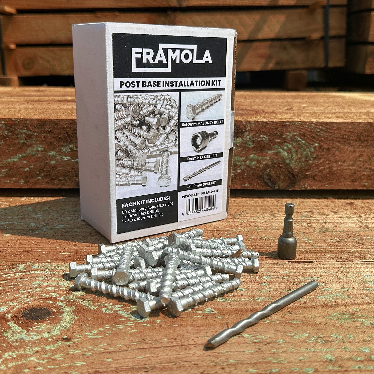 This handy kit makes the installation process Framola Post Bases easier than ever! No need to root around your shed or garage to hope you've got the right parts and fixings, this all-in-one kit can be used to install up to 12 Post Bases, whilst the drill bit and driver bit can be kept for a lifetime.