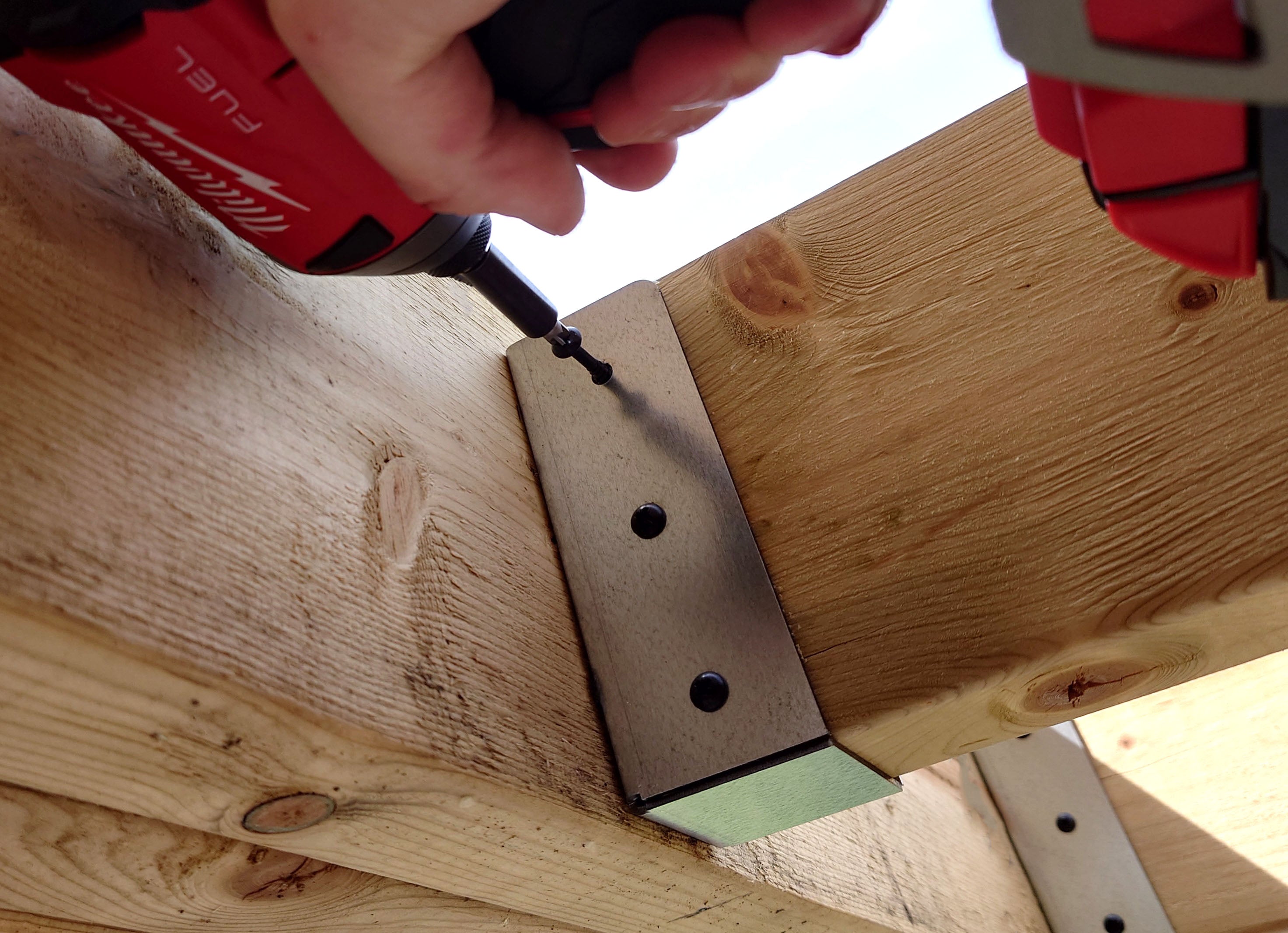 To install for a strong and hardwearing connection, screw the bracket to the timber using the 3 screw holes on the back of the bracket. Then slot the joist into the bracket and use the 2 or 3 screw holes on either side of the bracket to screw the bracket to the joist. The screws will not collide as the placement of the holes have been carefully considered to avoid any clashes internally.