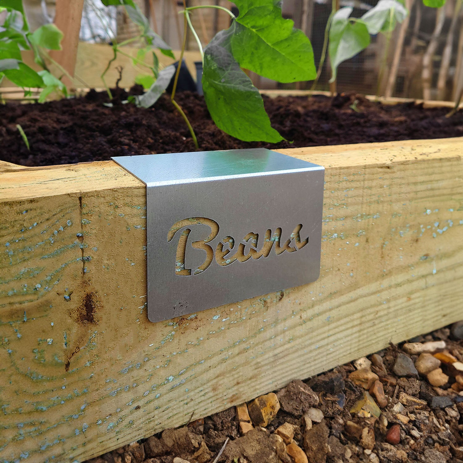 Once you have installed your SleeperFit LightGauge planter and added all of your seed for your veggie-growing adventures, just take one of these markers, write on it with a Sharpie or similar pen, and slot it over the edge. We also offer one that already says "Beans" in case you've decided to grow your own beans. We also have a custom option available where we can cut the lettering out for you in a similar style to the cut-out on the "Beans" option.