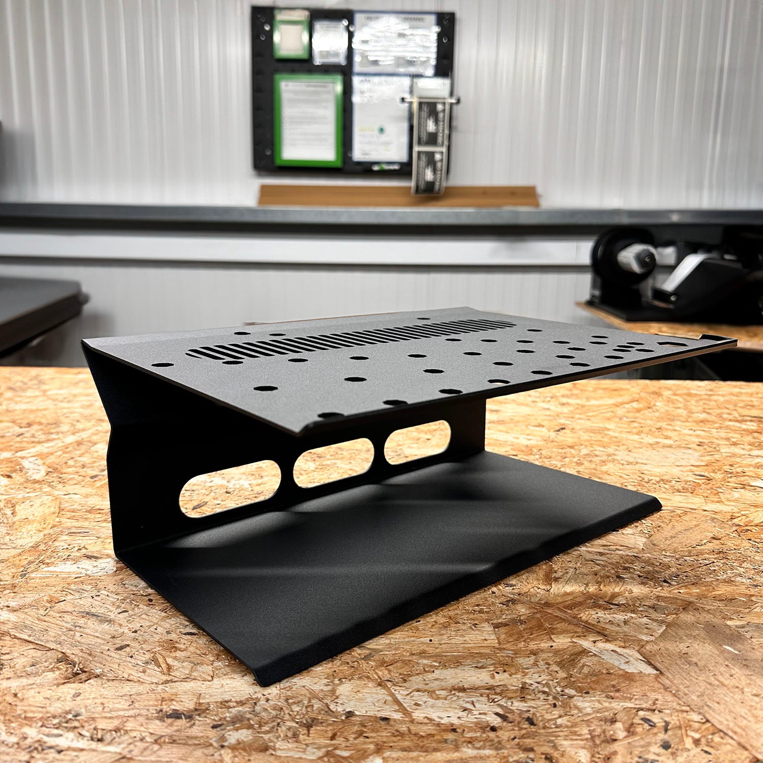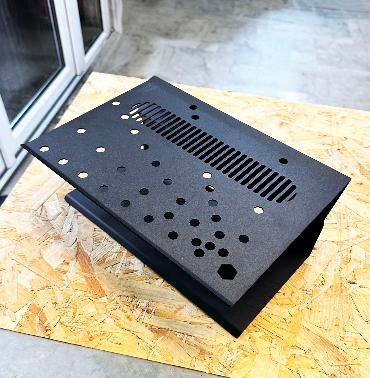 Each one is made from durable British Steel. This provides peace of mind that it can withhold the weight of your laptop without bending. The steel is expertly folded to ensure a strong design. We then powder-coat each one in a textured black coating for a stylish and sleek finish. The coating avoids showing large scratches so will still look good after frequent use.