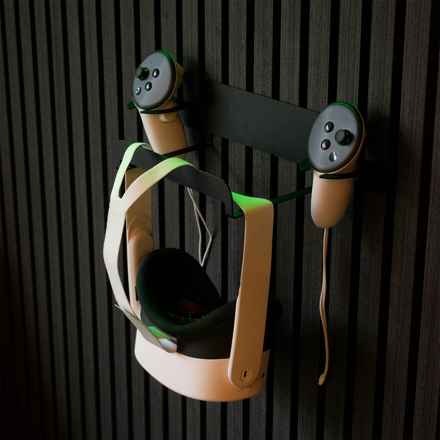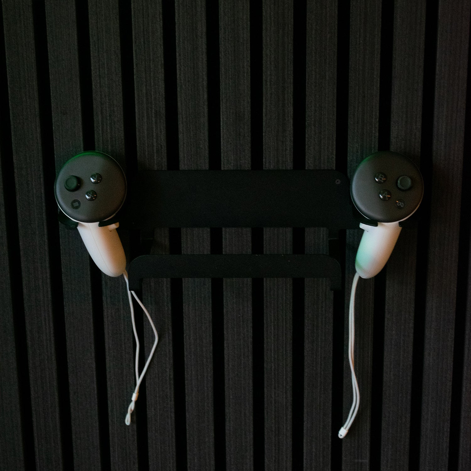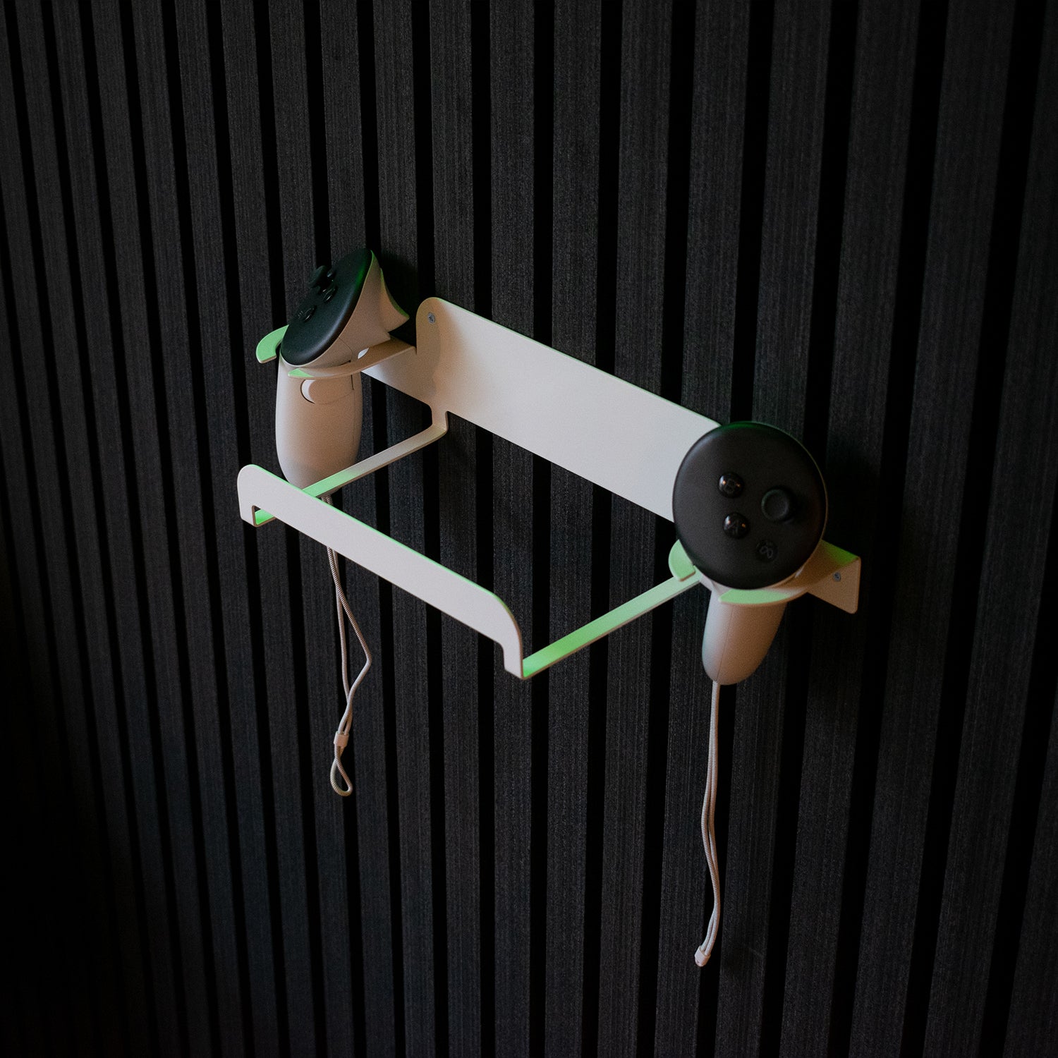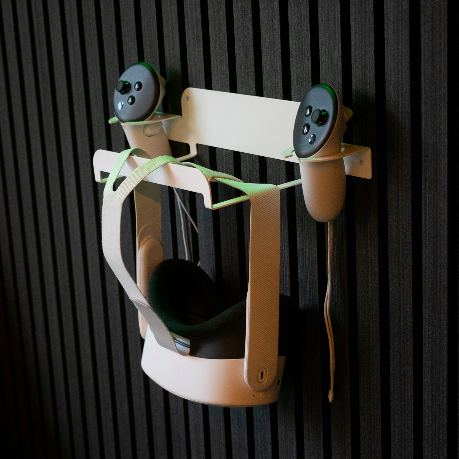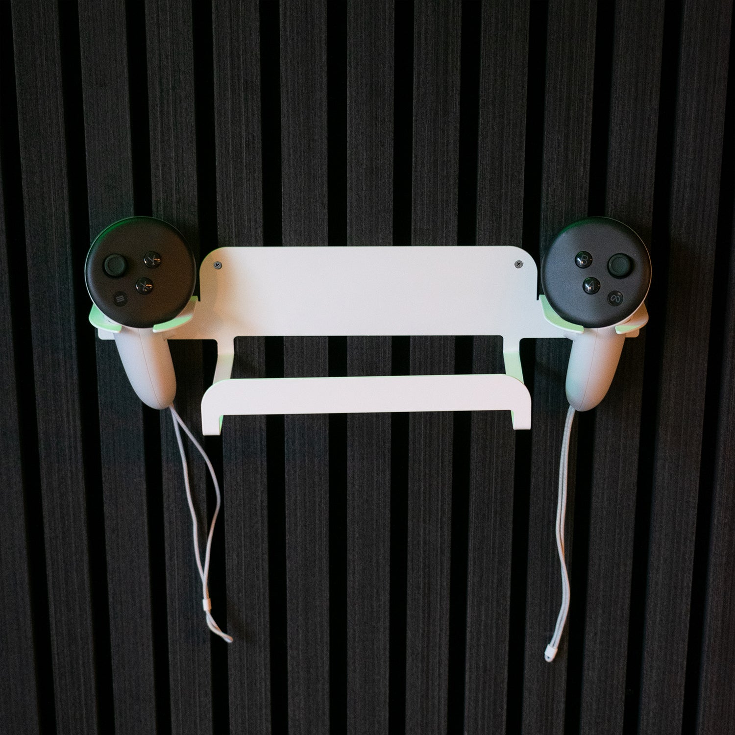 The thoughtfully crafted design includes slots for your Meta Quest controllers, allowing them to be held securely by the holes or hung via their wrist straps on the hook-like openings. The headset rests comfortably on the front hook, providing a stable and accessible storage point.