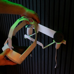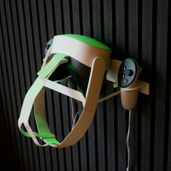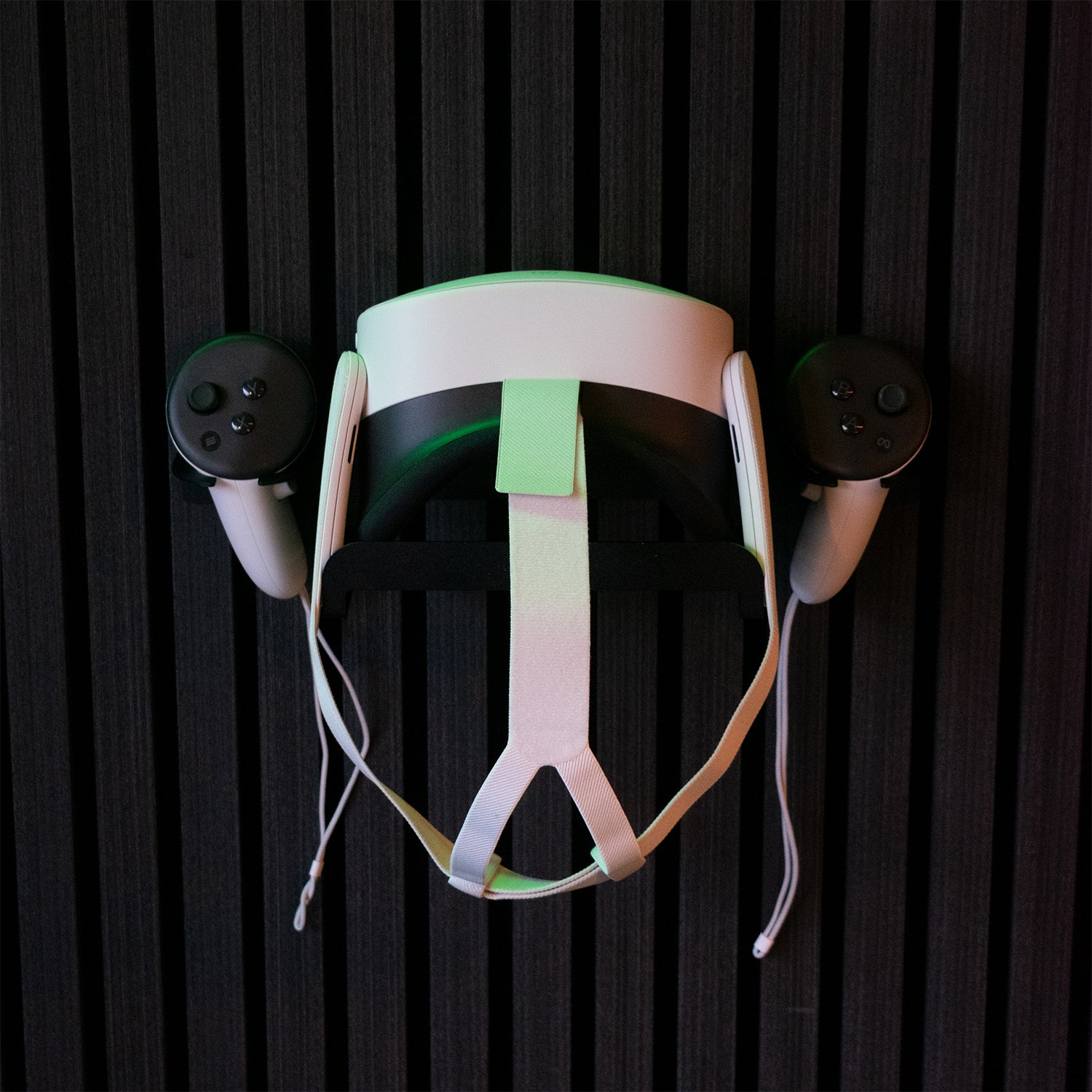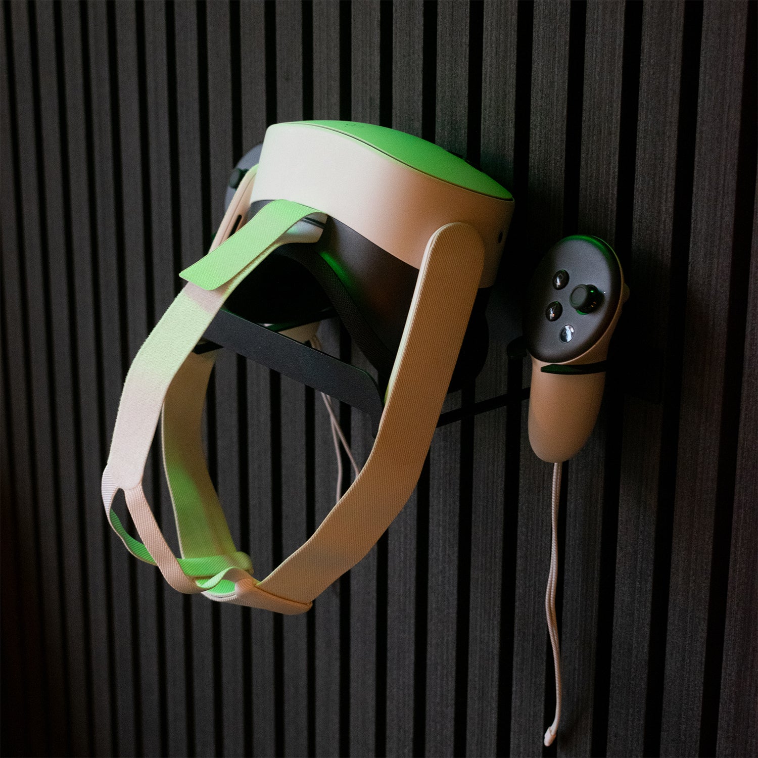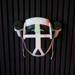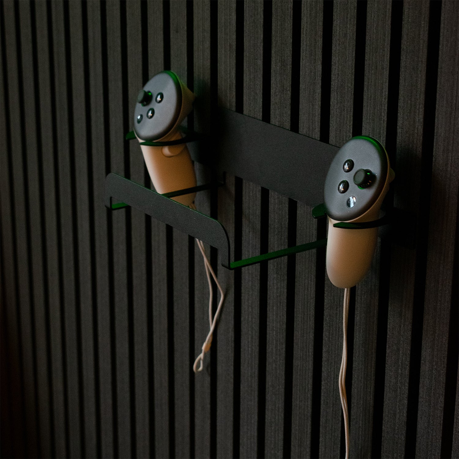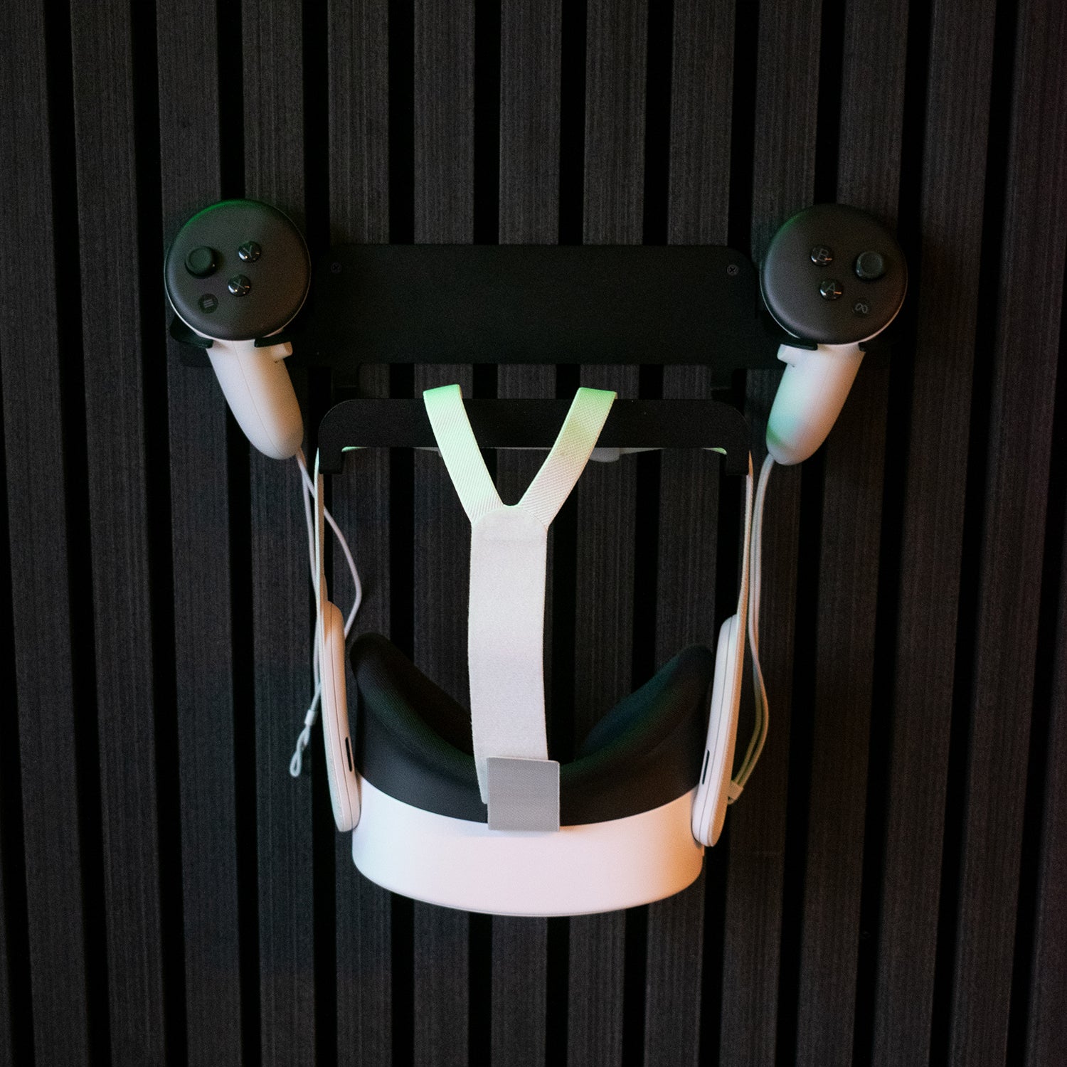 The thoughtfully crafted design includes slots for your Meta Quest controllers, allowing them to be held securely by the holes or hung via their wrist straps on the hook-like openings. The headset rests comfortably on the front hook, providing a stable and accessible storage point.