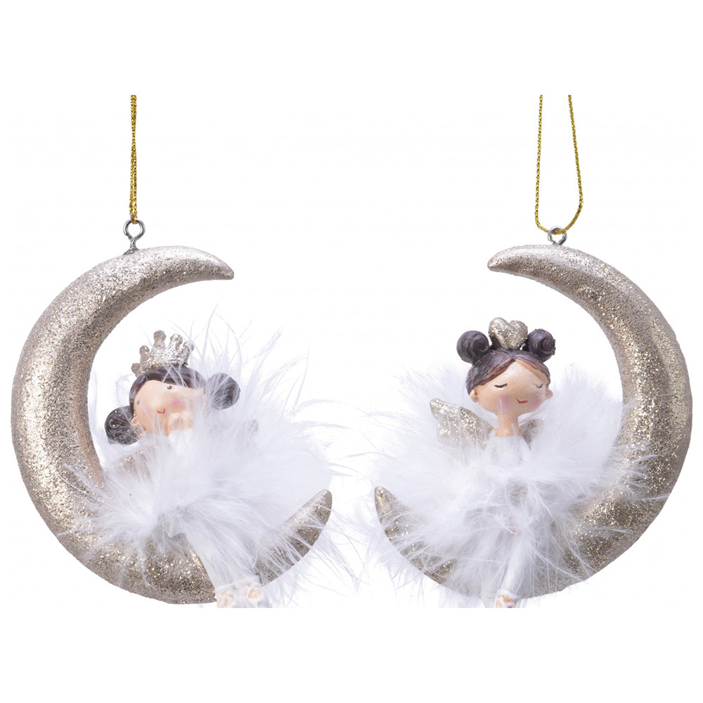 These Polyresin Hanging Glitter Angels on Moon Decorations bring a touch of whimsical charm and festive sparkle to your holiday decor. Each ornament features a delicate angel fairy with golden wings, seated gracefully on a glittery crescent moon. The fairy is adorned in a soft, faux fur skirt and is finished with a subtle dusting of glitter that catches the light beautifully, making it an eye-catching addition to any Christmas tree.