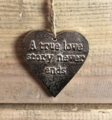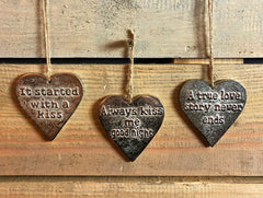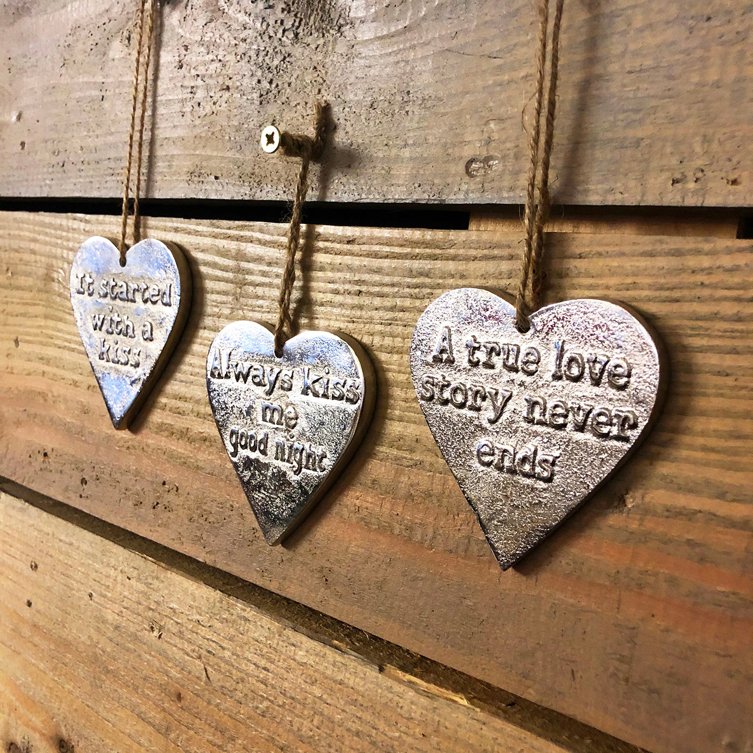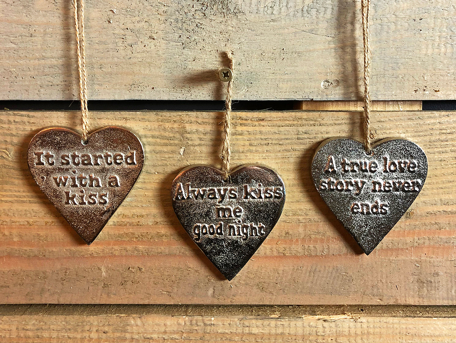Add a touch of romance to your home with these charming Hanging Heart Ornaments with Romantic Messages. Crafted from 100% aluminium, each heart features a textured, distressed finish that adds a unique, rustic charm to your decor. These heart ornaments are perfect as a thoughtful gift for a loved one or as a lovely addition to your own home.