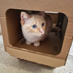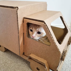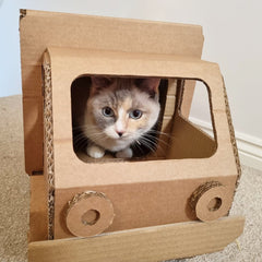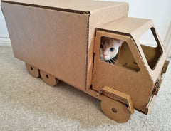 From Jake's Farm Yard comes the amazing, awesome Cardboard Cat Truck. A great enrichment toy for cats and other small animals, the cargo hold is spacious and allows cats to hide and play to their heart's content. You can see the amount of fun our models, Luna and Poppy are having hiding away in their truck!