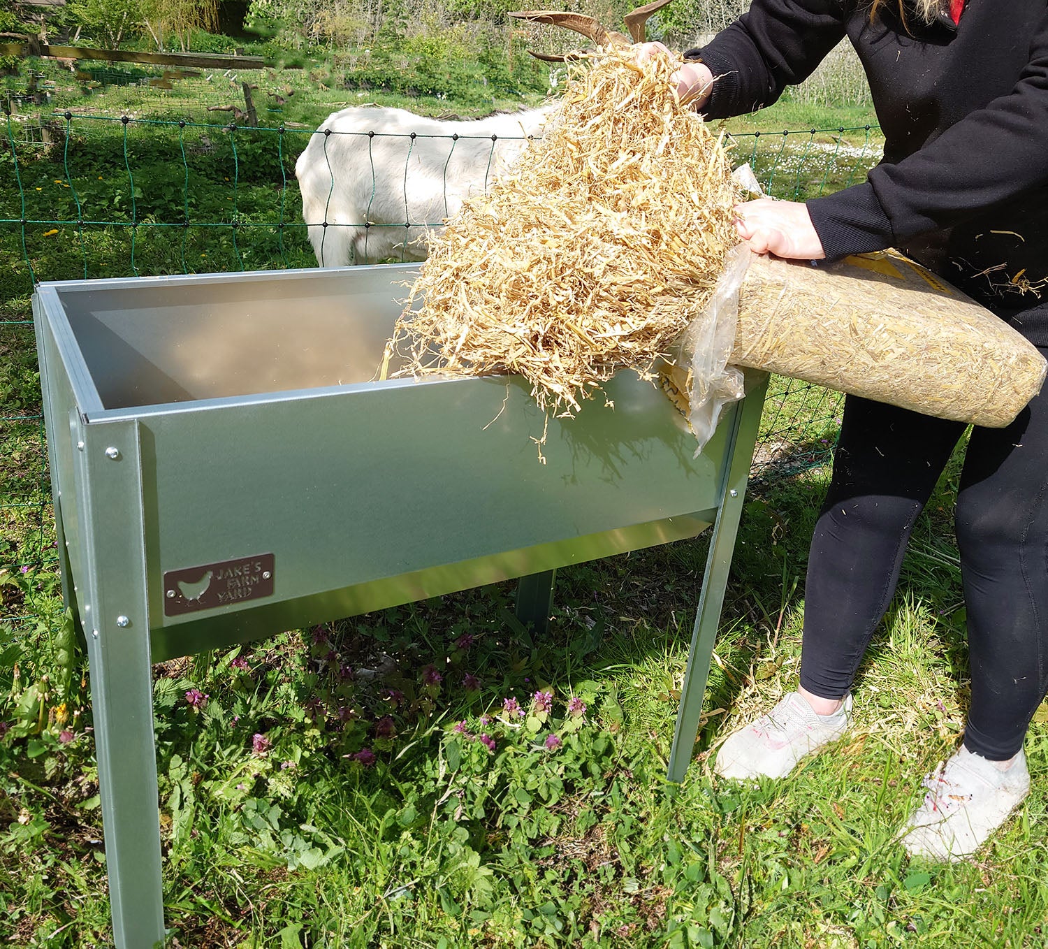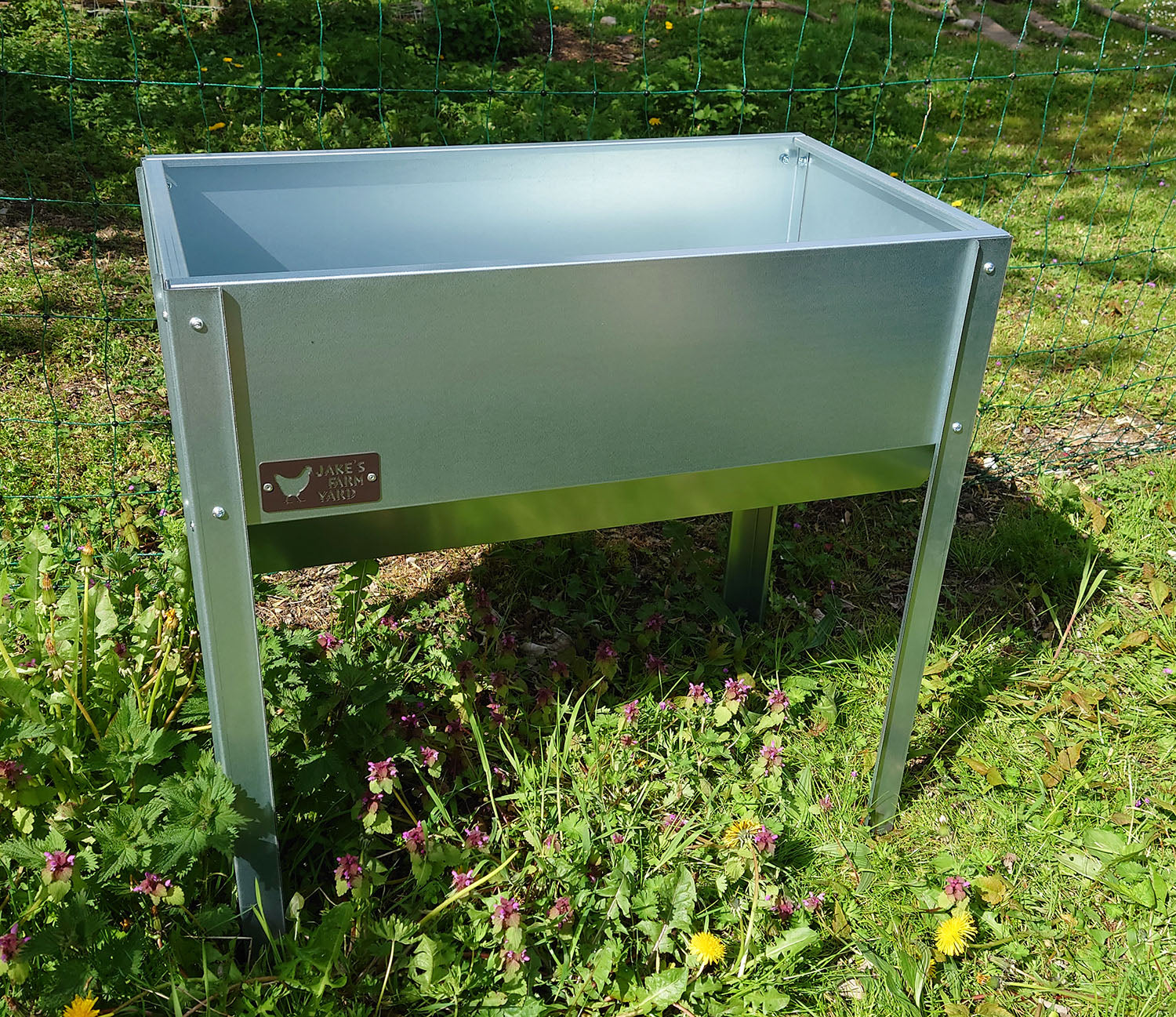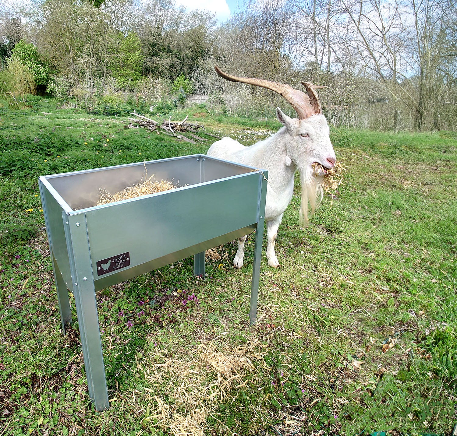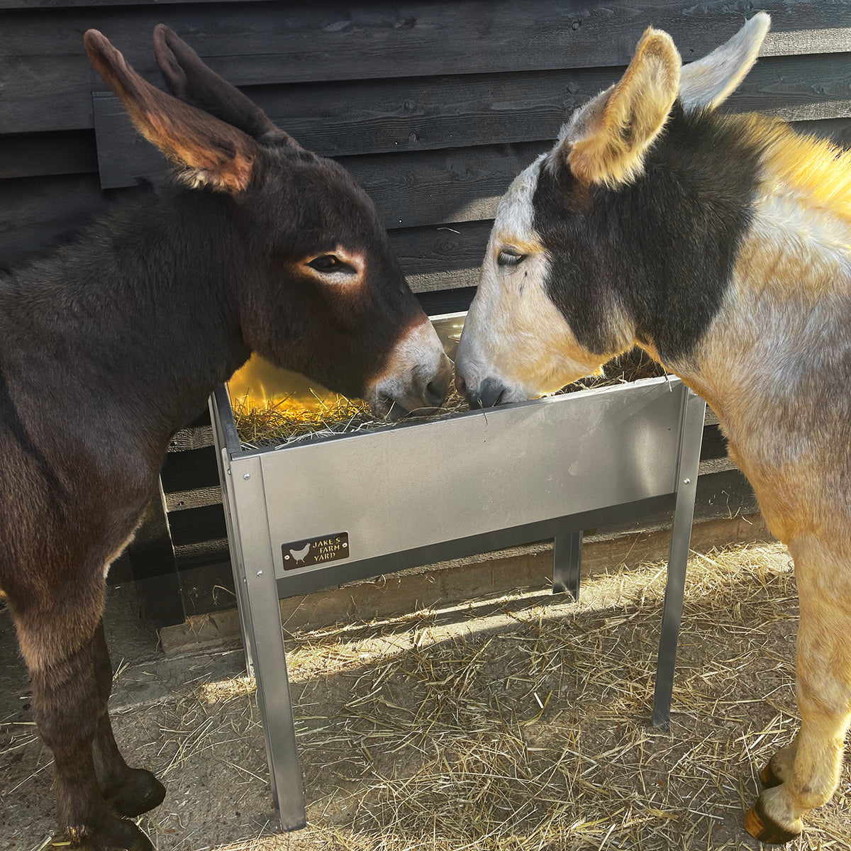 The side of the horse hay feeder features the Jake's Farm Yard logo in a chocolate brown colour which has been riveted onto the body.
