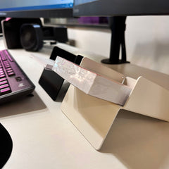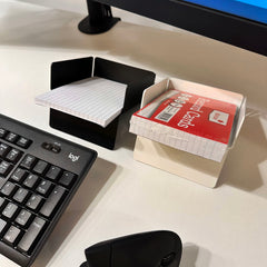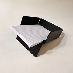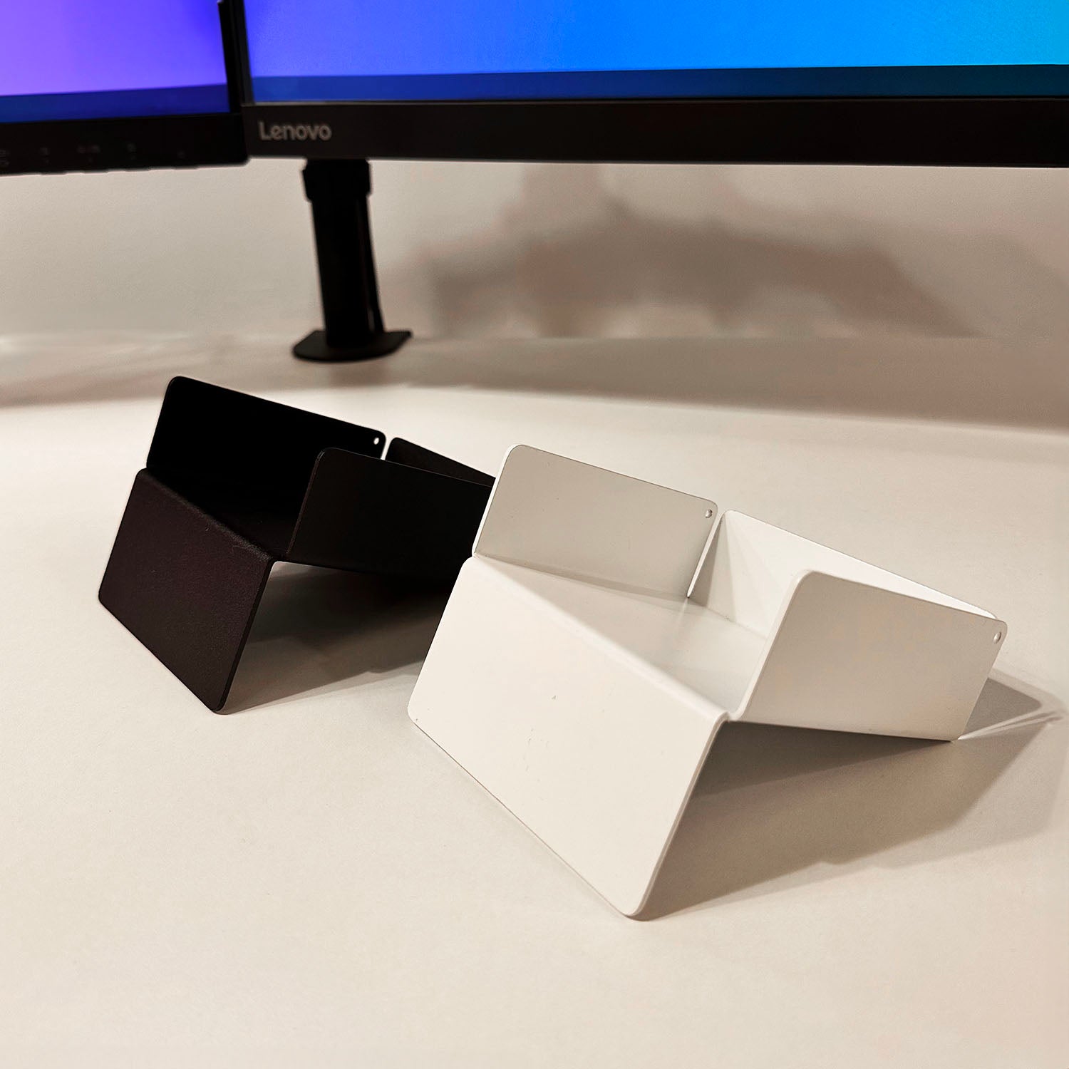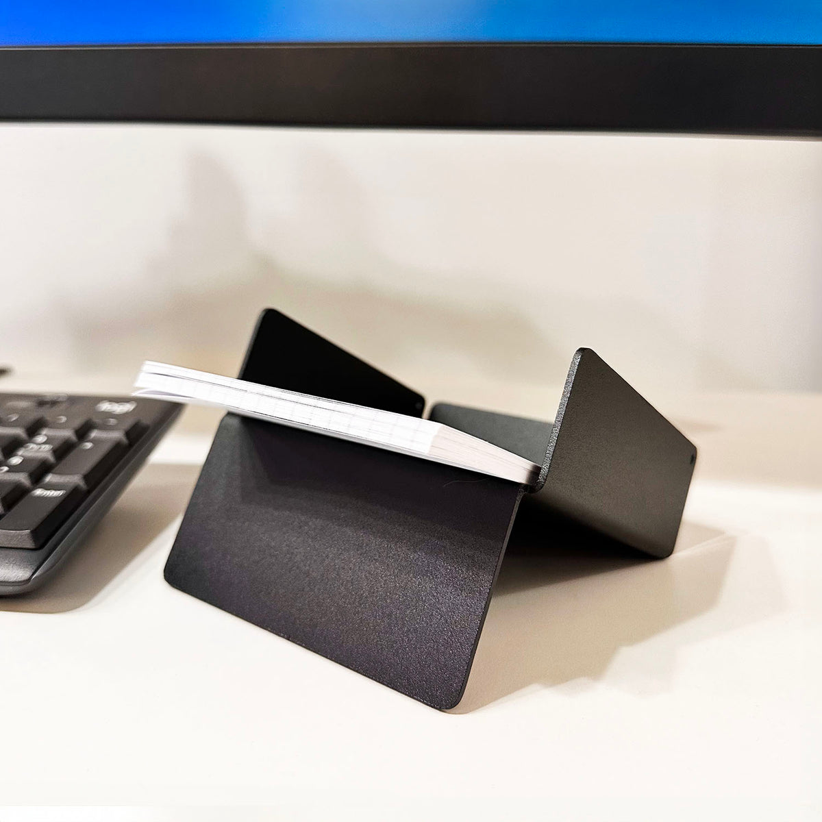 The holder sits at a slant, meaning that the cards can easily be grabbed from the holder. The three folded edges keep the paper in place with some wiggle room to allow you to refill it easily, without putting it in with precision. The holder sits on the desk on just two edges, giving it a sleek design.