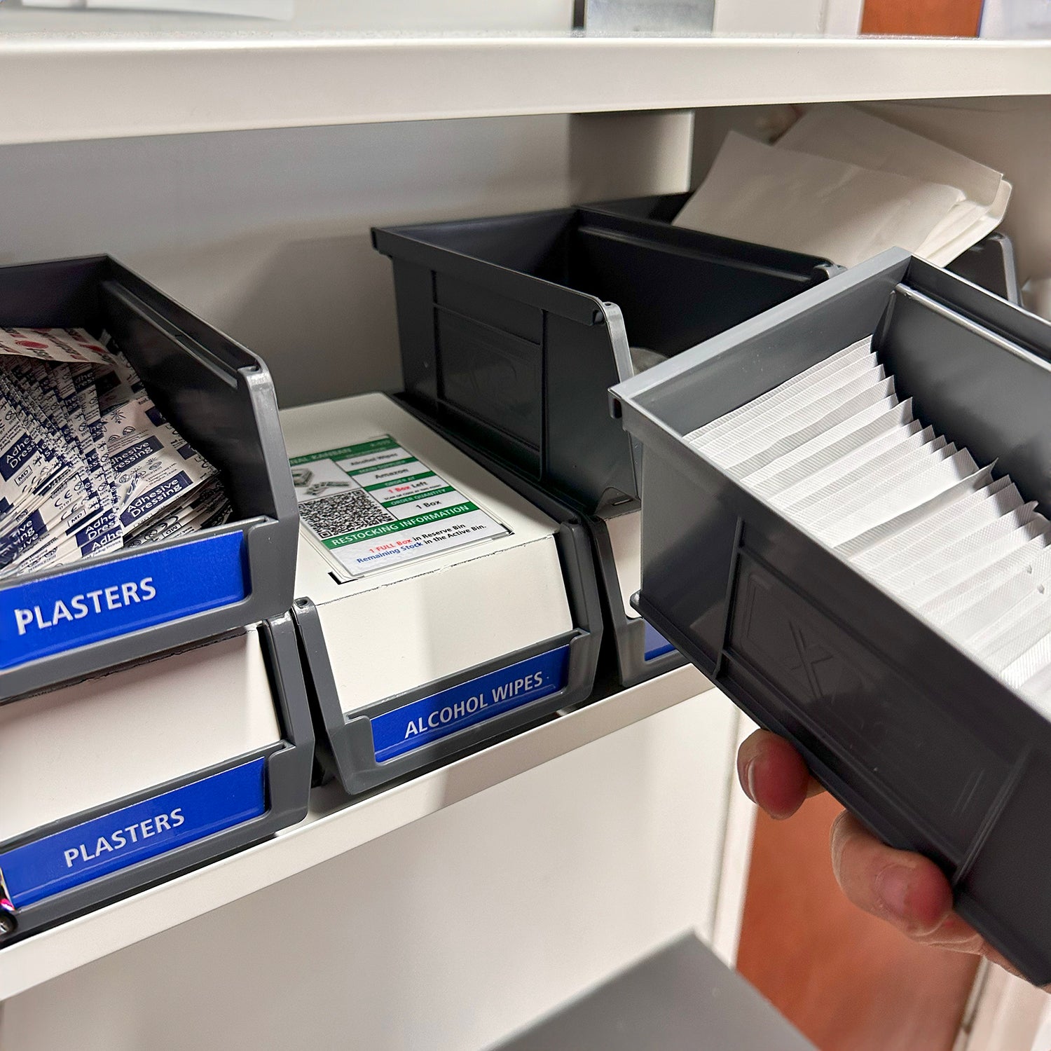 The box is empty inside to allow you to store your First Aid supplies in any fashion. We have used it in our factory using XL2 boxes stacked on top of one another. In this configuration, you can store up to 10 different types of item in XL2 Boxes, or 5 different types of items should you wish to do a 2-Bin System.