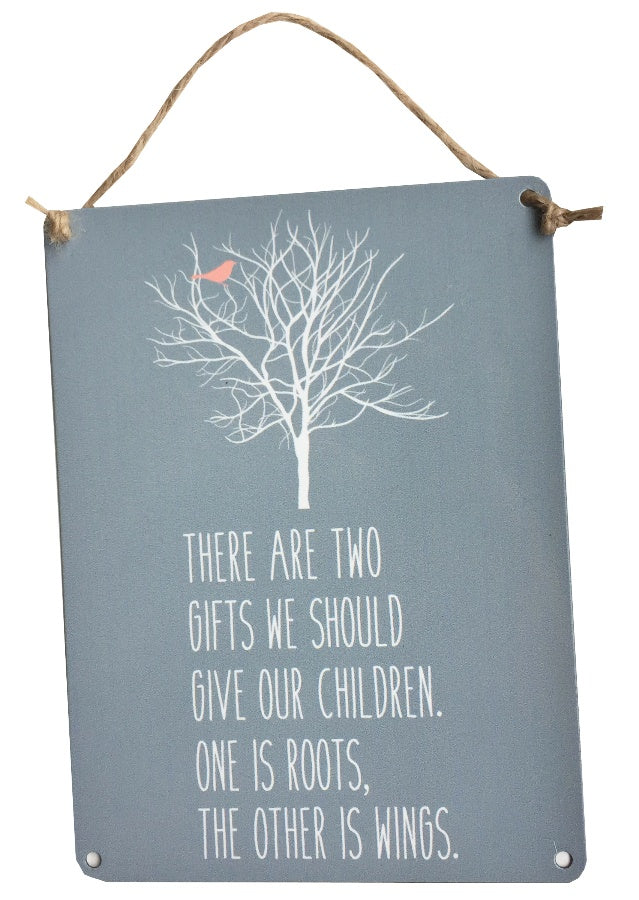 Add a touch of wisdom and charm to your child's bedroom with this beautiful "Wise Words" metal sign. Featuring the heartfelt message, "There are two gifts we should give our children. One is roots and the other is wings," this sign serves as a gentle reminder of the values we cherish.