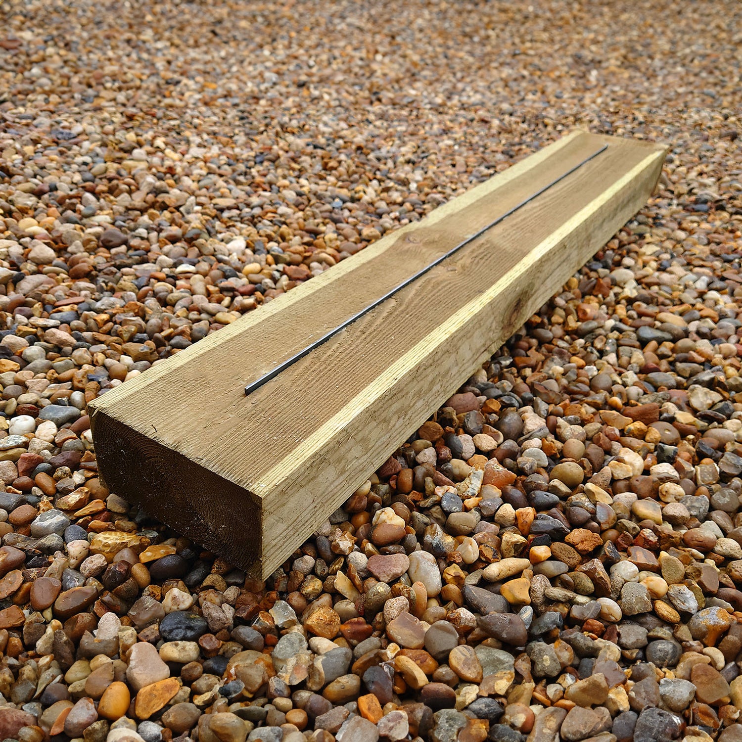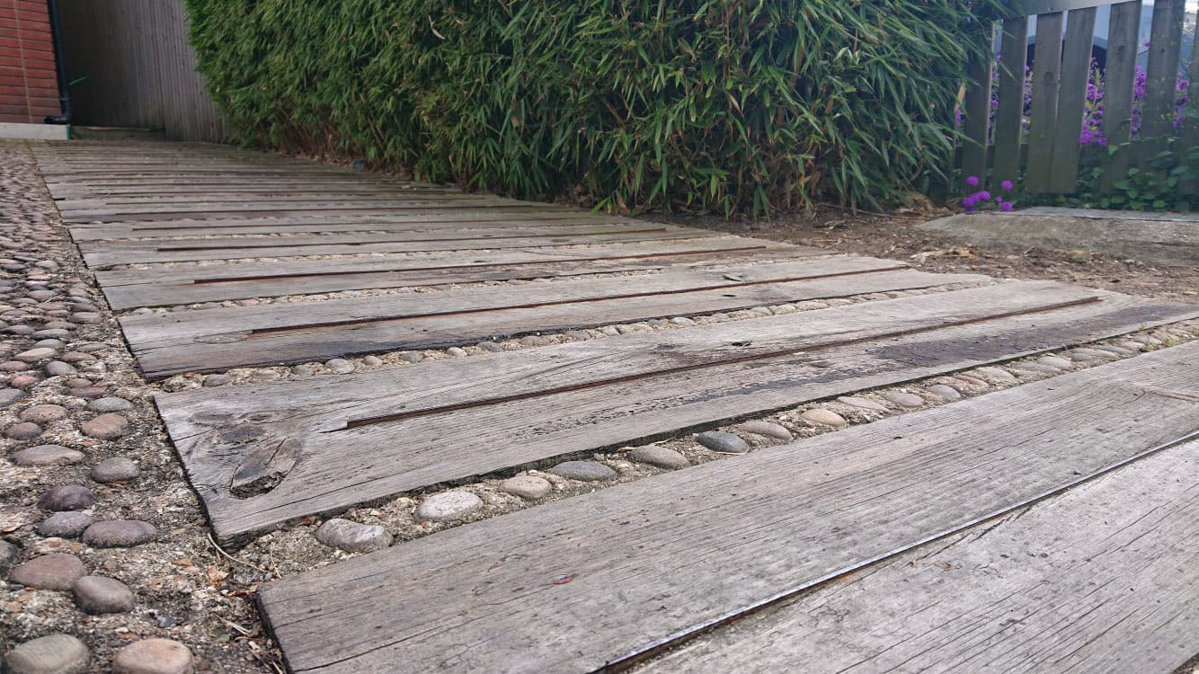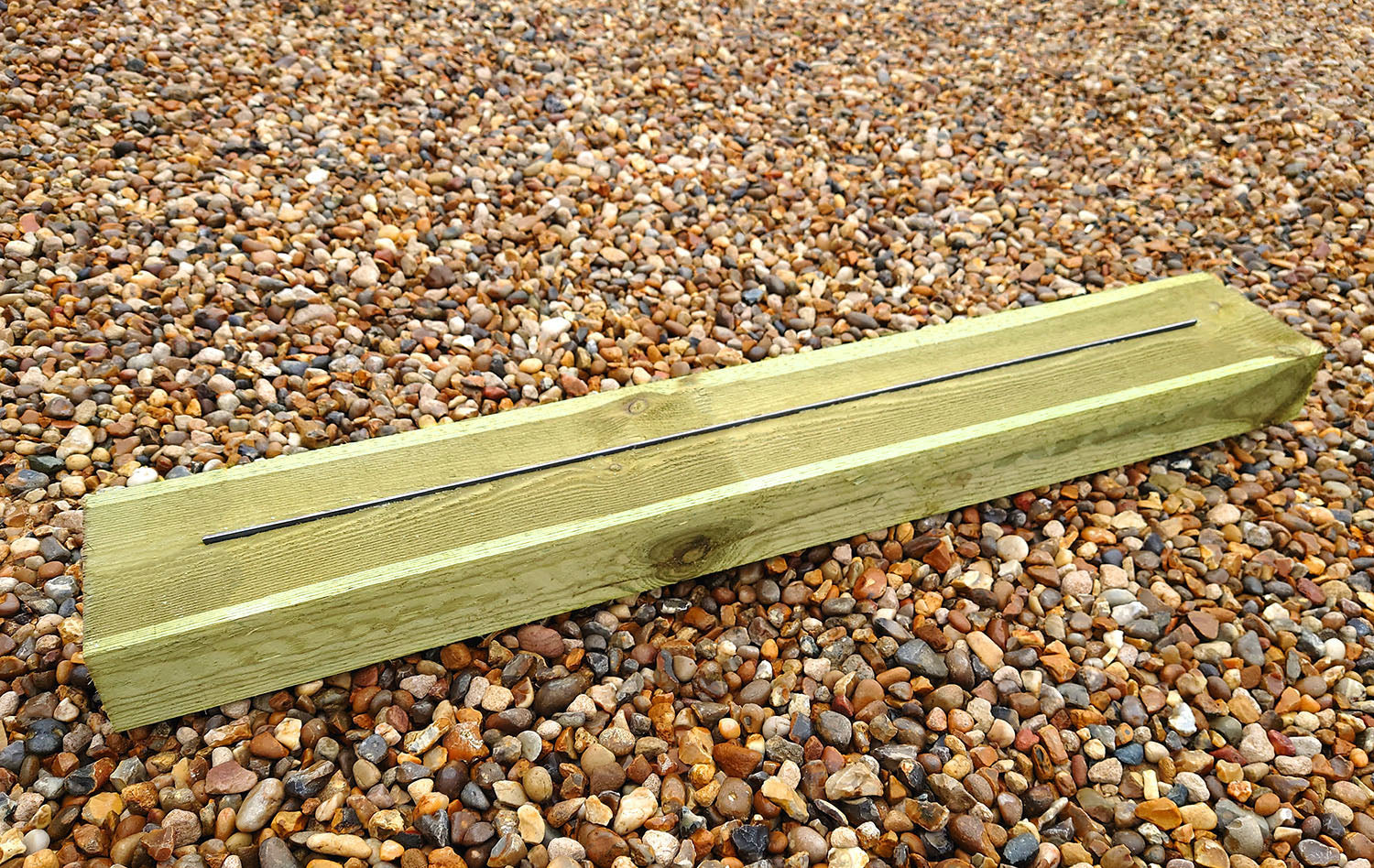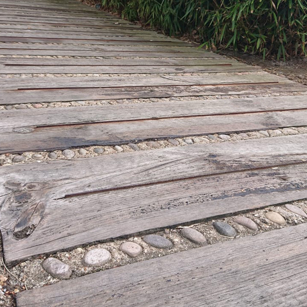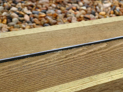 On each sleeper, a small metal wedge is driven into the centre of the sleeper, which protrudes the edge of the wood by a few millimetres. This small wedge offers additional grip and ensures the full surface of the sleeper is not slippery in the wet, making it safe and easy to walk over or move wheelbarrows across. It also retains its grip if mud gets on the path.