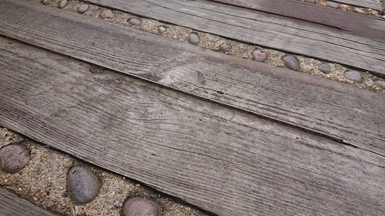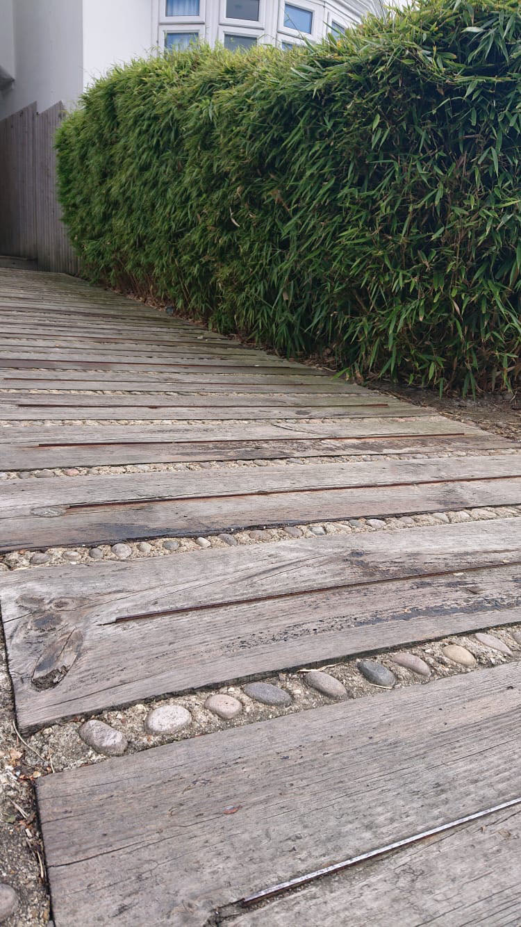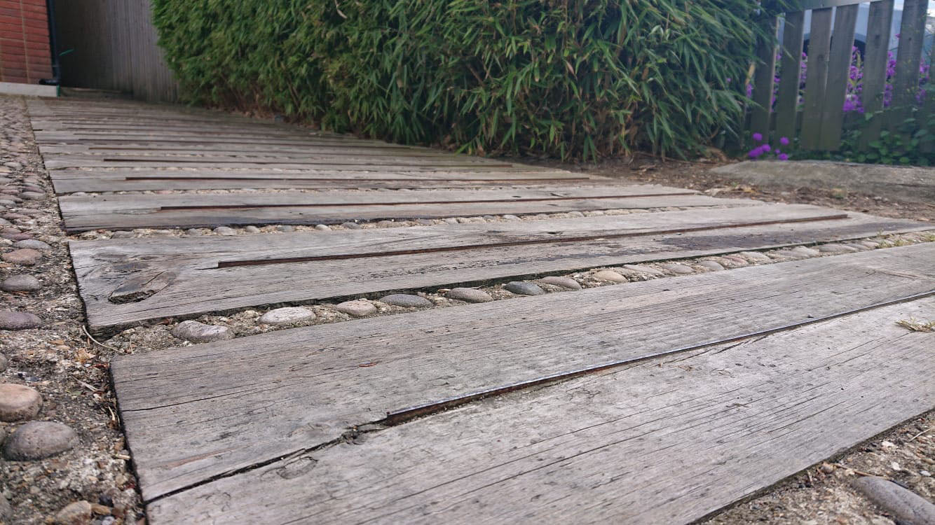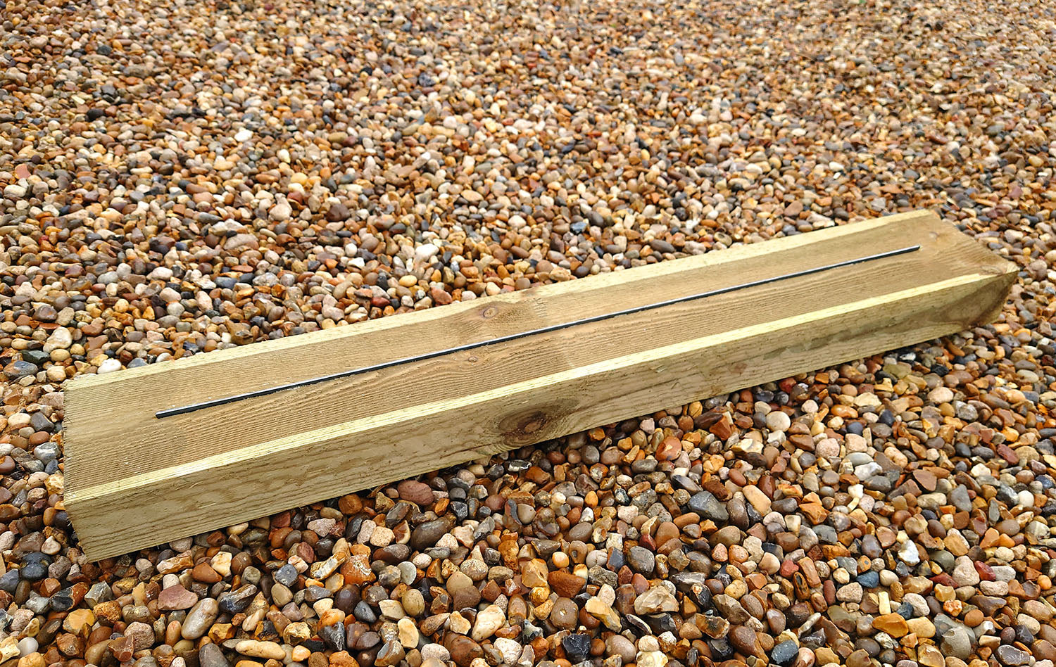 On each sleeper, a small metal wedge is driven into the centre of the sleeper, which protrudes the edge of the wood by a few millimetres. This small wedge offers additional grip and ensures the full surface of the sleeper is not slippery in the wet, making it safe and easy to walk over or move wheelbarrows across. It also retains its grip if mud gets on the path.