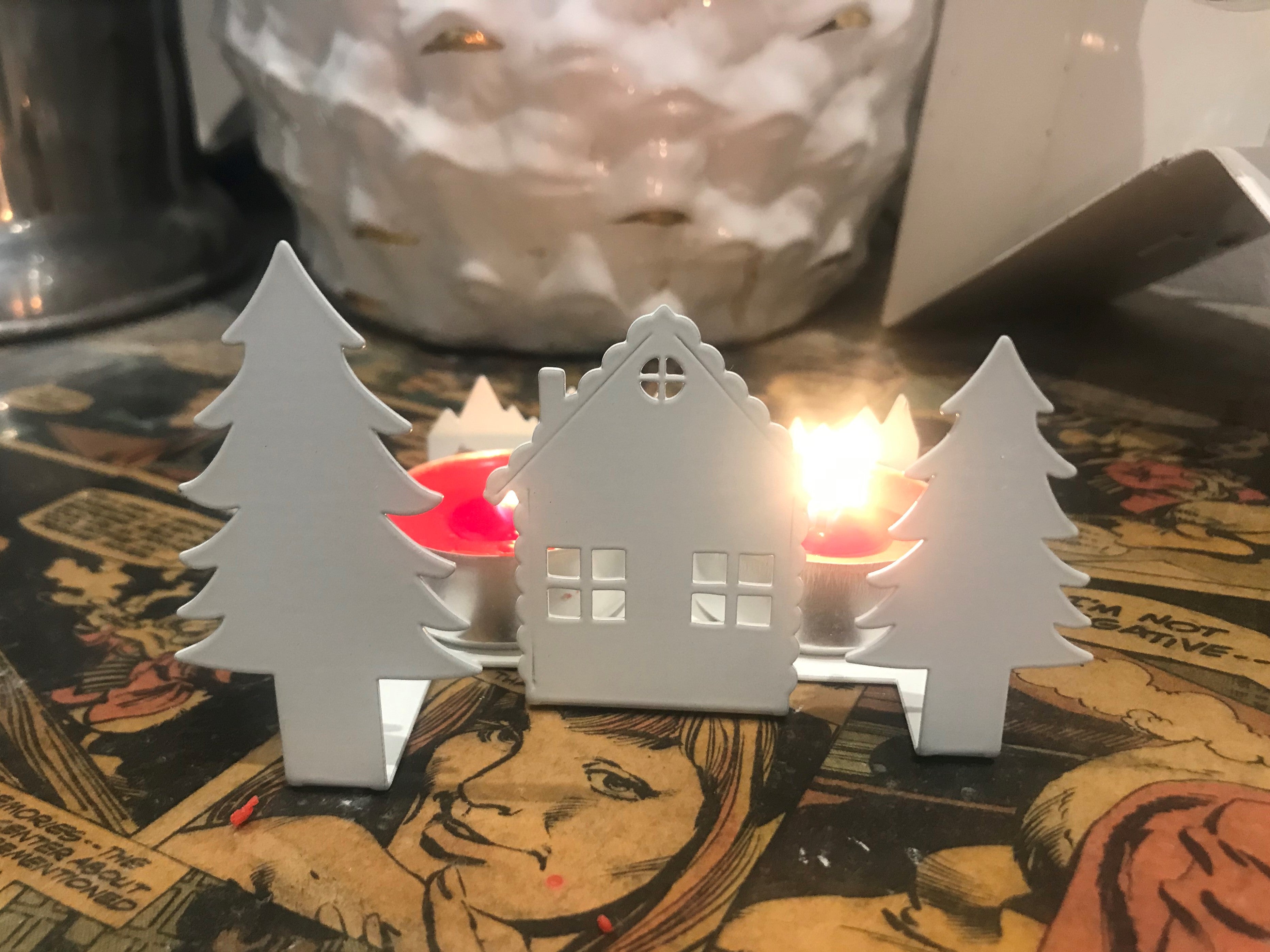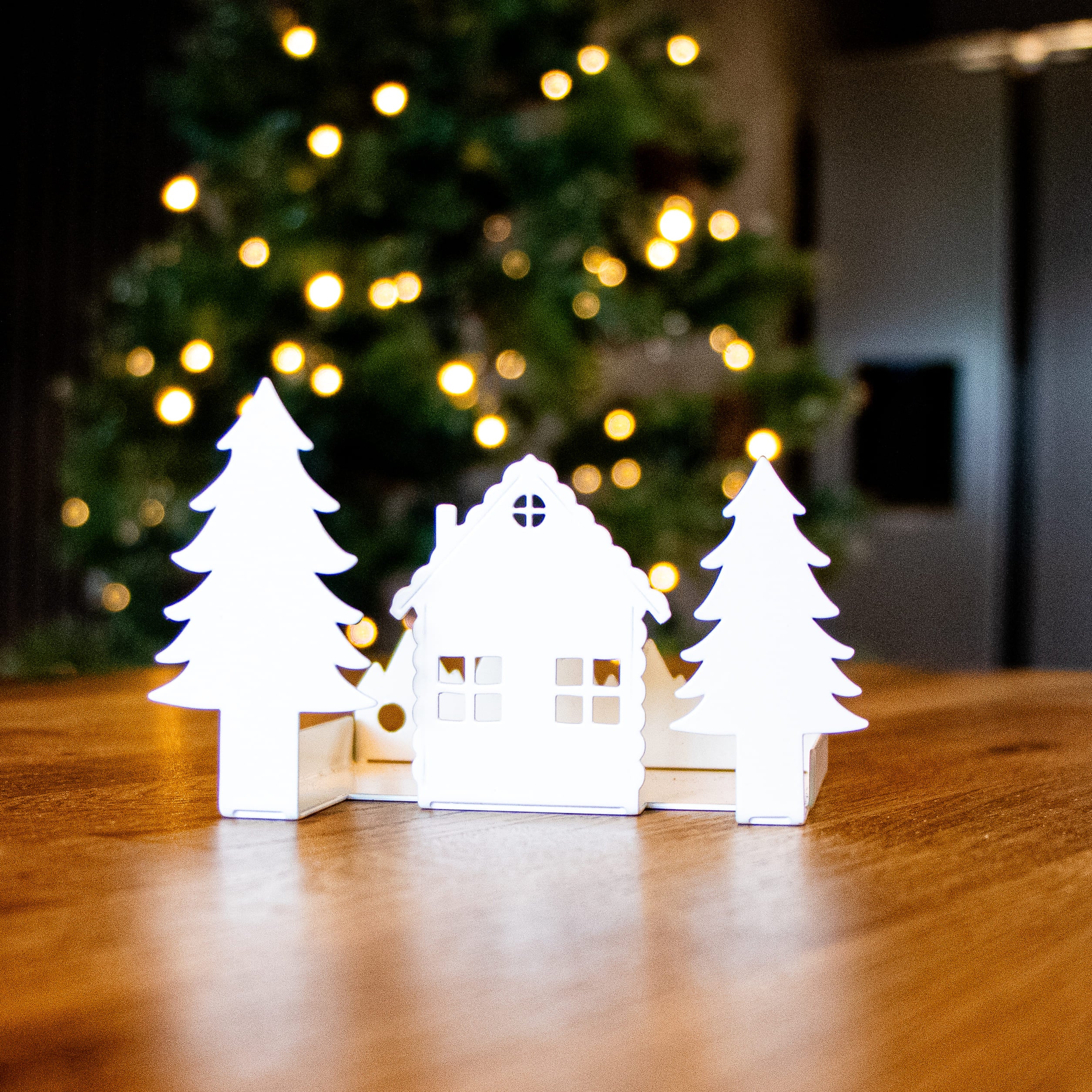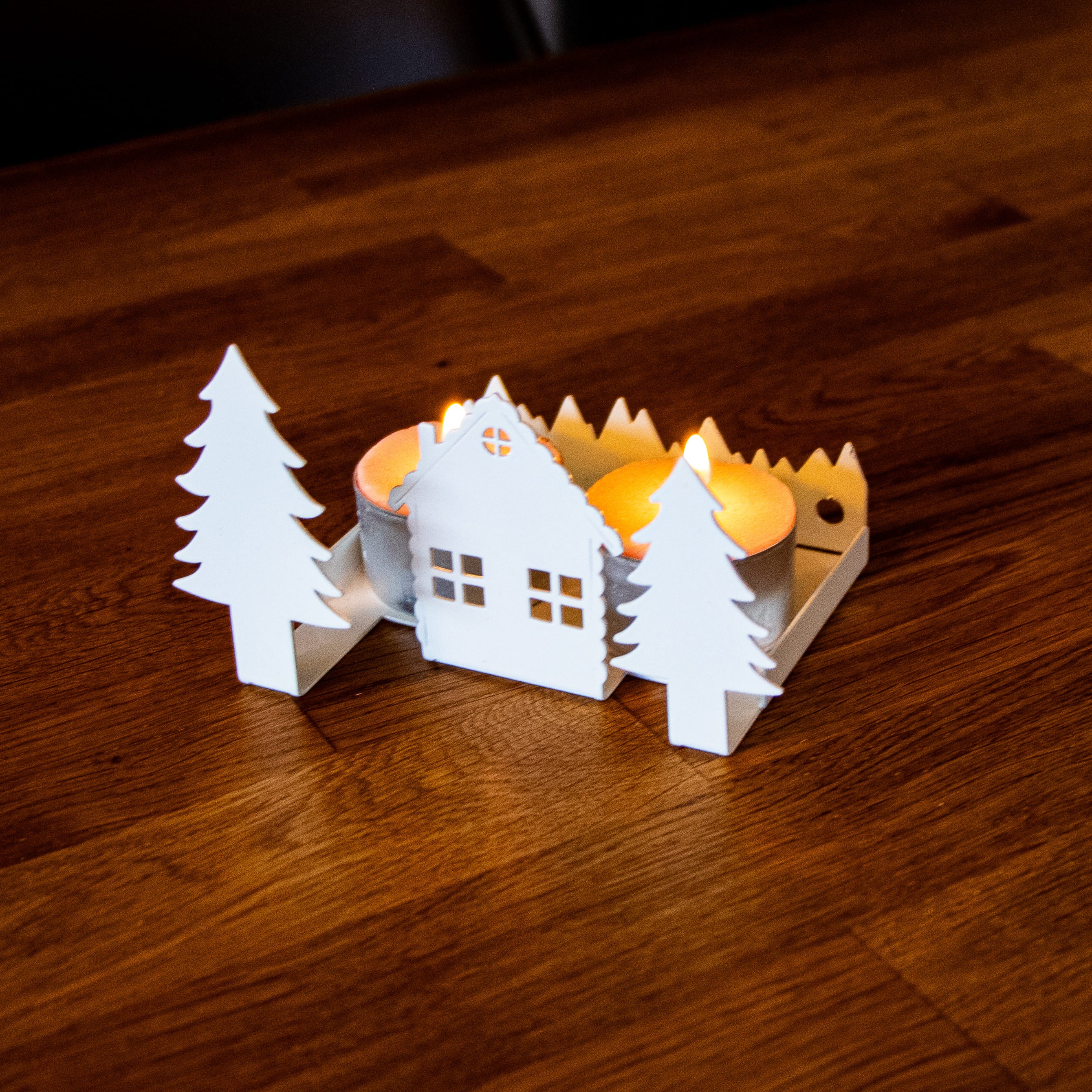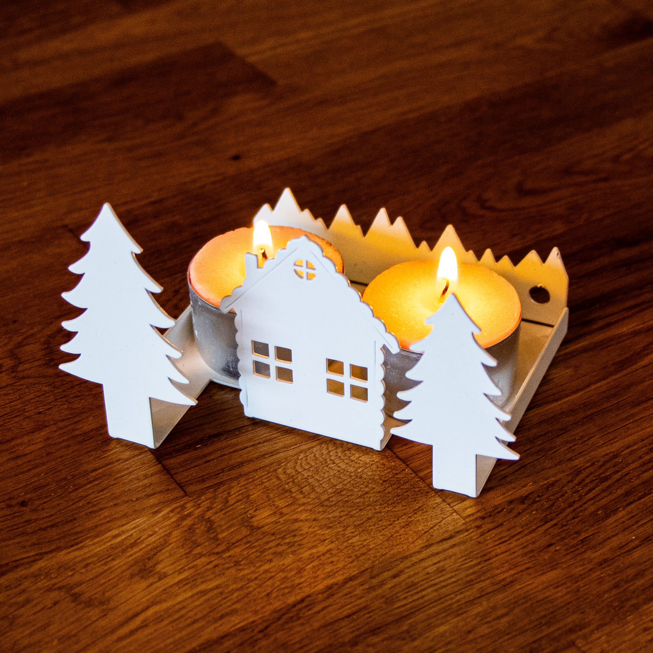 This Tea Light and Candle Holder is suitable for storing up to 2 tealights or candles. The front panels depicts a log cabin and two trees at staggered depths. This gives a great deal of depth perception, making it look like a 3D scene. When the candles are lit, in darker settings the lights will shine through the gaps of the design, looking like an illuminated log cabin on a winter's night.
