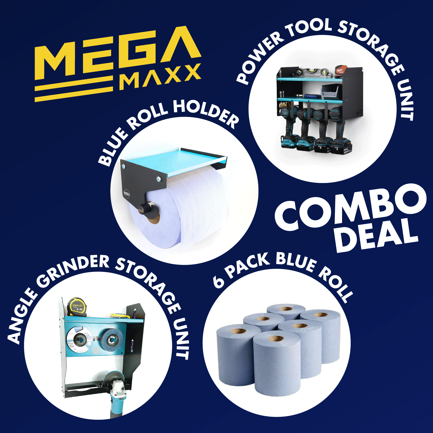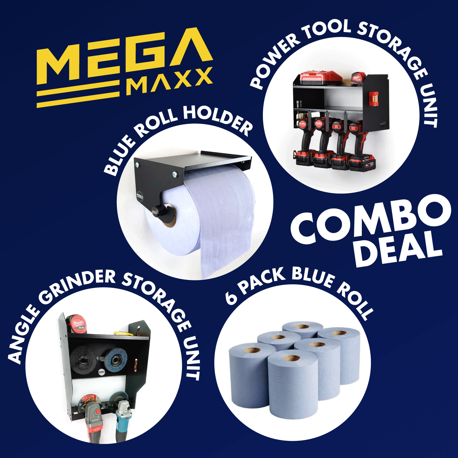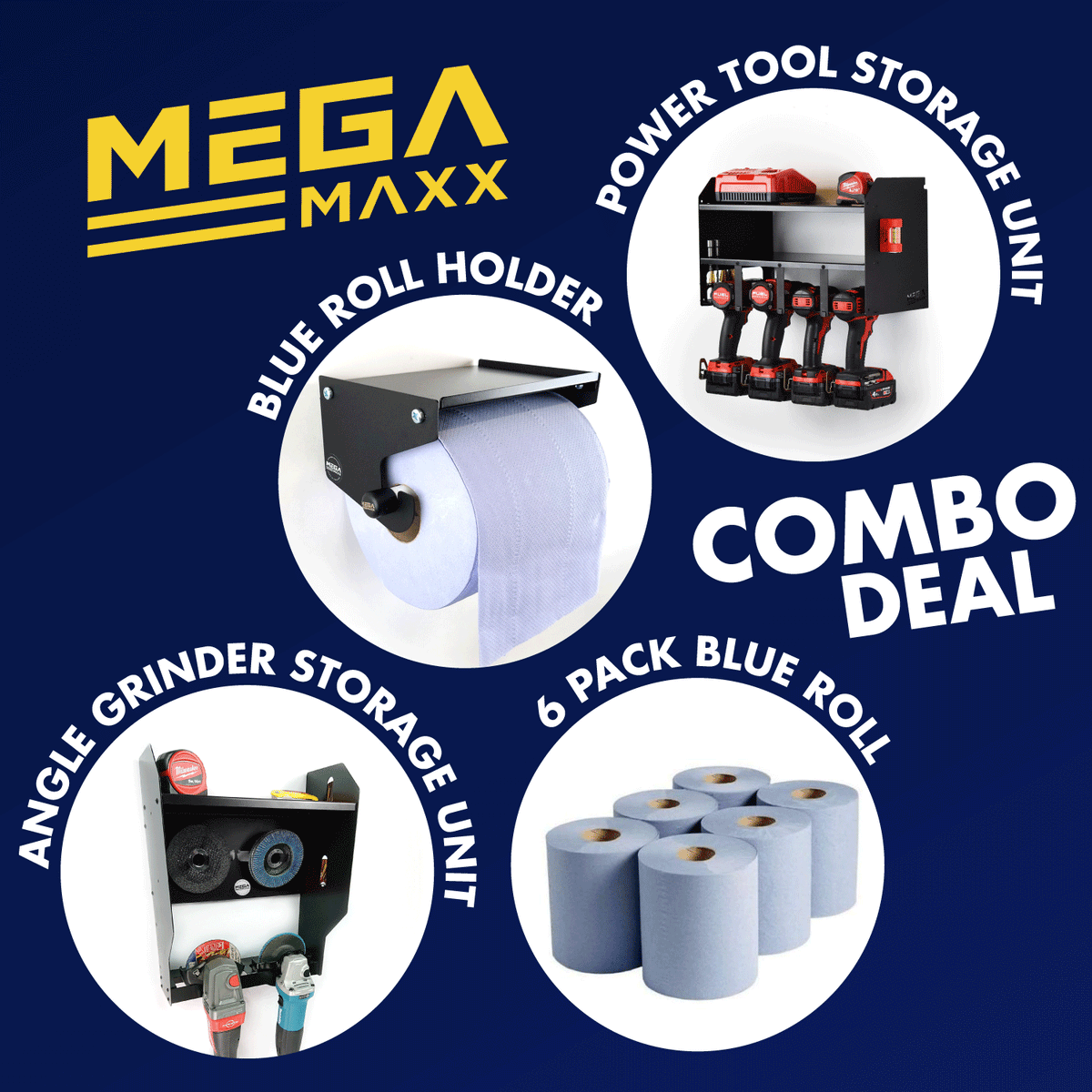 The perfect solution for Power Tool Storage in your workshop, garage or shed! This combo deal will ensure you have storage for up to 4 power drills and 2 angle grinders, as well as handy shelves for all your bits, spares and chargers! You will also get some Blue Rolls for your brand new Blue Roll Holder.
