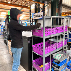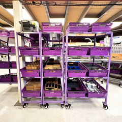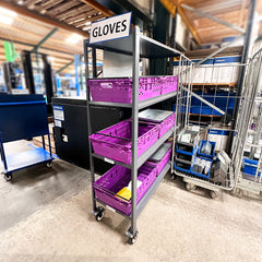 The 4 tiers of shelving in this crate trolley allows for plenty of storage as well as ample room for separating items. We use them in our own factory for inventory management and 2-Bin Systems. Once one box has been used, you move onto the next box on that tier, and get the first one refilled and restocked. This version of the product will enable you to see just the front 4 boxes at once, with 2 on each of the 4 shelves. This works well for 2-Bin Systems as the back box is harder to access. You can use a physical barrier on the box to prevent access before the item has been re-stocked or re-ordered.