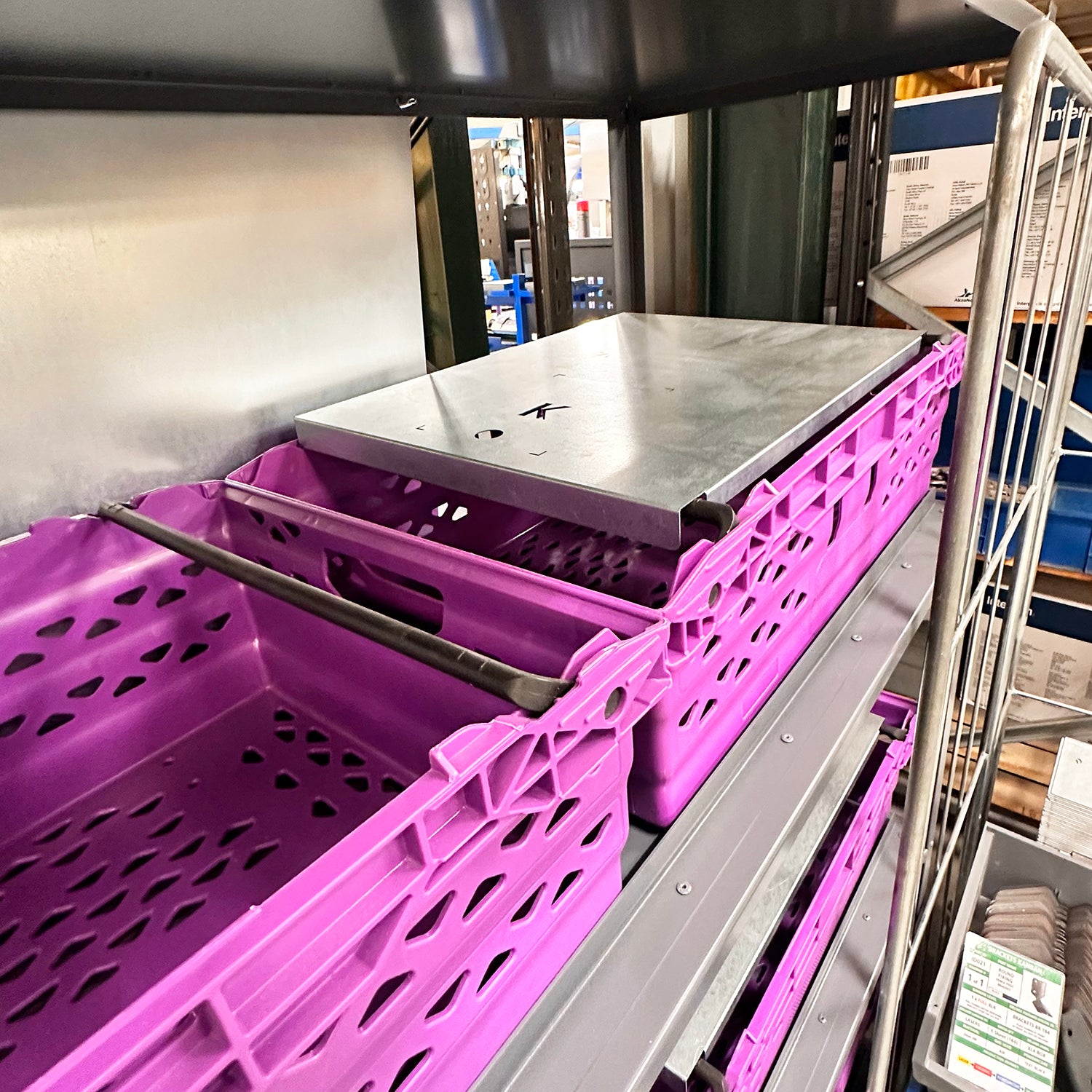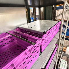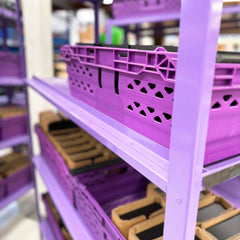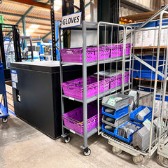 This 4-Tier Storage Trolley from MegaMaxx's PRO range is a great fit for anyone using 600x400mm Bale Arm Crates for storage. These boxes are perfect for transporting goods in a warehouse, a great choice for moving material and product around a factory. But finding the right racking for them proved difficult. We designed these mobile trolley shelving units specifically for storing 600x400mm Bale Arm Crates.