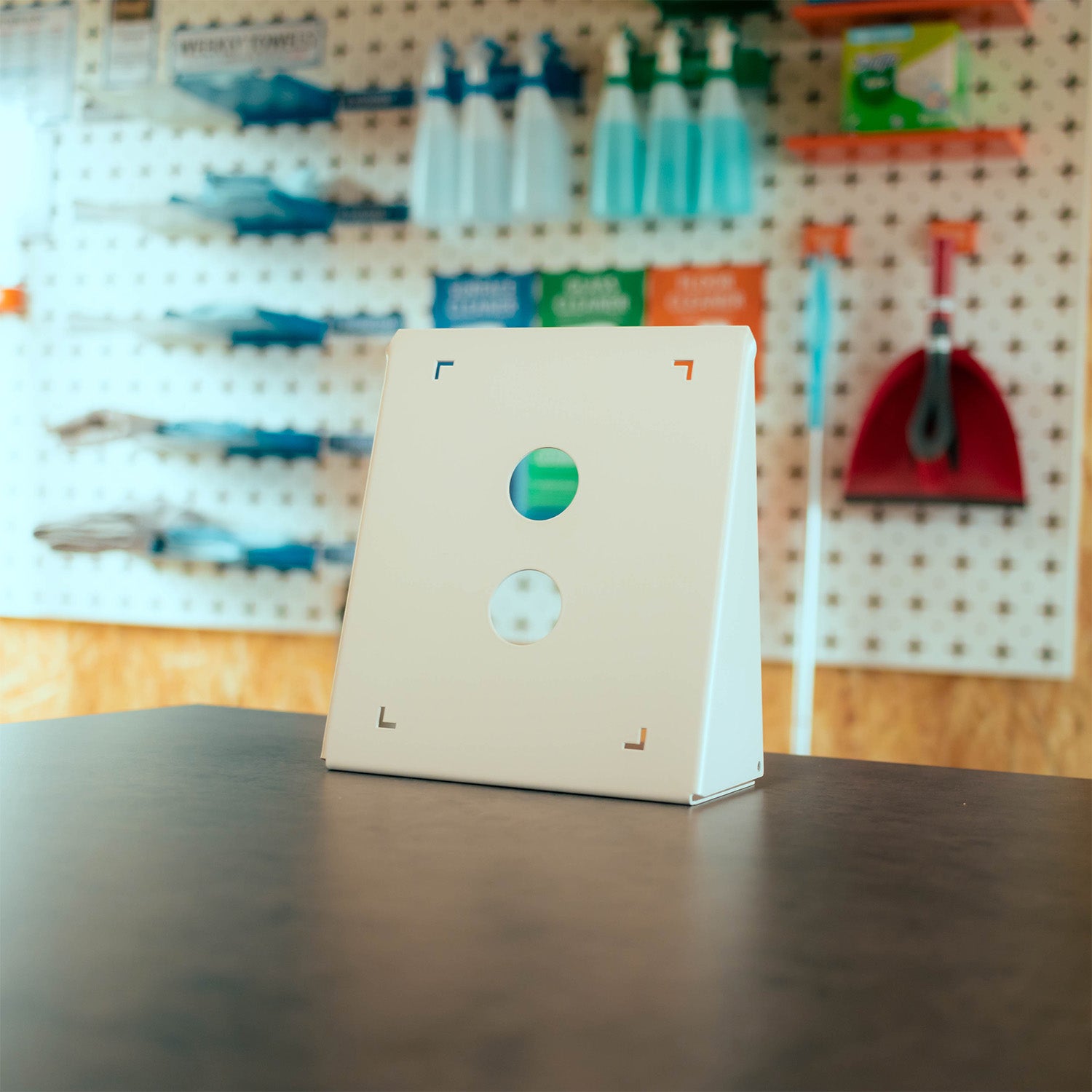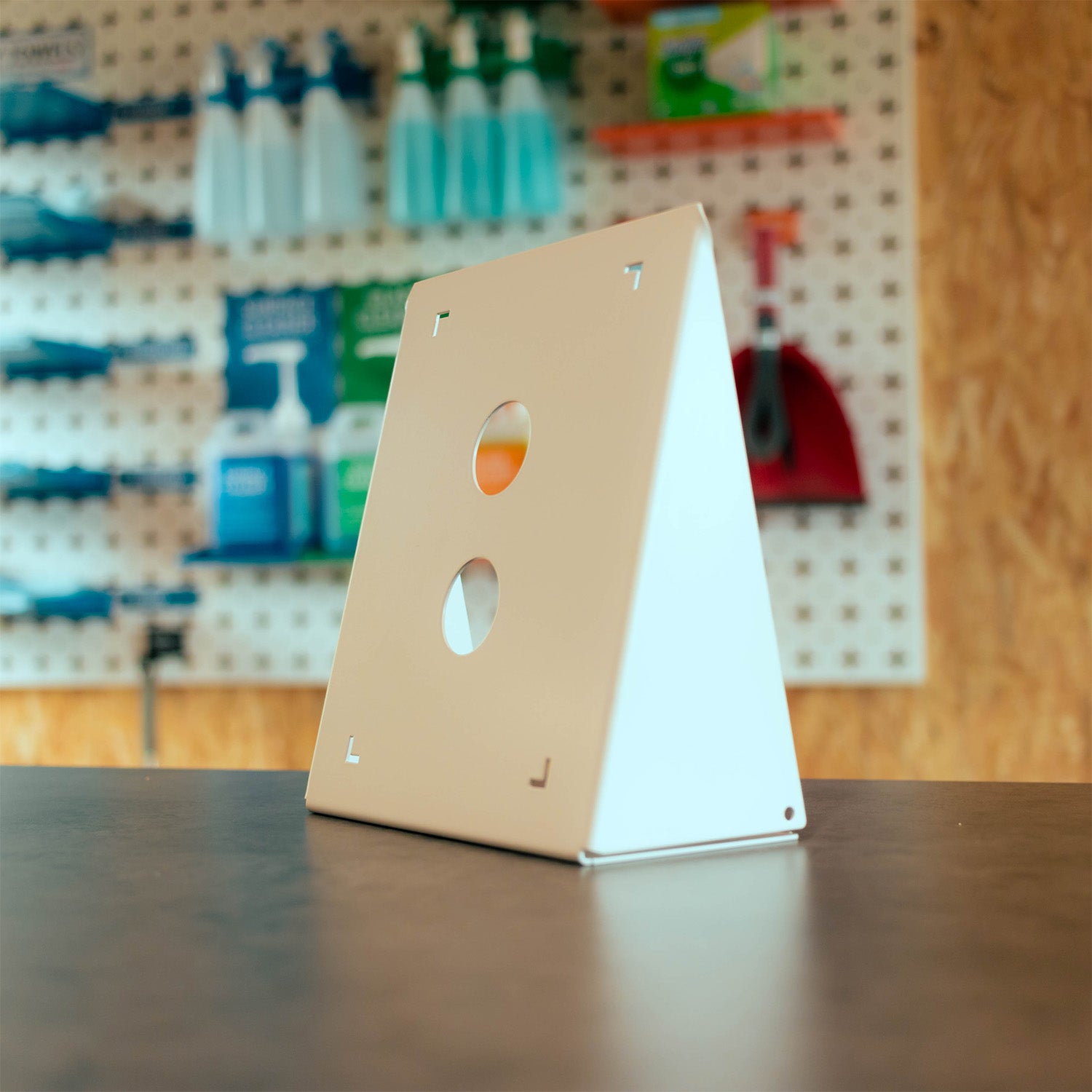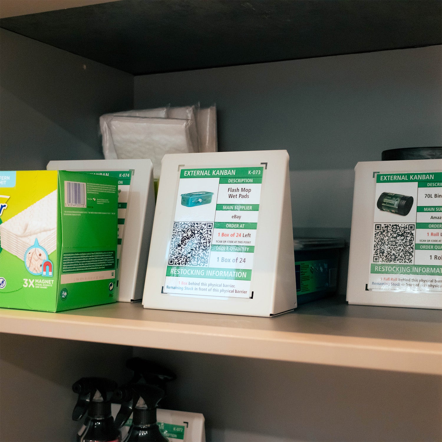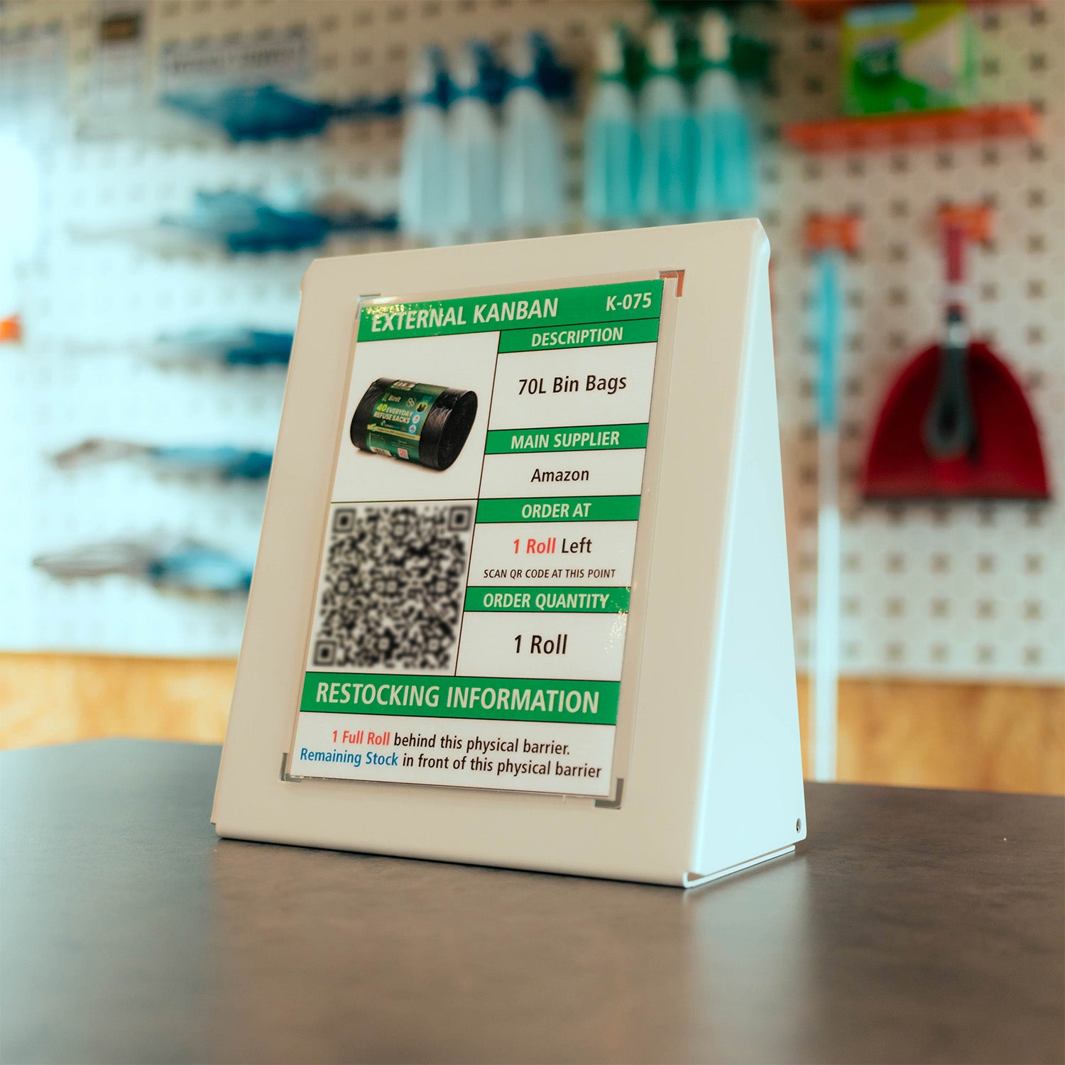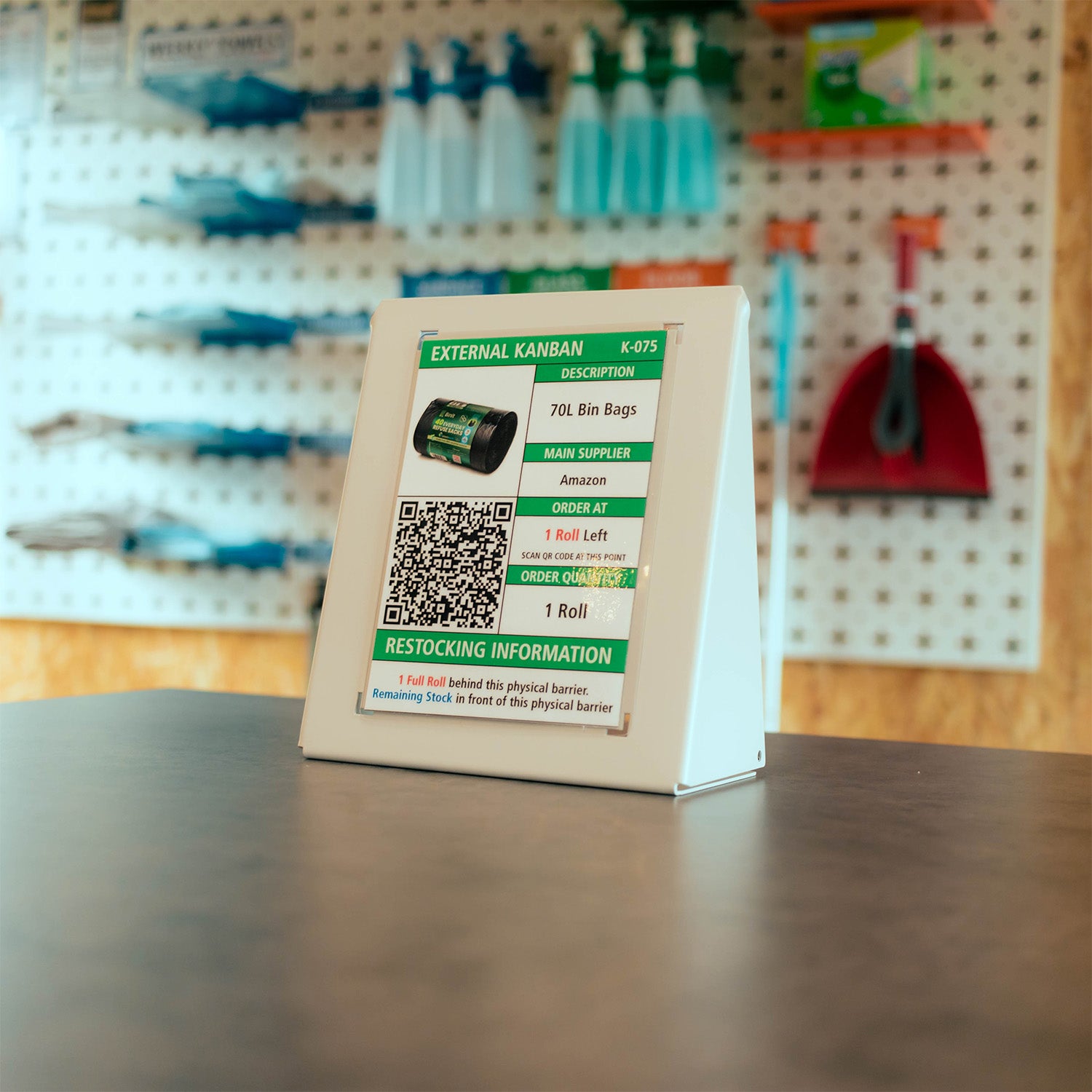 This design is fully free-standing, allowing it to simply be placed in front of the products in the reserve stock. This makes it great for use on worktops, desktops or inside cupboards where space is limited. Place the barrier in front of the item, slap a kanban card on the marked area, and you've established a "2-Bin System"! To easily move the barrier, it's easiest to pull the kanban and order the product, with two finger holes situated behind the kanban.