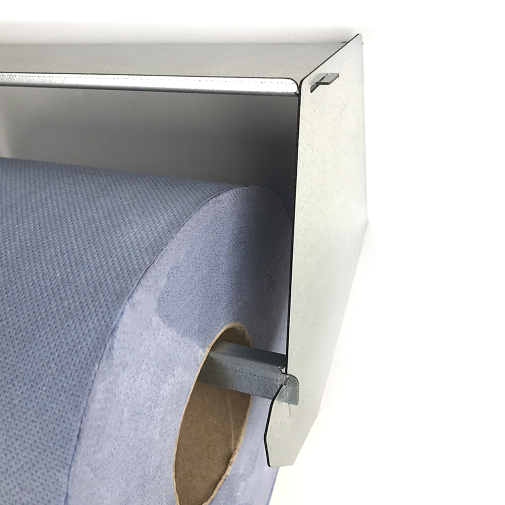 The roll sits on a basic metal bar which replaces the traditional pole design. This makes it easy to replace rolls – simply lift the bar out, slide on a new roll, and drop it back into place. Despite the minimal design, it delivers full functionality. It also features a bare galvanised steel finish for an industrial look that fits well in busy, no-nonsense workspaces.