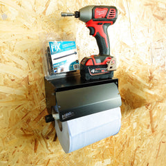 Above the holder is a convenient storage shelf. Use this to store cleaning products and supplies. Or use it to store tools in more industrial settings.