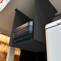 The product consists of a single piece of metal, meaning no assembly is required when it is delivered. There is an opening at the back of the unit to allow easy access to cables and switches. The height of the bracket allows you to lift the lid to replace the paper label roll without needing to remove the printer from the entire bracket. Installation is simple. You can just screw the unit into the underside of your desk using the 4 carefully located screw holes.