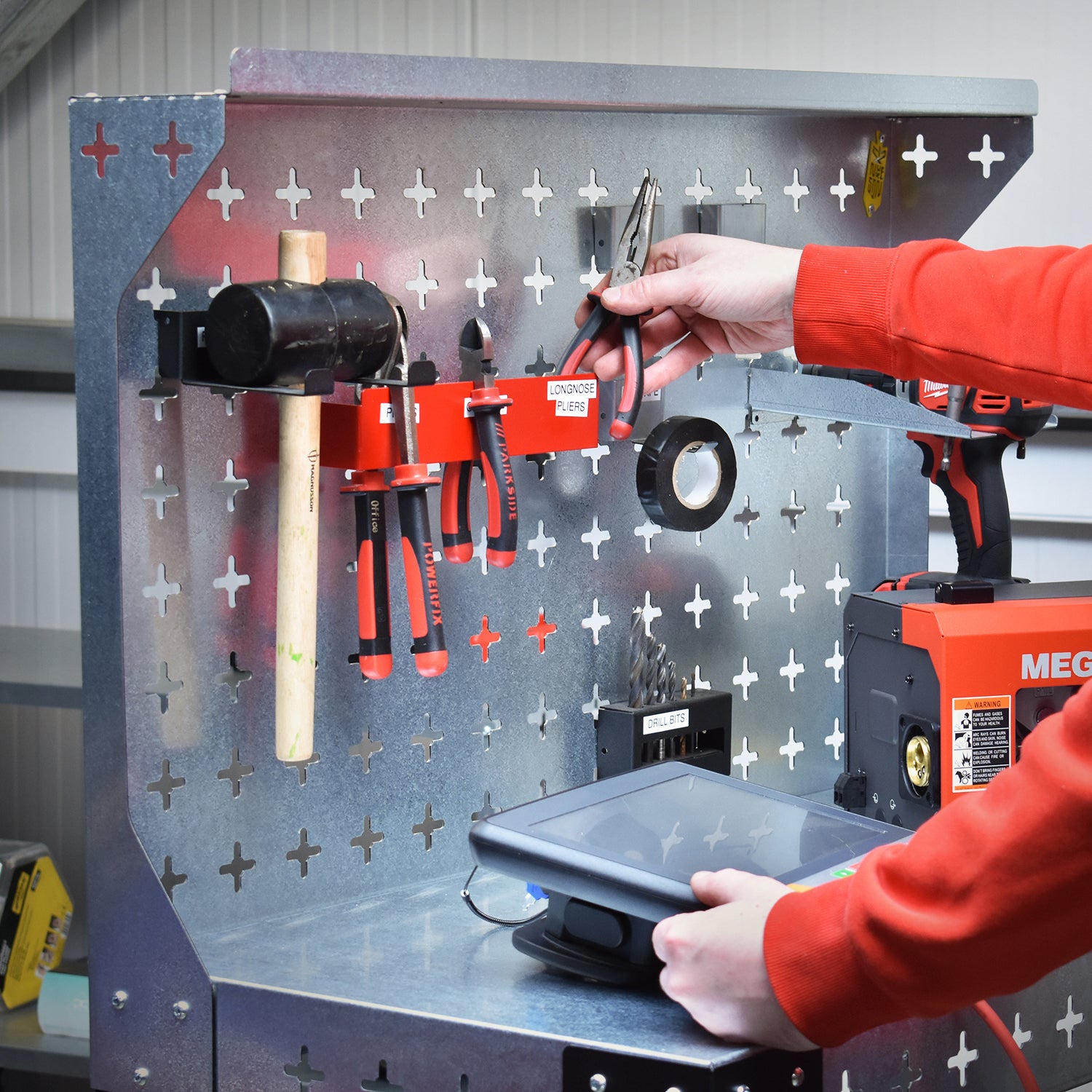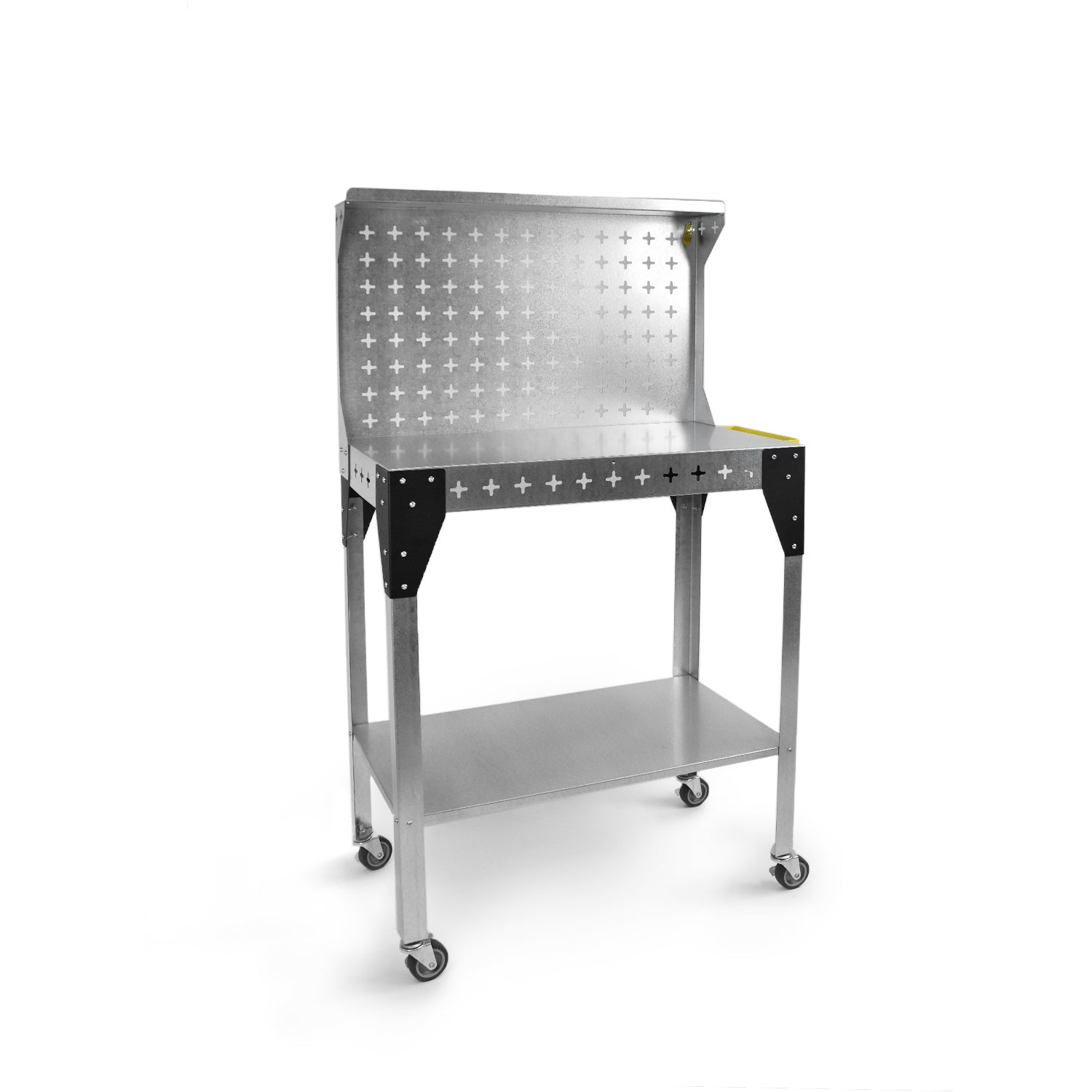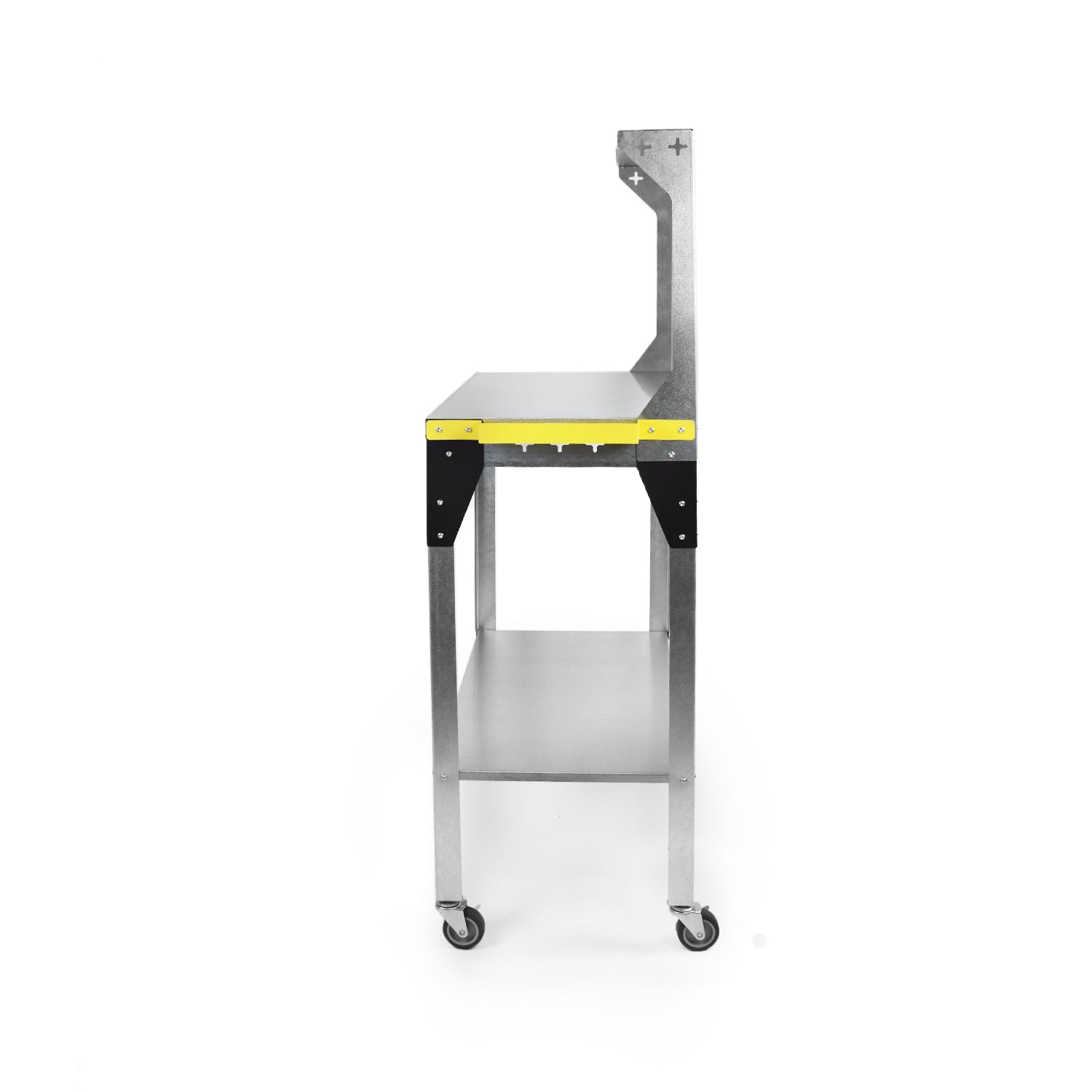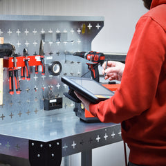 Stack tools or products on the table top or lower shelf, and then use some Nukeson Tool Wall Attachments on the side of the tabletop to store some tools and supplies. The back wall on the trolley can be removed if necessary, but is perfect for holding additional tools and supplies. Move the trolley/workstation to exactly where it is needed in your factory or workshop and continue work. You can invert the table top to provide a work surface with a lip around the edge, ensuring things don't roll out or fall off in use, making it suitable for handling smaller items.