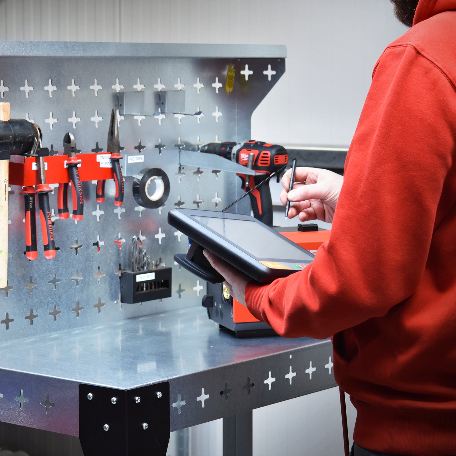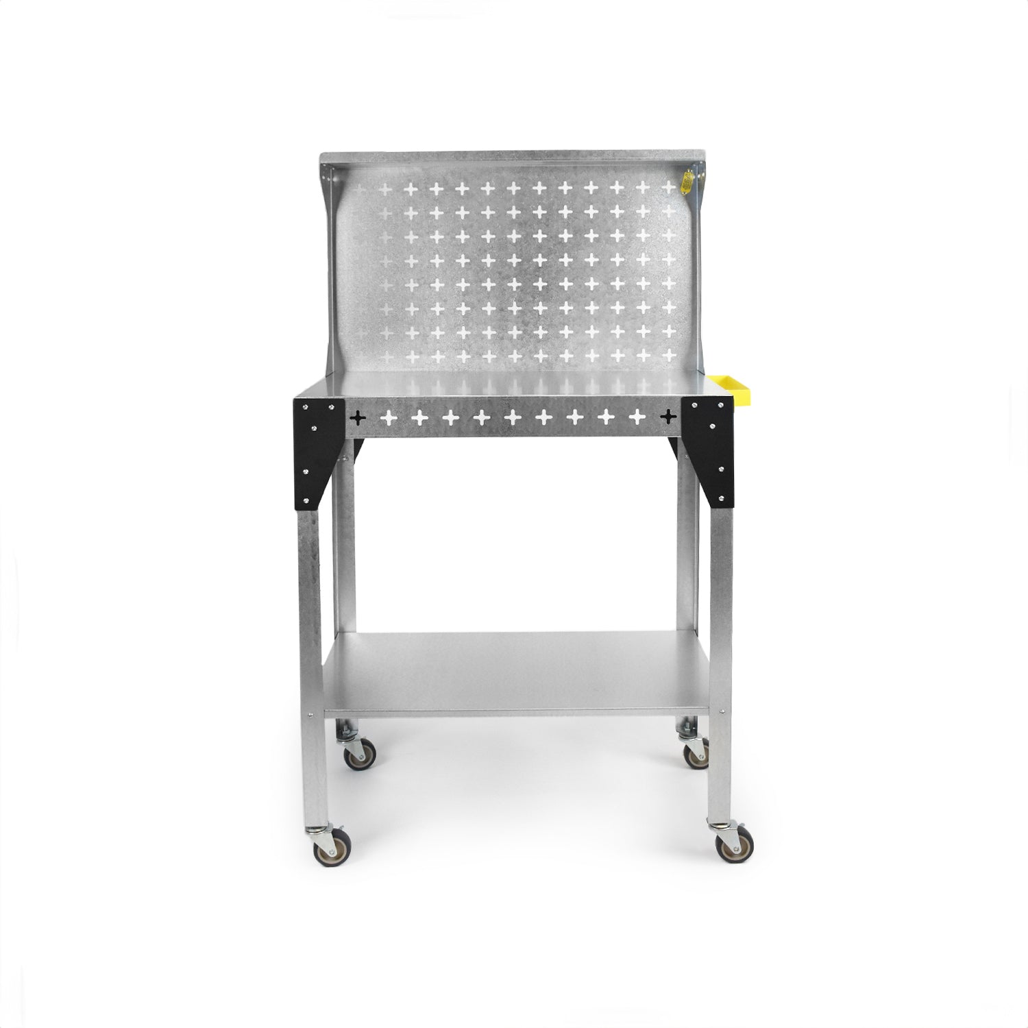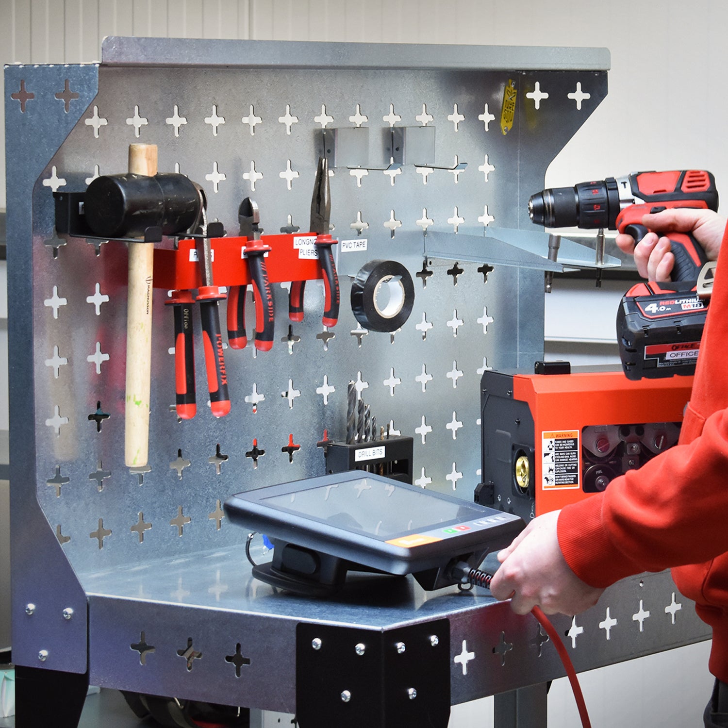 Stack tools or products on the table top or lower shelf, and then use some Nukeson Tool Wall Attachments on the side of the tabletop to store some tools and supplies. The back wall on the trolley can be removed if necessary, but is perfect for holding additional tools and supplies. Move the trolley/workstation to exactly where it is needed in your factory or workshop and continue work. You can invert the table top to provide a work surface with a lip around the edge, ensuring things don't roll out or fall off in use, making it suitable for handling smaller items.