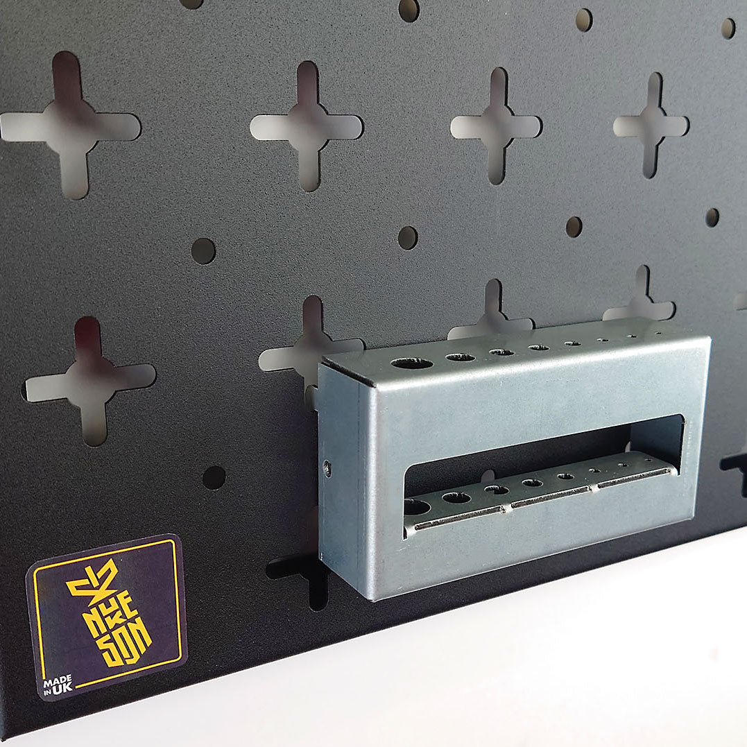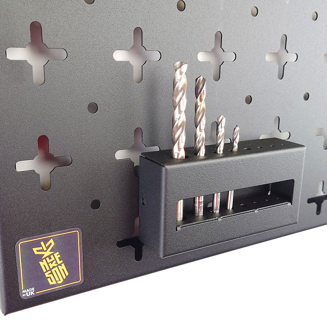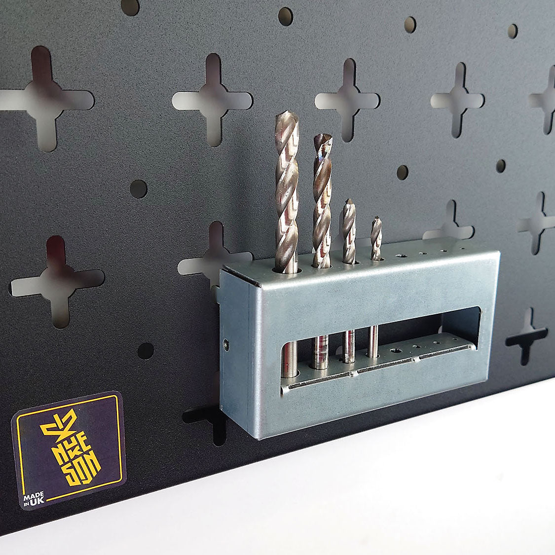 Compatible with our Nukeson Tool Wall Panels, this attachment allows you to store up to 8 Drill Bits. The sizes of the holes in the bracket vary from hole-to-hole allowing you to store 8 different sizes of Drill Bit. The additional slots below ensure that the drill bits do not wobble around and the base plate ensures the bits do not simply fall through and onto the floor.
