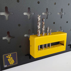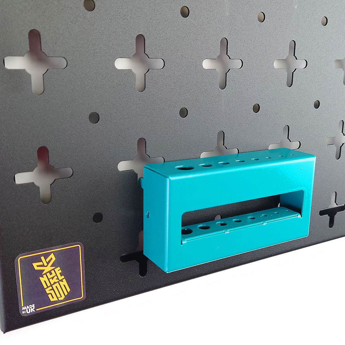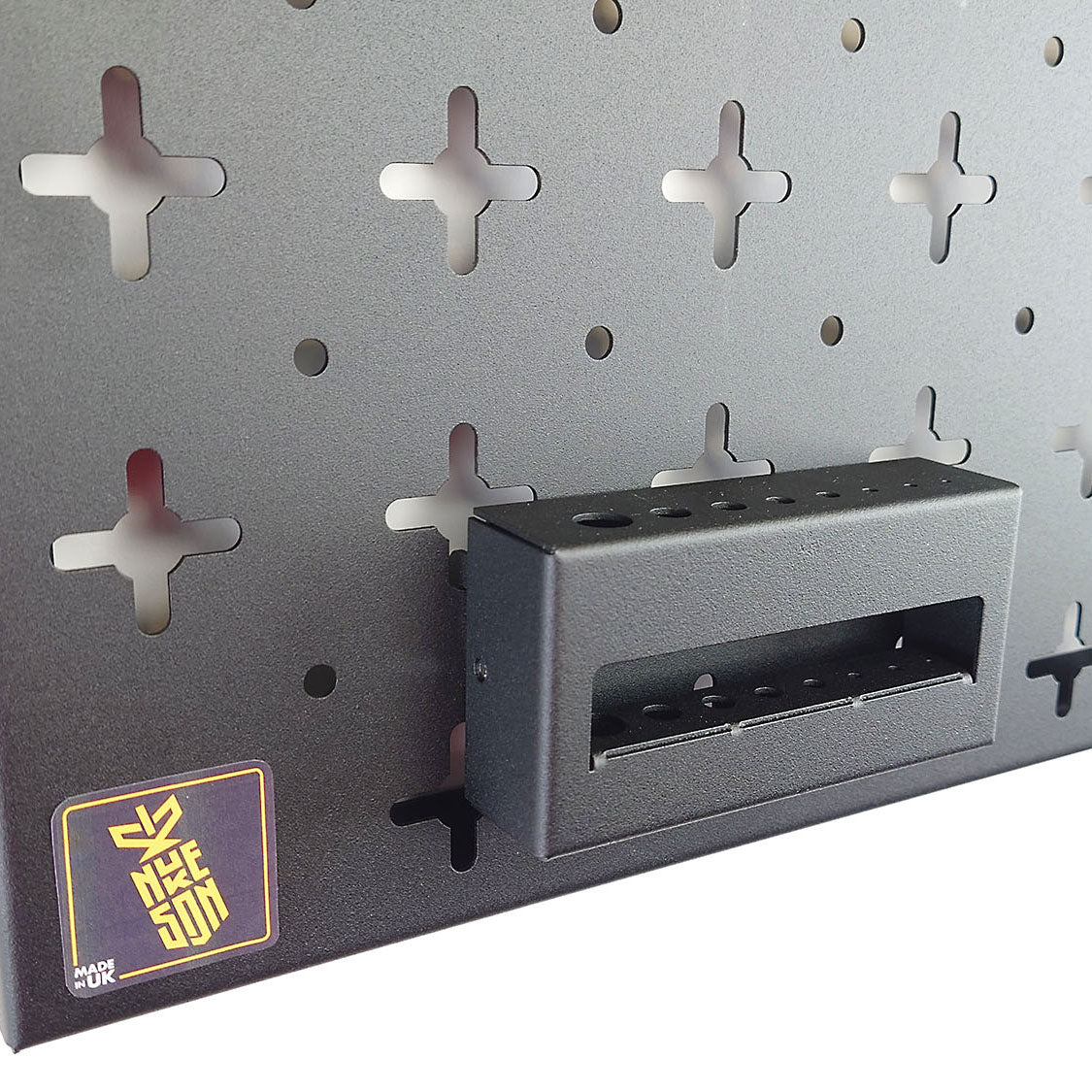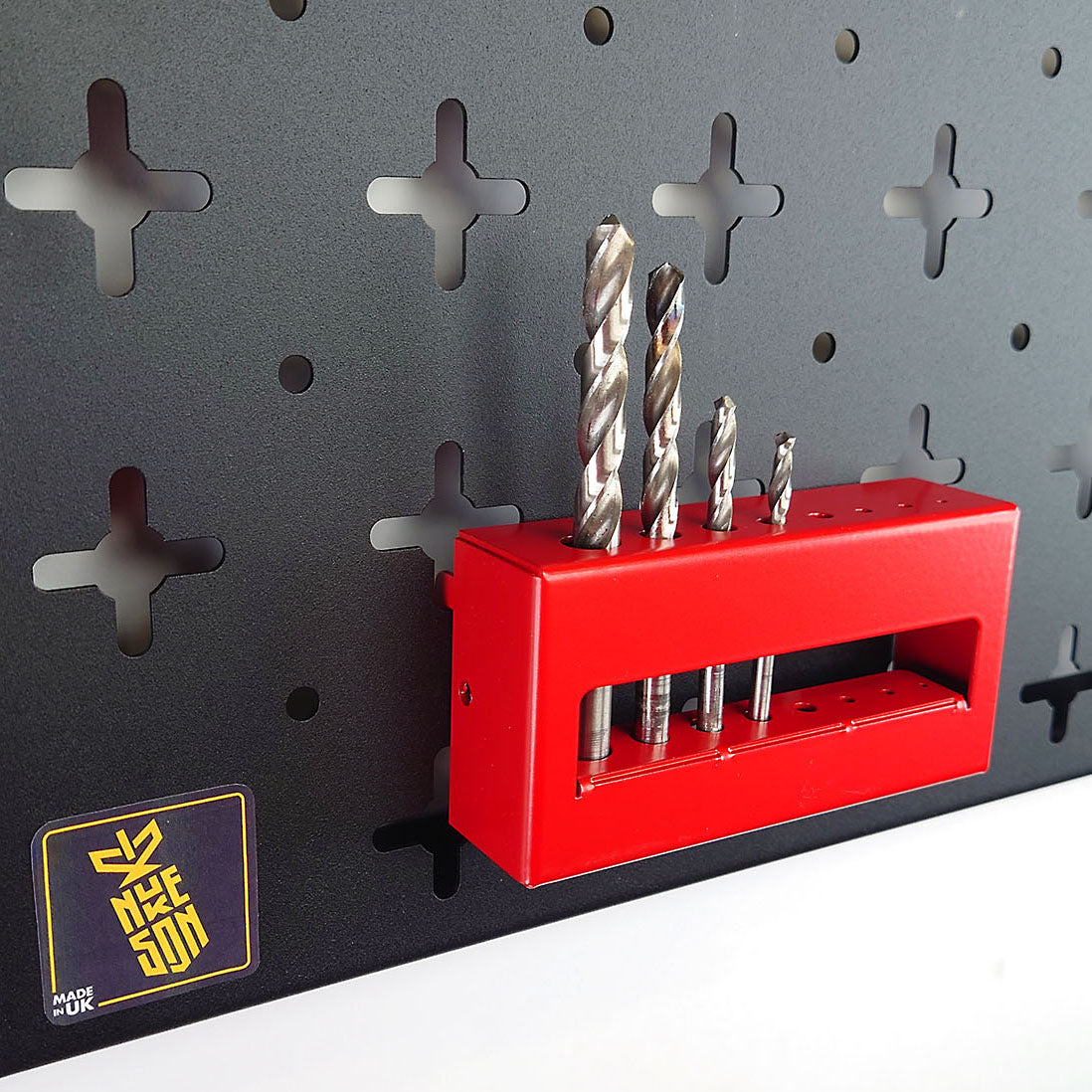 Compatible with our Nukeson Tool Wall Panels, this attachment allows you to store up to 8 Drill Bits. The sizes of the holes in the bracket vary from hole-to-hole allowing you to store 8 different sizes of Drill Bit. The additional slots below ensure that the drill bits do not wobble around and the base plate ensures the bits do not simply fall through and onto the floor.