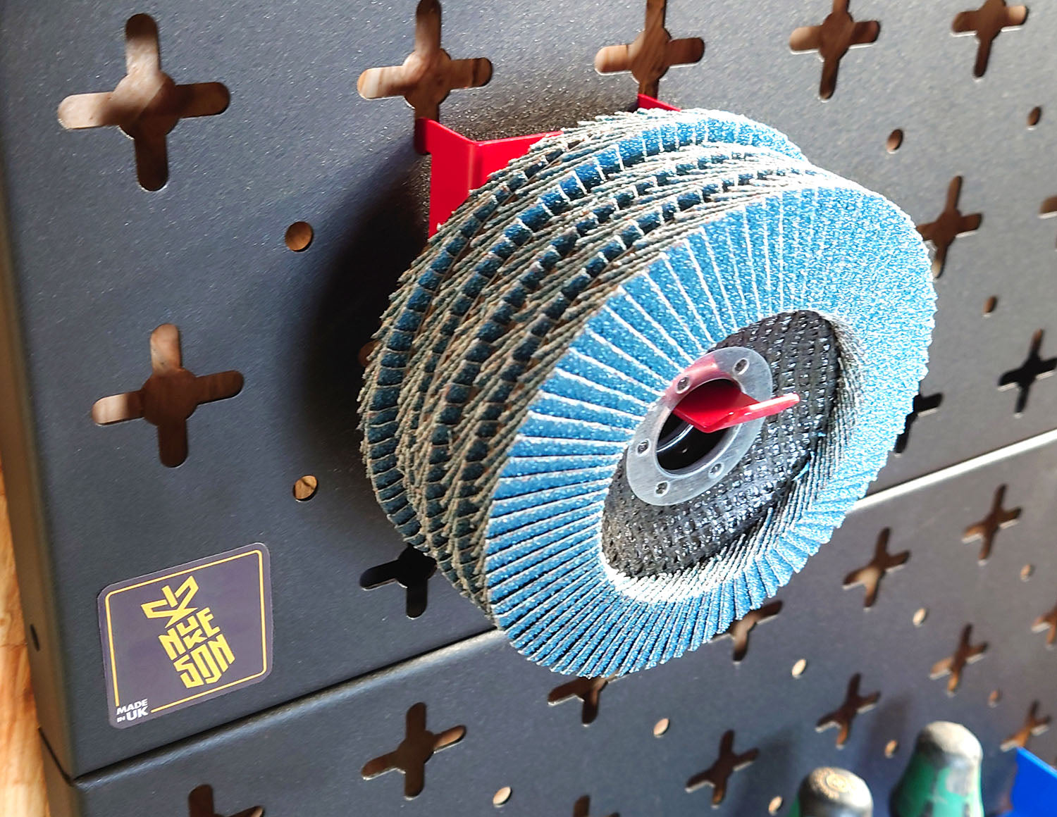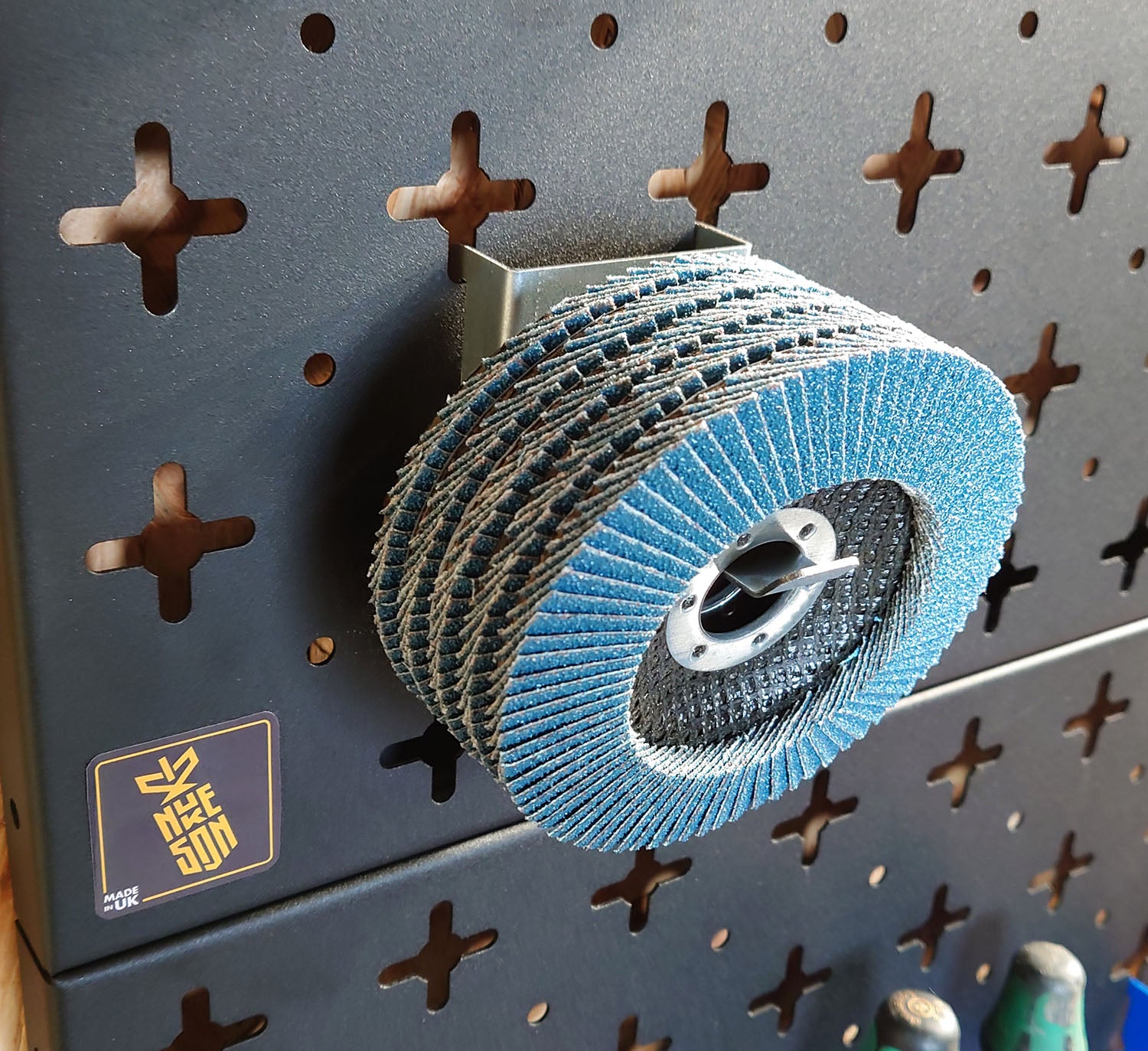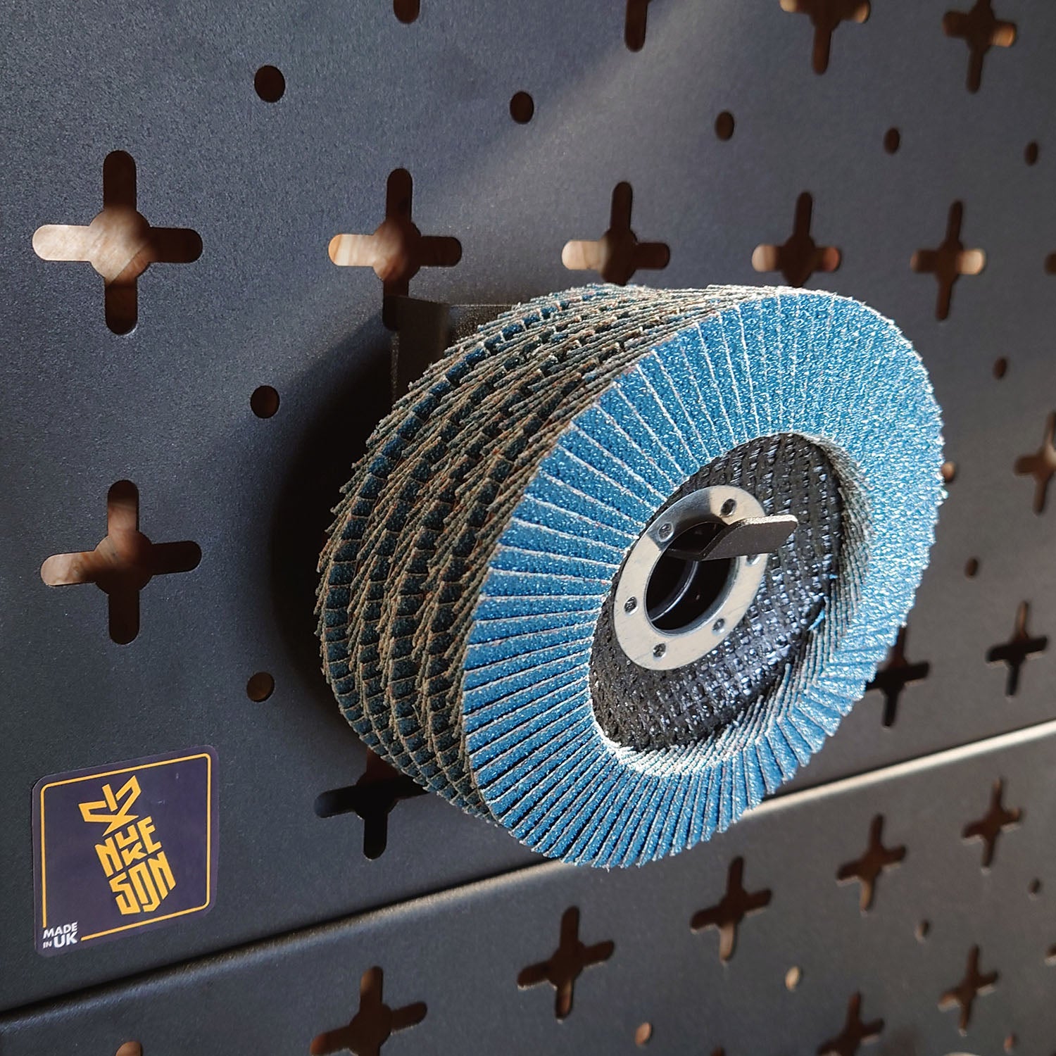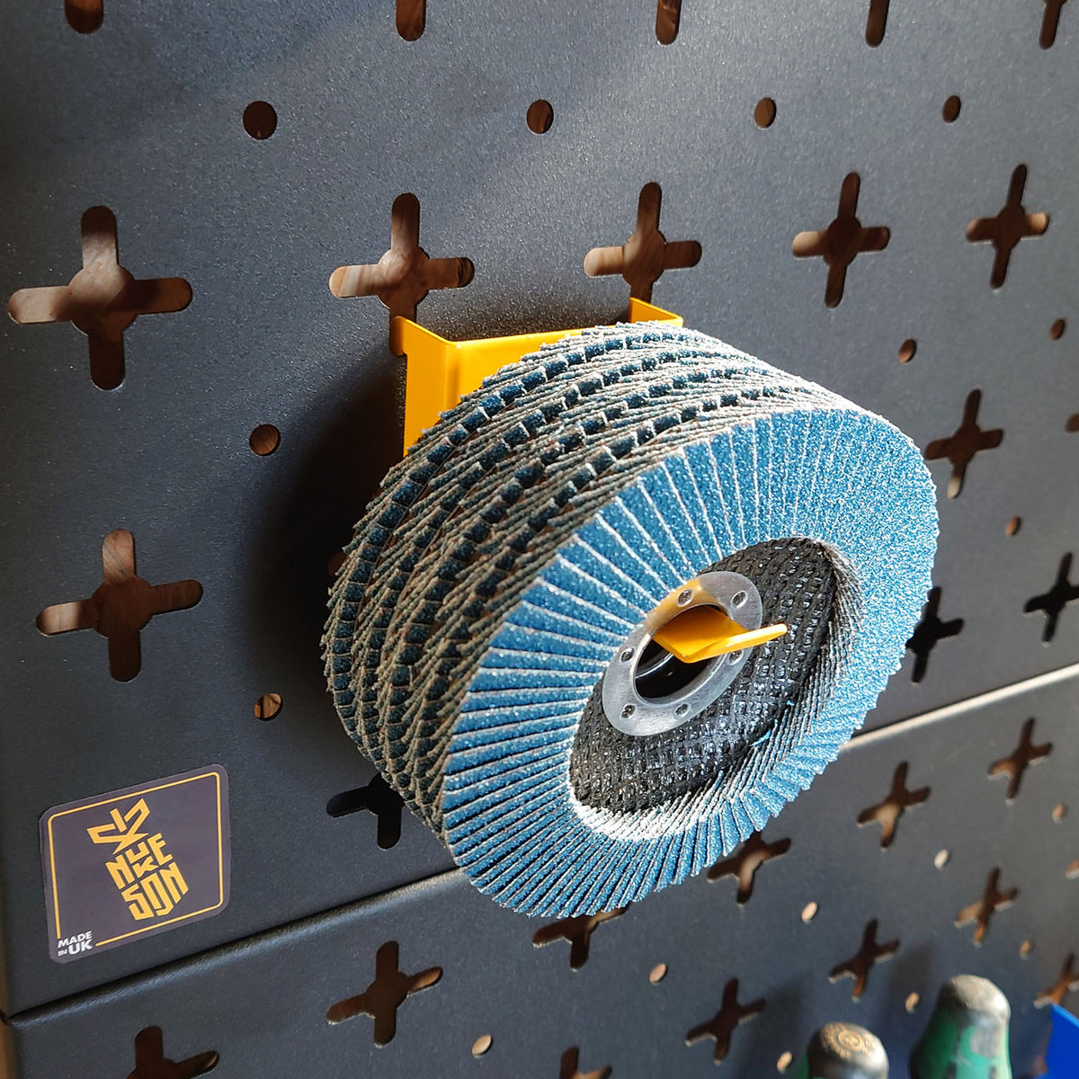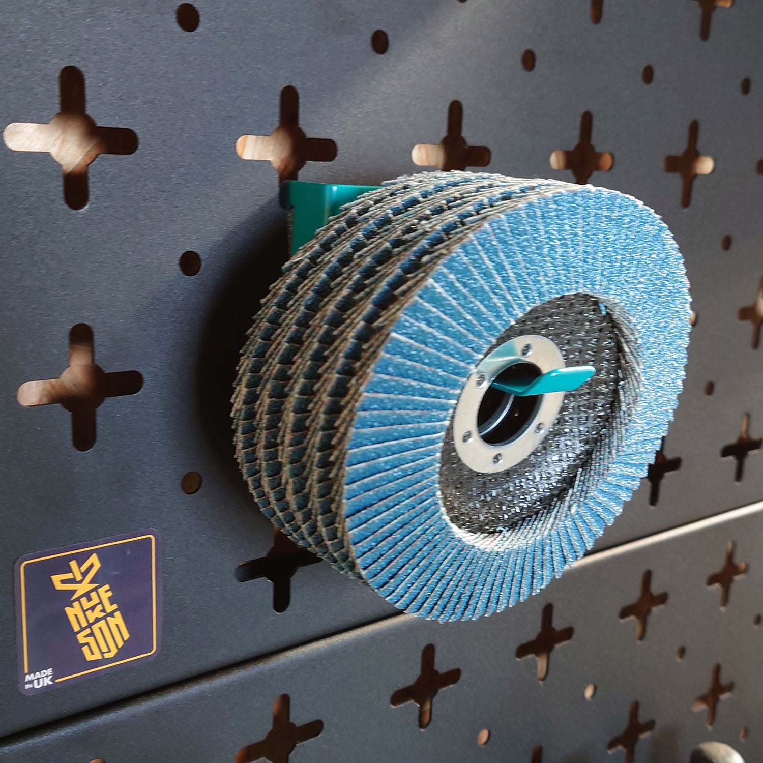 Compatible with our Nukeson Tool Wall Panels, this attachment allows you to store Angle Grinder cut discs and flap discs. It can hold up to 4 standard-size flap discs on a single hook. The hook itself can be multi-purpose too, allowing you to hook on pretty much any tool or supply with a lip suitable for hanging.