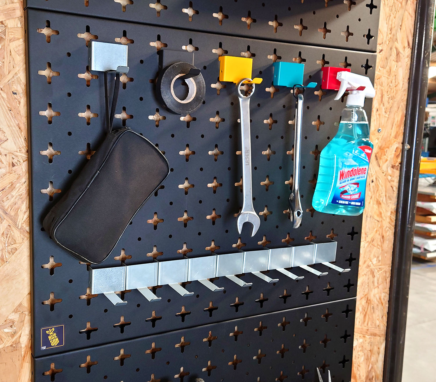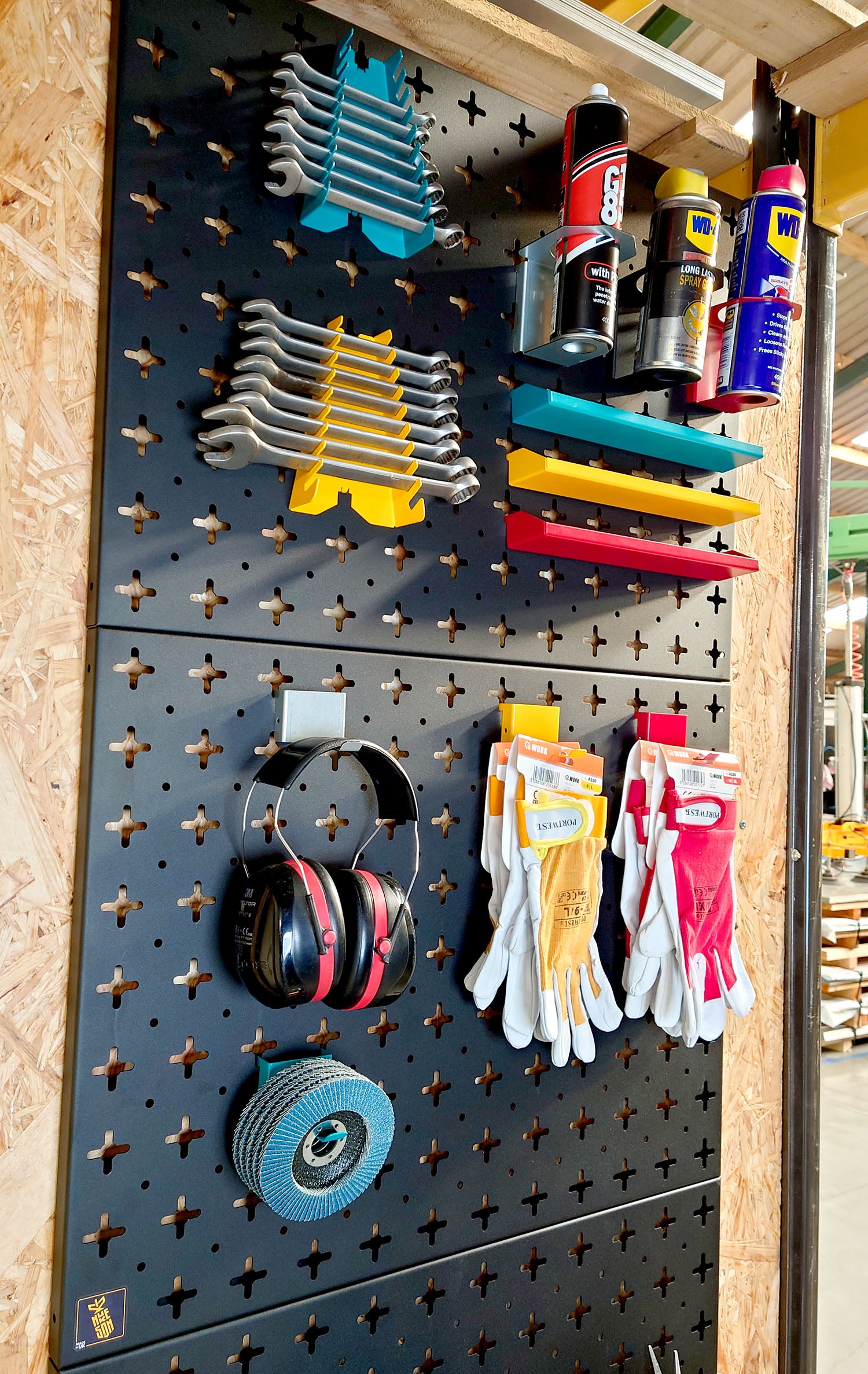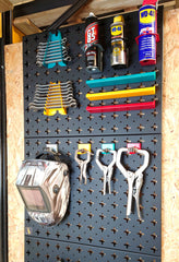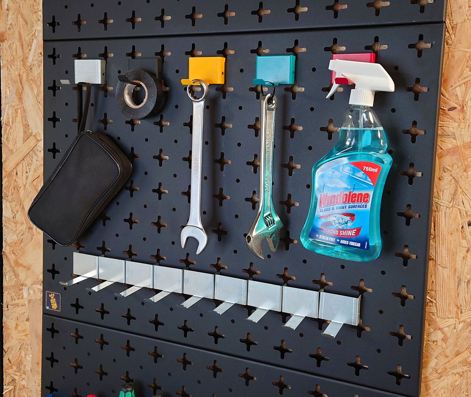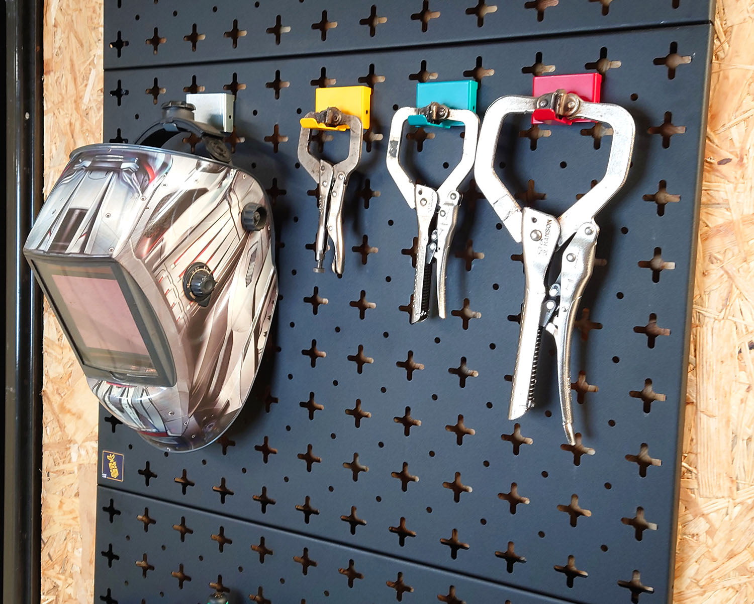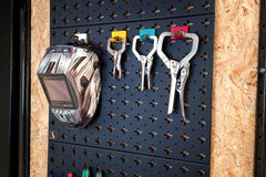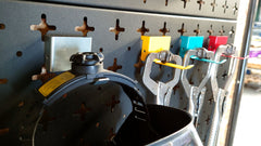 Compatible with our Nukeson Tool Wall Panels, this attachment allows you to store Angle Grinder cut discs and flap discs. It can hold up to 4 standard-size flap discs on a single hook. The hook itself can be multi-purpose too, allowing you to hook on pretty much any tool or supply with a lip suitable for hanging.