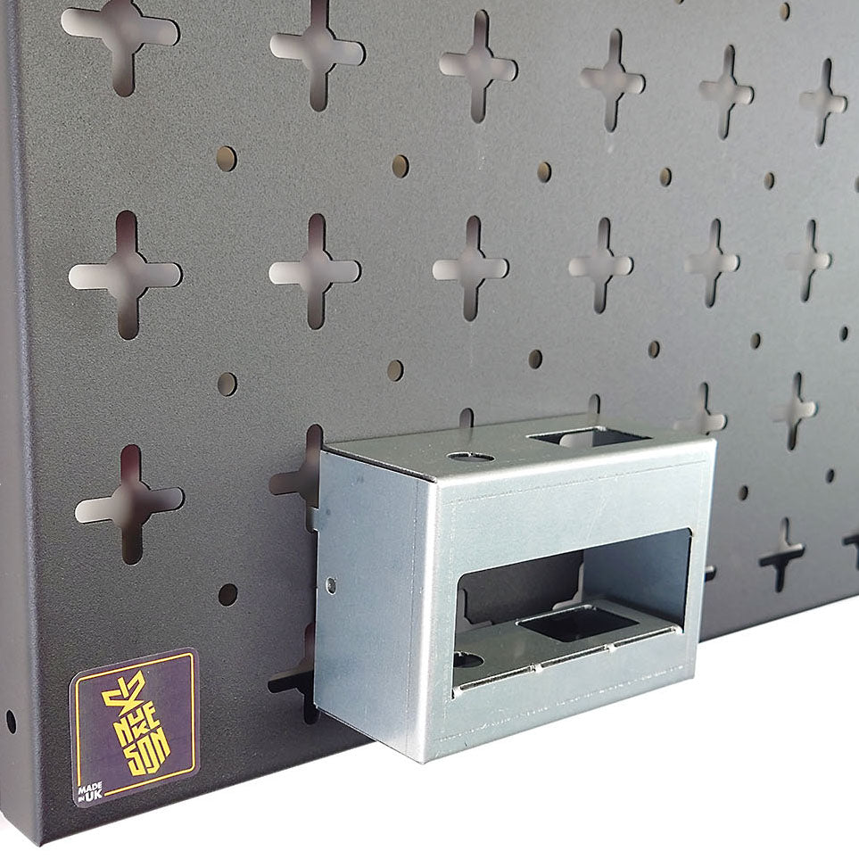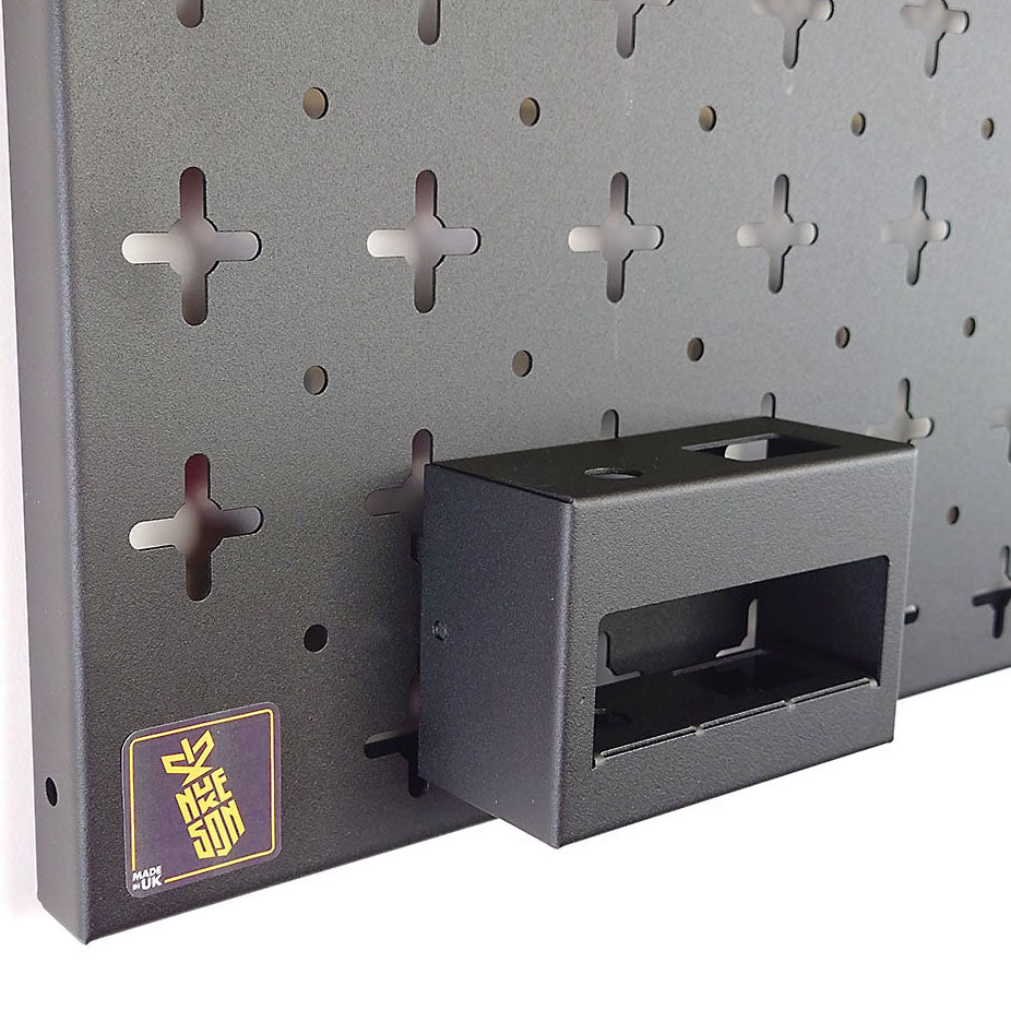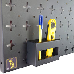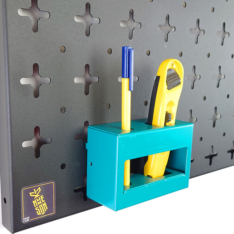 Compatible with our Nukeson Tool Wall Panels, this attachment allows you to store a pen and a box cutter, exactly where you'd need them most. A pen and a box cutter are 2 essentials for anyone working in a warehouse. You'll need to slice the tape open, and then probably write on the box to say exactly what's in there. This bracket provides space for a single pen and a single box cutter/penknife. The additional slots below ensure that the pen and knife do not wobble around and the base plate ensures the items do not simply fall through.