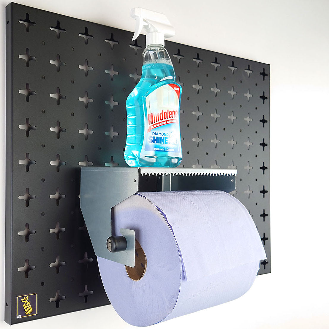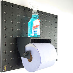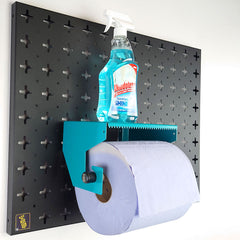 This attachment works great in areas where dirtier jobs are being carried out, allowing you to quickly dispense Blue Roll for cleaning your hands or wiping down areas. The shelf above the Blue Roll can be used to store handy cleaning supplies. A great use for this product is in a factory setting where you can store some Blue Paper Roll and a bottle of multi-purpose cleaning spray. Combine with other cleaning-based attachments on your Nukeson Tool Wall for simple cleaning stations!