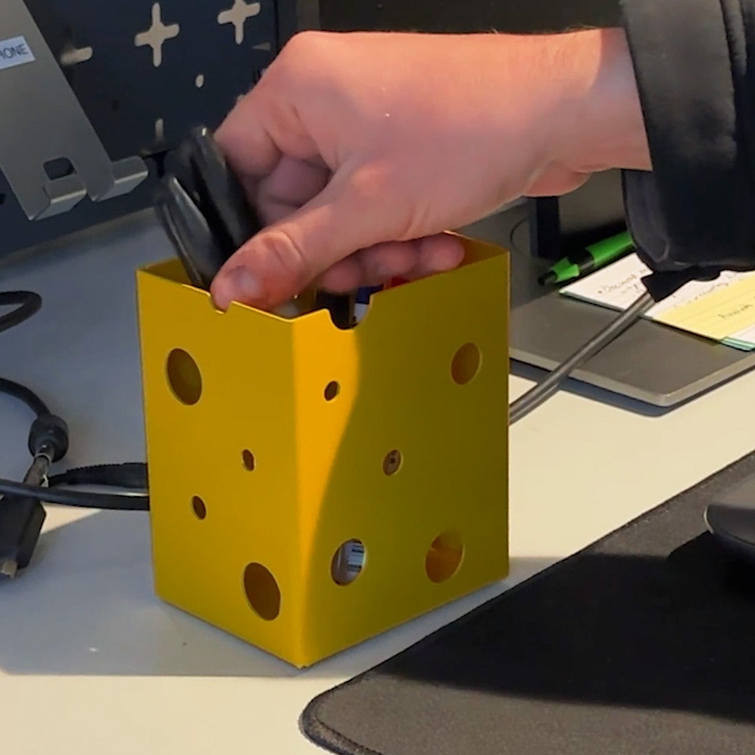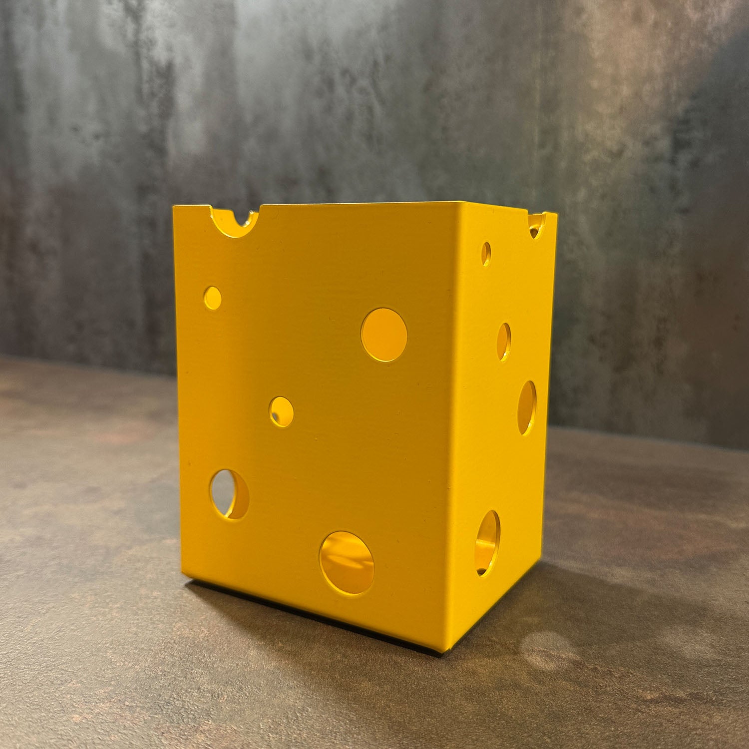 It’s made from durable galvanised steel and finished in a vibrant, cheese-yellow powder coat. The riveted structure adds a satisfying industrial feel, while the circular holes give it that unmistakable cheesy appearance. It’s sturdy enough to sit on your worktop or desk without tipping, and light enough to mount on the wall if you prefer to save space.
