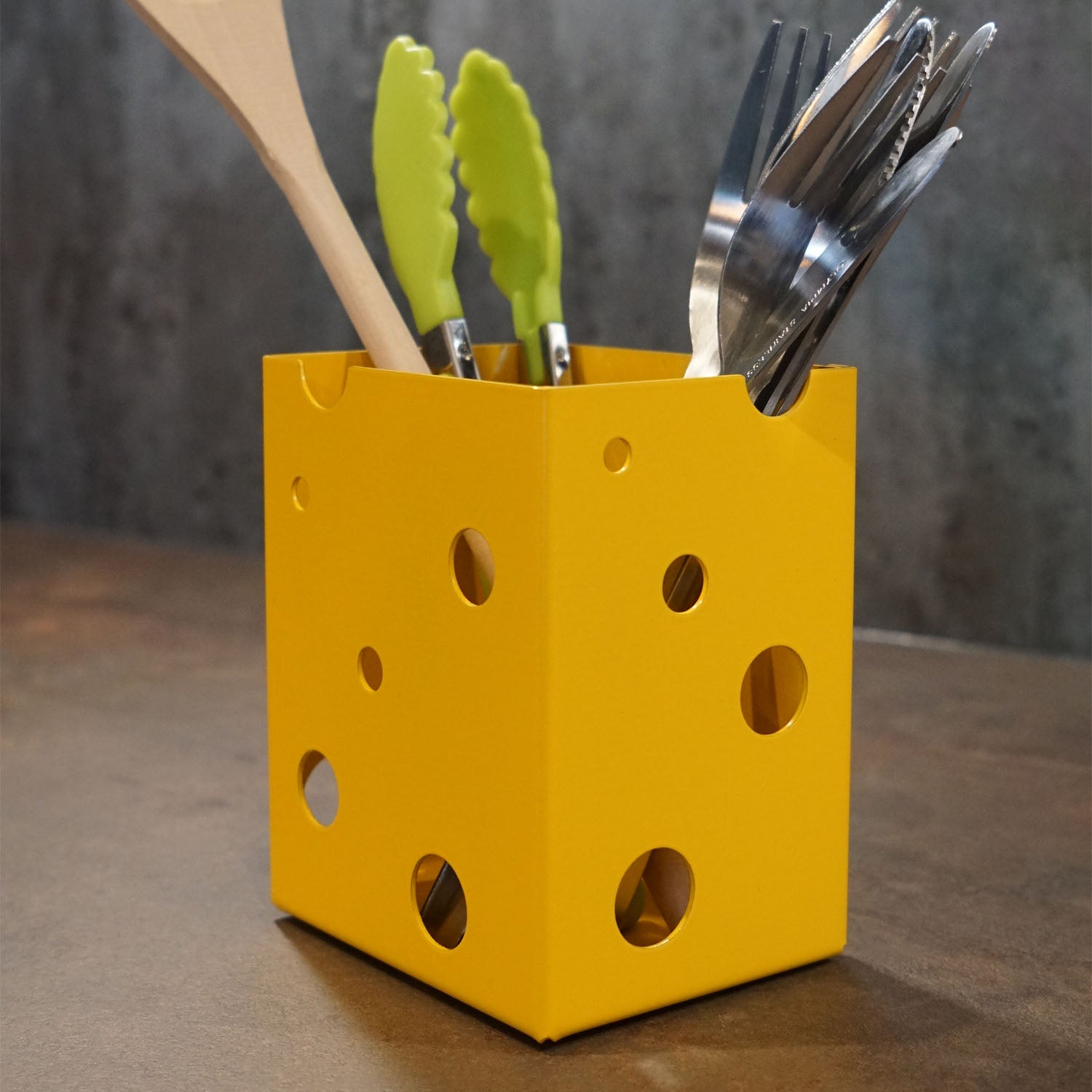 Brighten up your kitchen or workspace with this eye-catching cheese-shaped utensil storage holder from Okunaii. Designed to look like a classic block of Swiss cheese, this compact unit adds a fun twist to everyday organisation. Whether you're storing utensils, cutlery or stationery, this quirky piece is sure to make people smile.