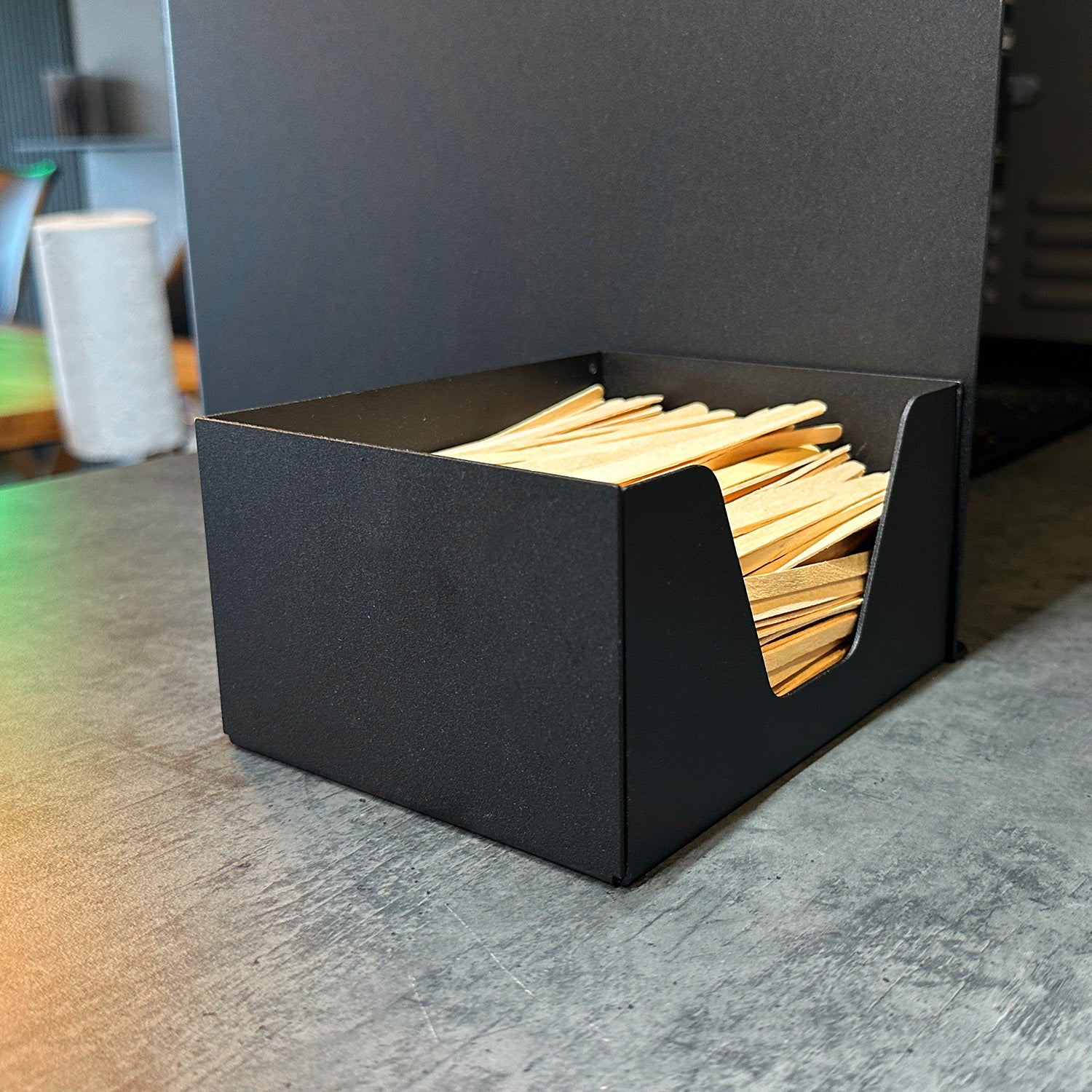 Made in the UK using heavy-duty British steel, this Coffee Stirrer Holder is built to last. It’s powder-coated in your choice of textured black, light grey or icy white – finishes that offer both visual appeal and long-term durability. There’s no assembly required – simply place it on any surface and enjoy hassle-free access to your stir sticks.
