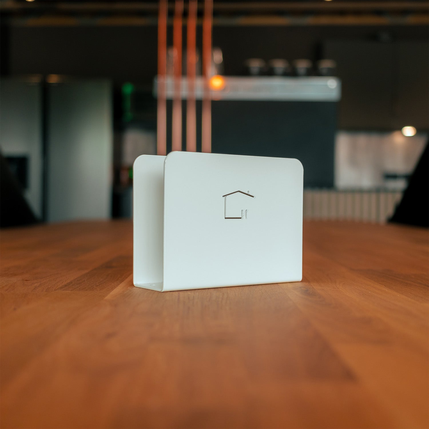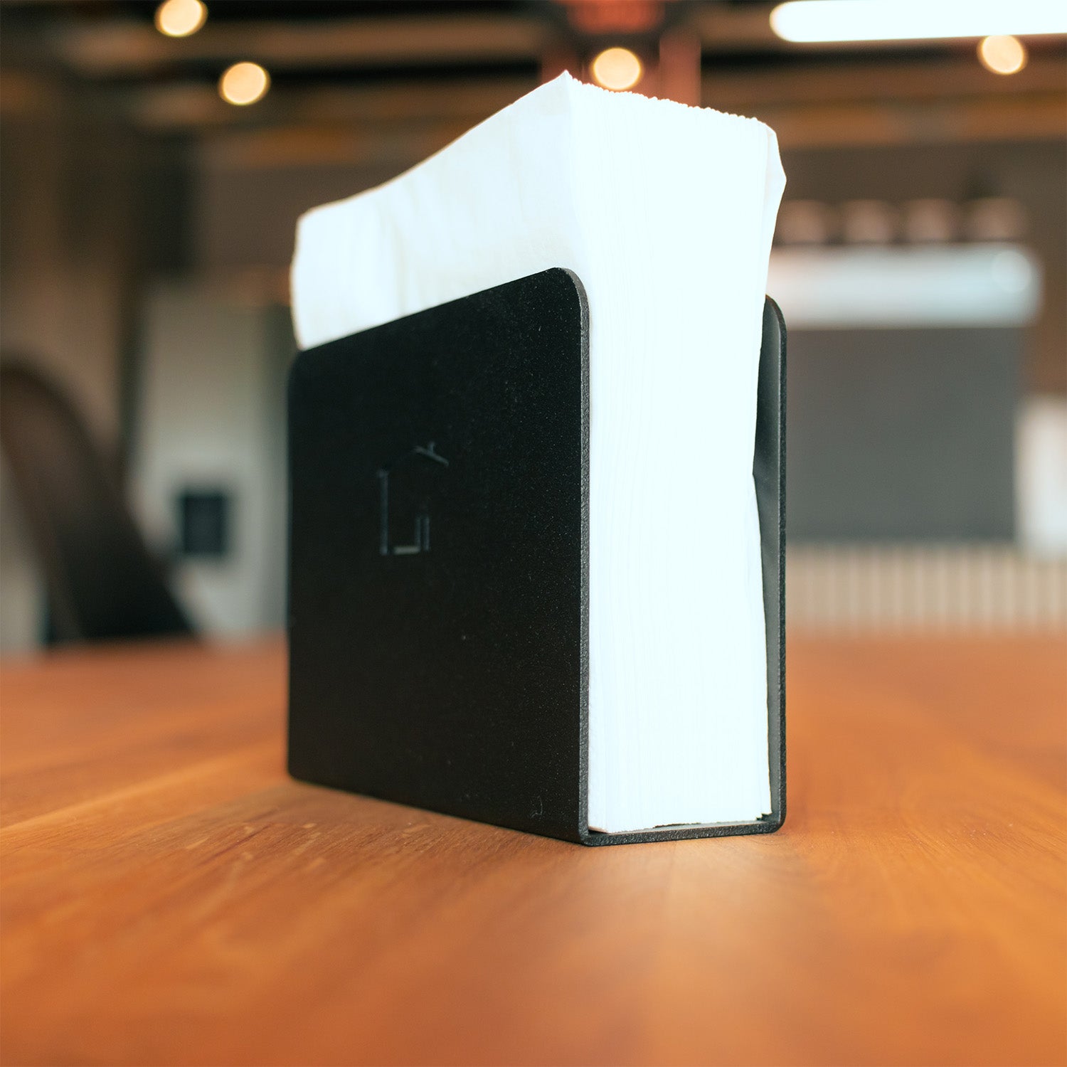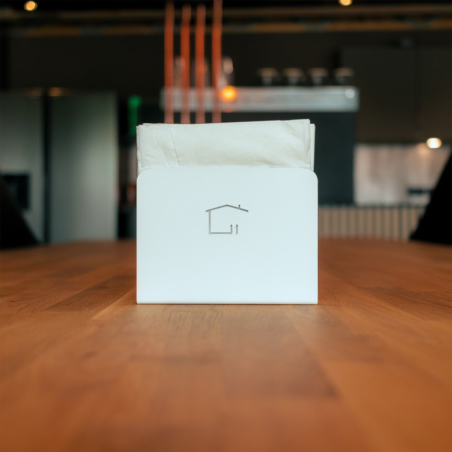 The Napkin Holder manufactured in the United Kingdom using heavy-duty British steel. The unit is finished in a textured black or icy white powder coat that provides a high-quality look and feel. Not only does it look good, that coating provides additional durability. The design features a stylish cutout of the Japanese-inspired Okunaii logo. This adds an extra touch of class to the design.