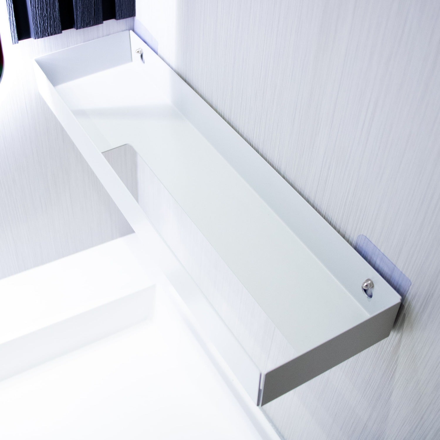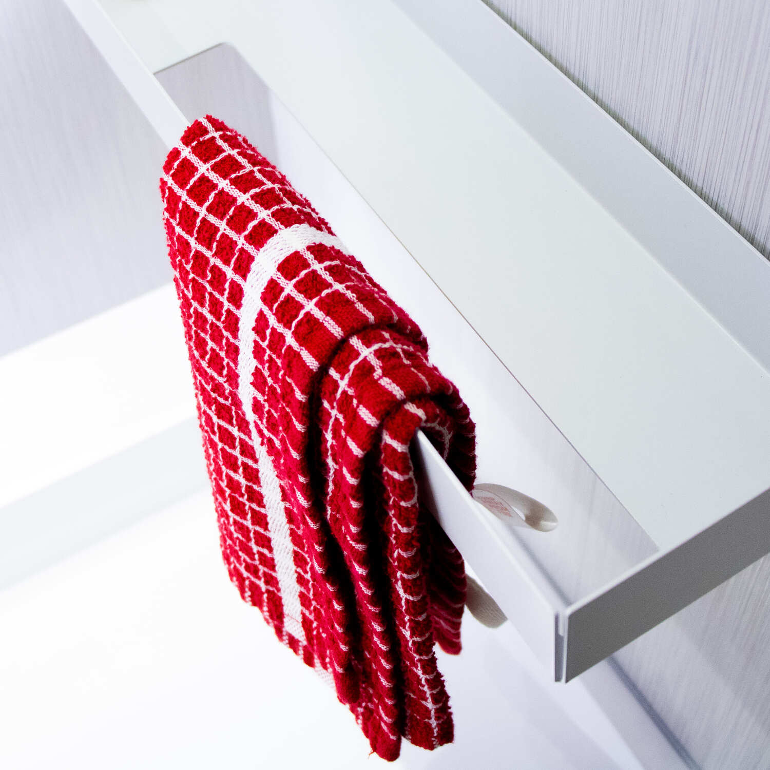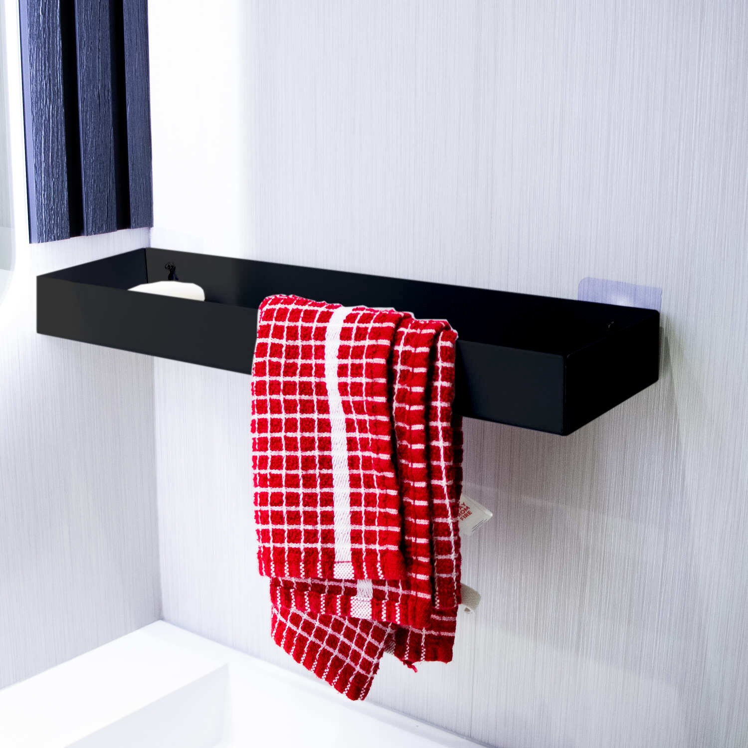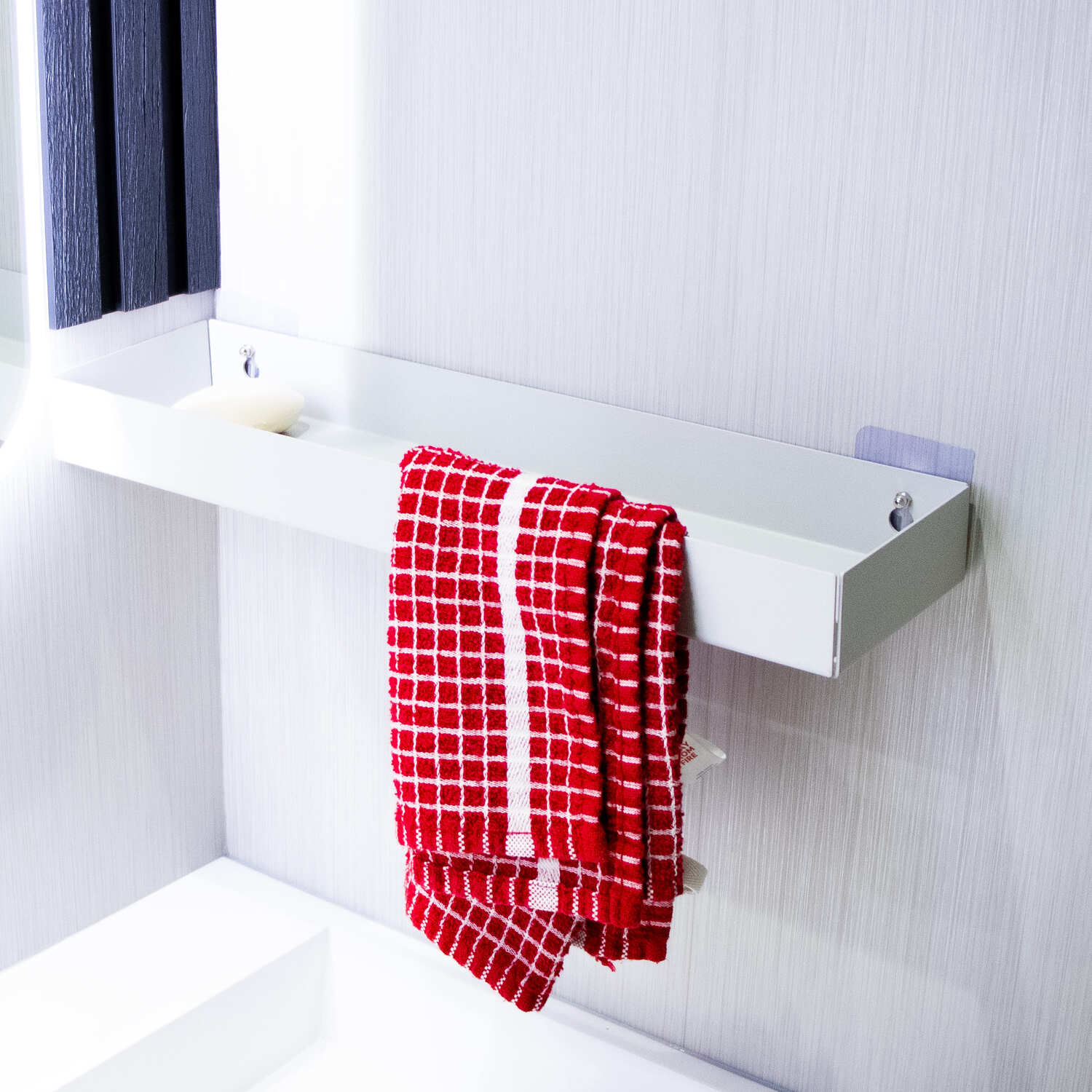 The top tray offers a wide, flat space for items like soap, candles, perfumes or toothbrush holders. Raised sides stop things from slipping, while the clever towel slot at the front allows you to slide a hand towel over the top, with it slotting through a hole on the base of the shelf.. The front lip supports the towel and helps it hang neatly in view.
