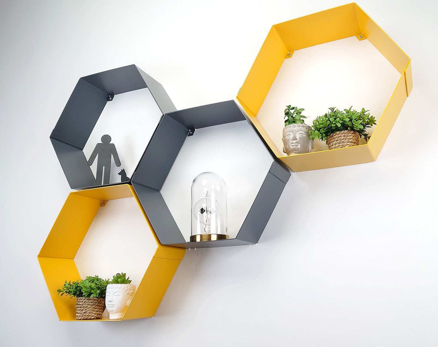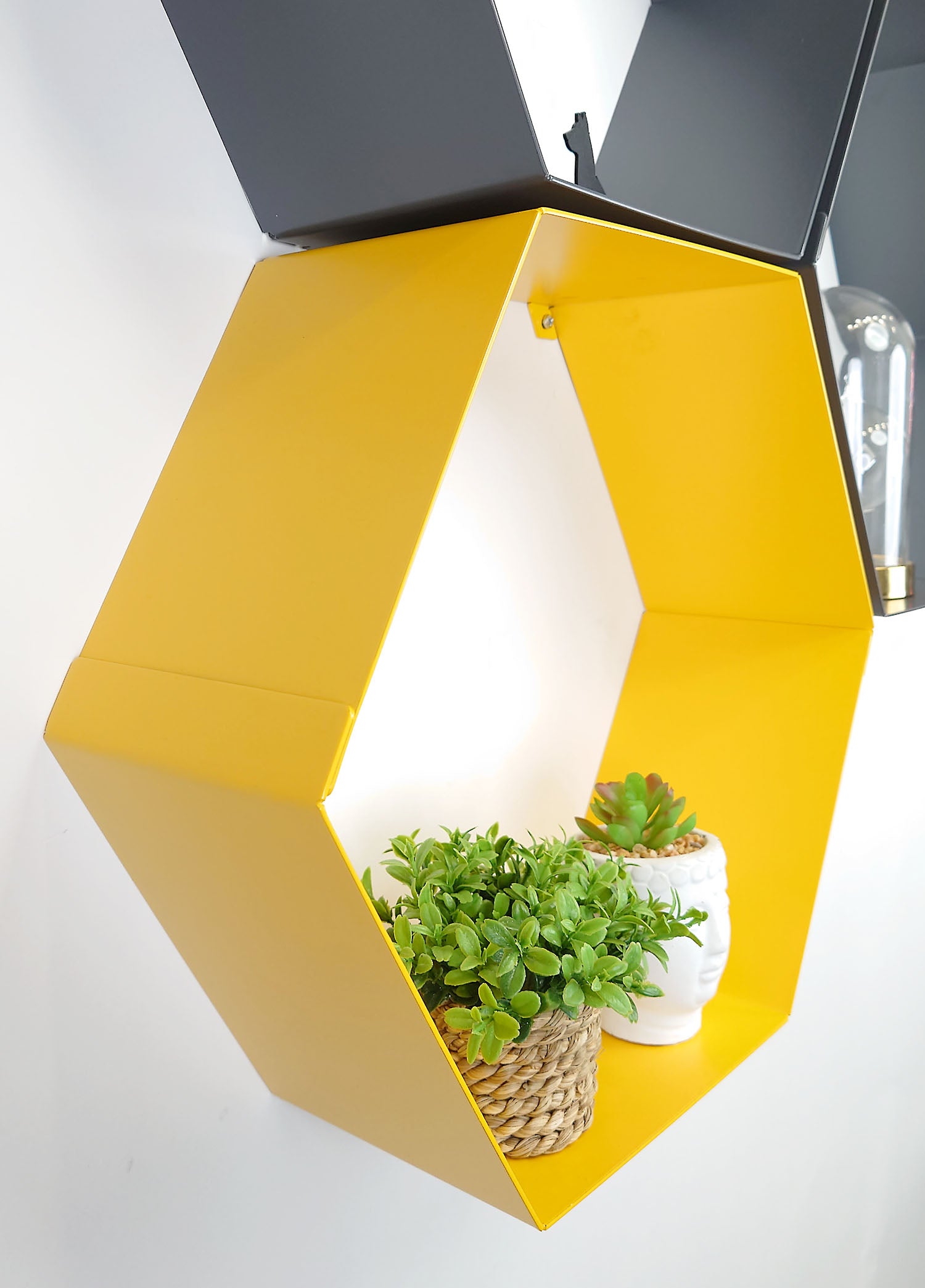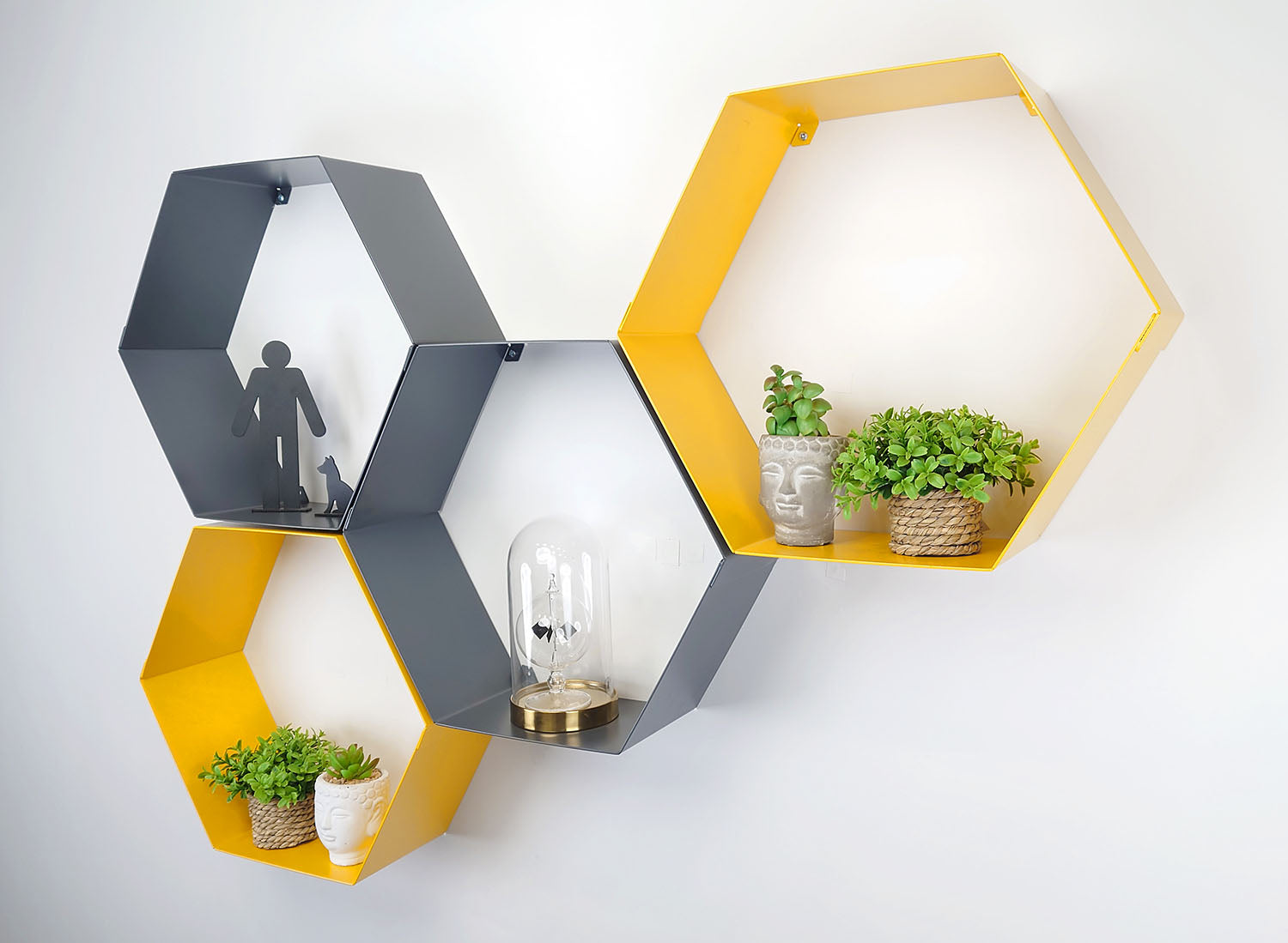 These aesthetically pleasing wall mounted shelves will be right at home in any modern decor. These Hexagonal Shelves comes in a 4-pack, with shelves available in a mustard yellow or anthracite grey. They can be arranged into any honeycomb-style formation to allow for unique setups.