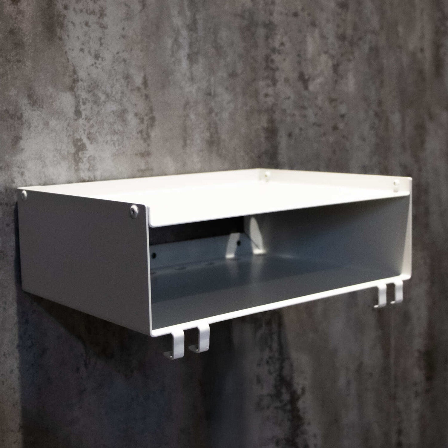 There are four optional hooks along the front edge of the shelf. These are useful for hanging lightweight items like keys, headphones, lanyards or small accessories. The table is made from strong British steel and powder coated in black, grey or white. The finish gives a smooth, easy clean surface that resists marks and blends well with modern interiors. Designed and manufactured in the UK, this bedside table offers a neat, practical storage solution that works well in small and busy spaces.