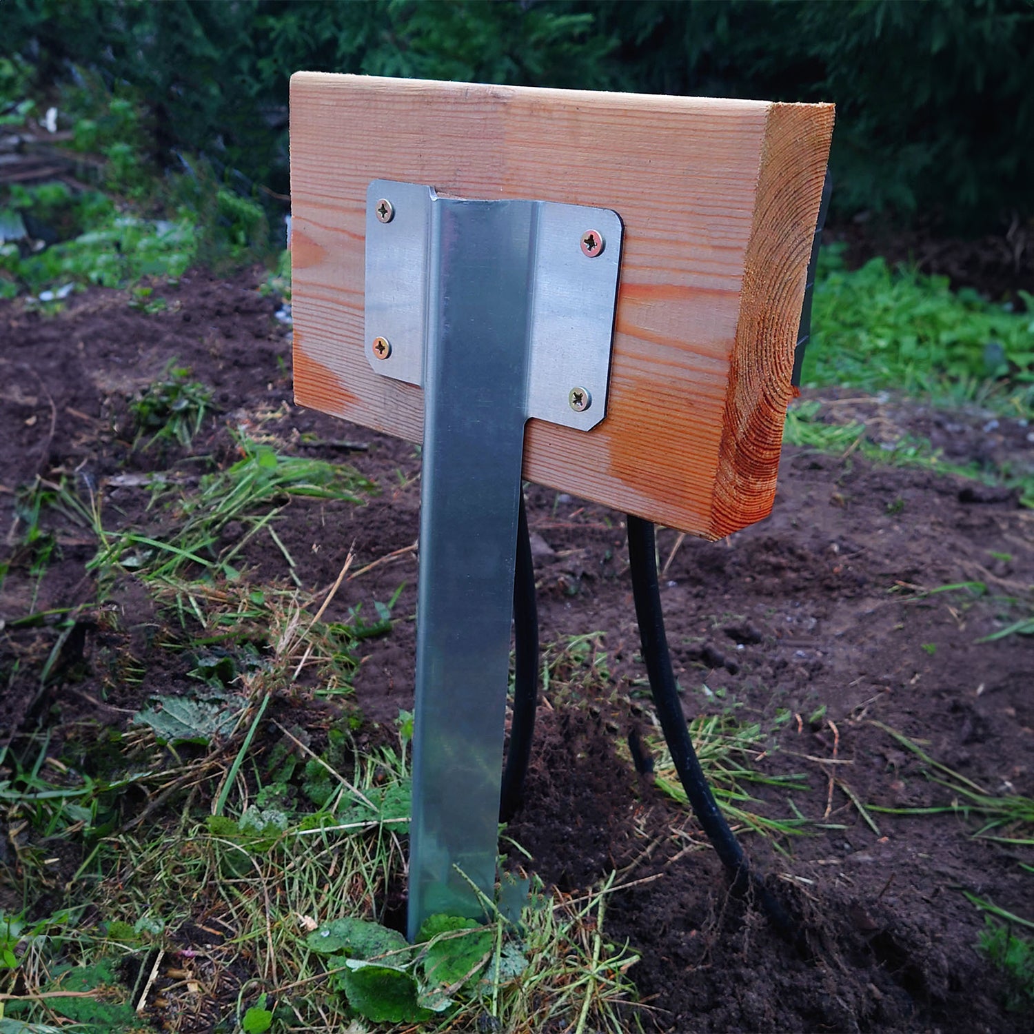 Simply screws a piece of wood, plastic or metal to the stake. Then drive the stake into the ground, using a rubber mallet or a hammer with sacrificial wood, to get a firm ground installation. Make sure you have checked the ground for power cables first. Now you can install the outdoor plug socket onto the piece of wood and stake and you will have successfully mounted an outdoor plug safely off the ground.
